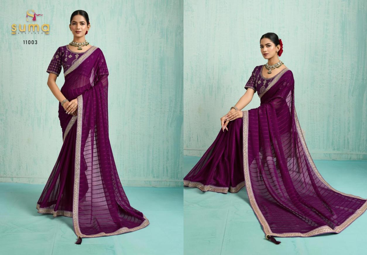 Brand : Suma Catalog Name : Adra Saree Fabric: Chiffon Saree with Zari Sequince border work Blouse Fabric : Banglori Silk With Embroidery Work Rate: 1045/ -+5% Gst Occasion: Festival Wear,Party wear |