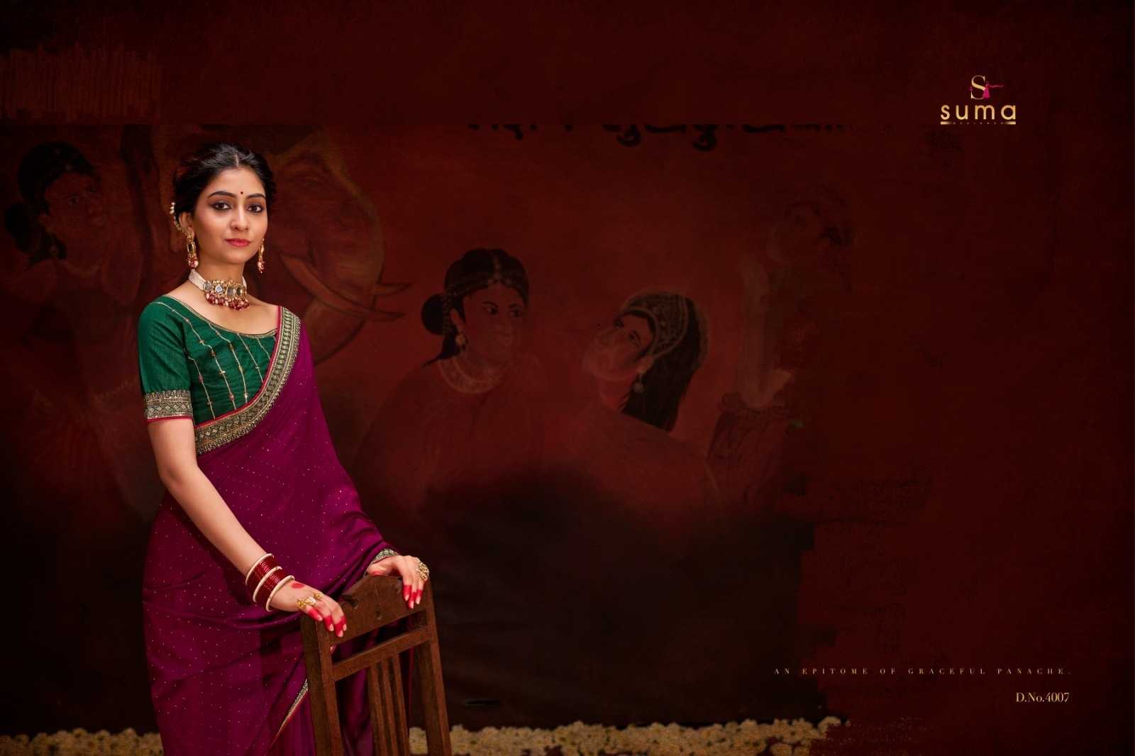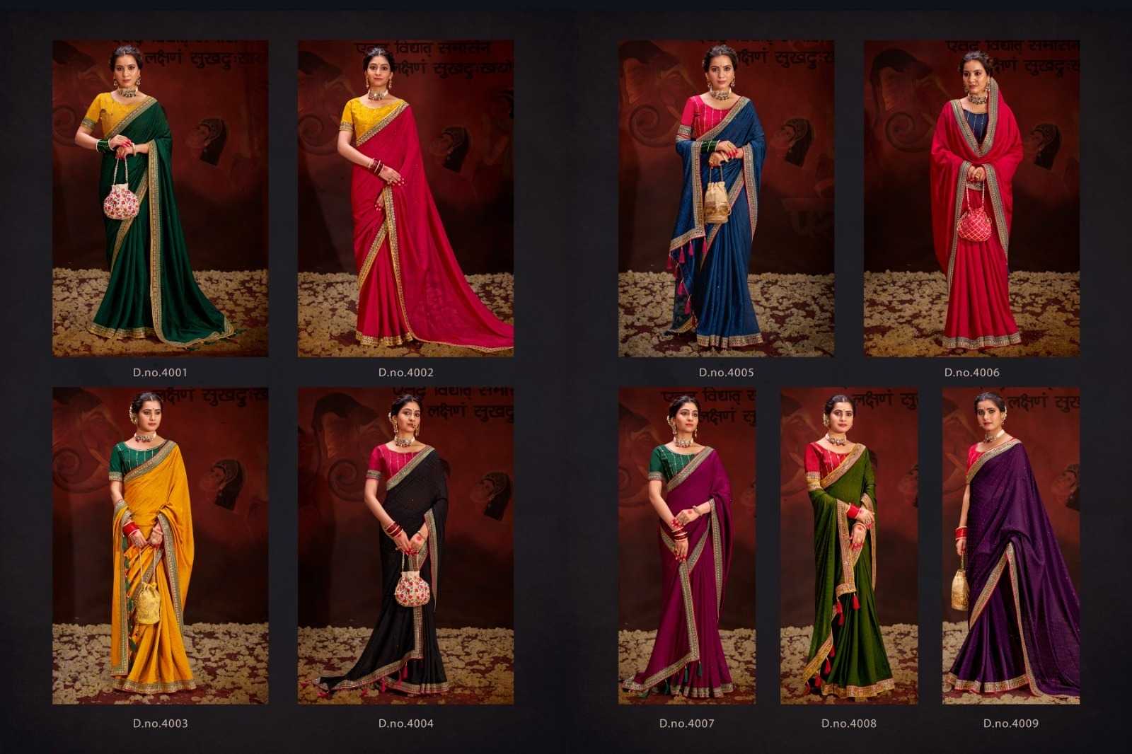 Brand : Suma Catalog Name: Aayushi Series: 4001 To 4009 Saree Fabric: Vichitra Bluming Swarovski Work Saree with Sequence border & adorned with intricate Swarovski crystal work Blouse Fabric : Raw Silk With Work Rate: 1095/-+5% Gst Occasion: Festival Wear |
