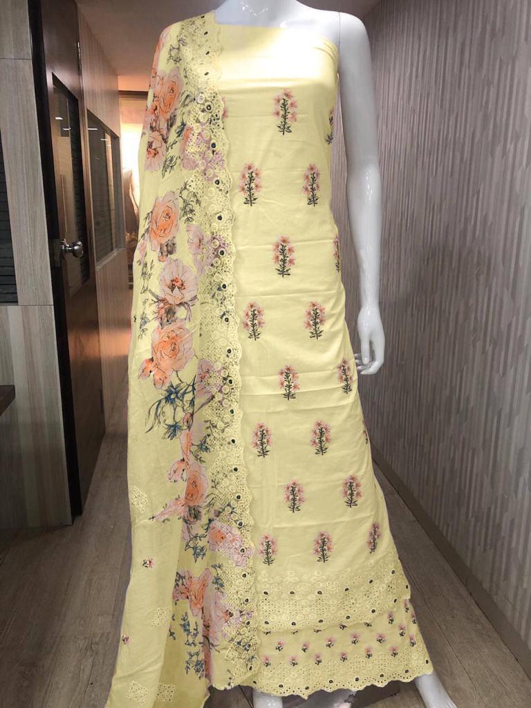 RANGON KI DUNYA NAME:- _SUMMER SUNSHINE V.2 _ COLOUR EDITION PCS:-4 PACKING:-POUCH 4 PCS BUNDLE PACKING FABRIC DETAIL:- TOP FRONT:-PURE LAWN WITH FULL SHIRT EMBROIDERY & SHIFLI + FANCY WORK IN DAMAN BACK:-DYED PLAIN DUPATTA:- _PURE LAWN DIGITAL PRINT WITH BOTH SIDE BORDER EMBROIDERY _ BOTTOM:- *EMBROIDERY + SHIFLI + FANCY HANDWORK * RATE:-1099/- + GST SUPER NET *LIMITED STOCK ONLY ON PRIOR BOOKING * |