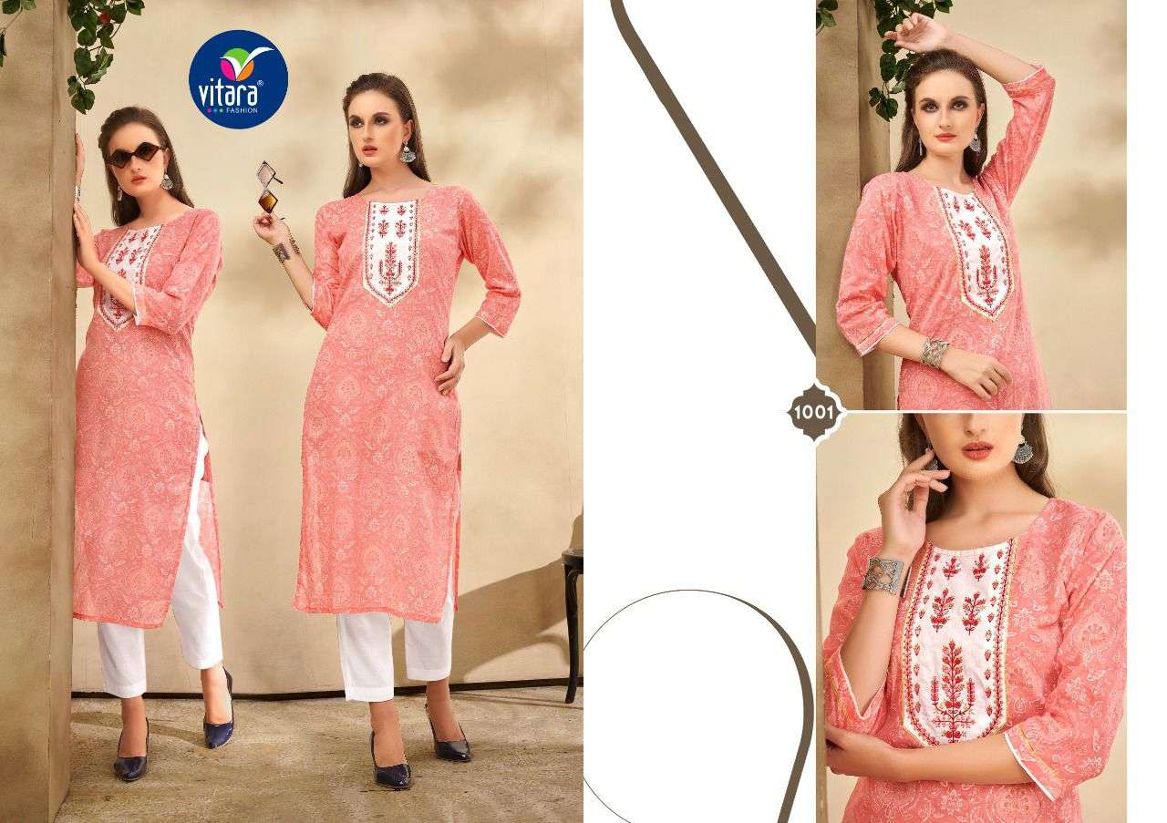 vitara fashion  launches exclusive designer  kurti with pent       Catalogue name-  SUNSHINE        fabric pure mul mul foil print astar / lining - cotton fabric pent - pure cotton fabric size-m(38),L(40),xl(42),xxl(44)   Length TOP - *48 * Designs- 5 Rate:- 799/- per pcs Set to set GST +5% ADD ON BILL AMT |