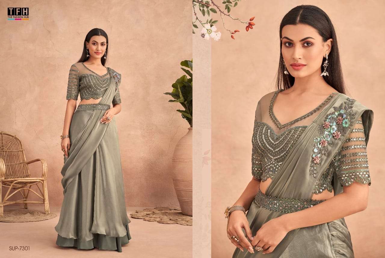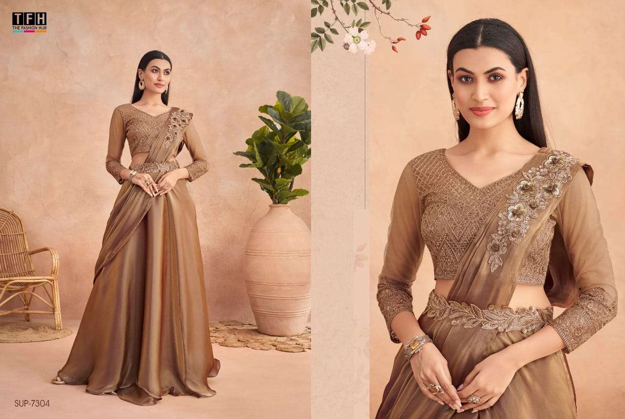 BRAND : TFH CATALOG : SUPER STAR (7300 SERIES) PRICE :- ATTACHED/- 5% GST EXTRA FABRIC -: FANCY SAREE WITH BELT SAREE STYLE - READY TO WEAR WITH BELT |