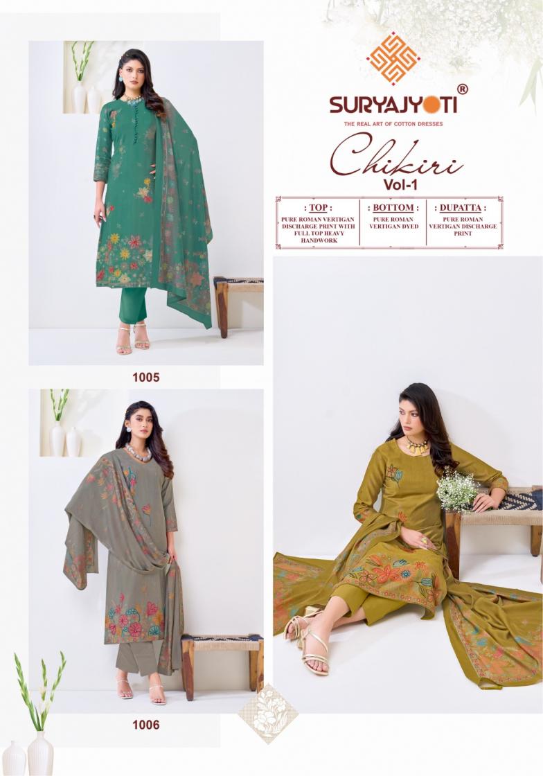 👫DEAR CUSTOMER👫 🙏WELCOME TO SURYAJYOTI 😍 LAUNCHING OF SURYAJYOTI NEW FANCY PRINT CATALOG 📕CATALOGUE:- CHIKIRI VOL-1 👚TOP:- PURE ROMAN VERTIGAN DISCHARGE PRINT WITH FULL TOP HANDWORK 👖BOTTON:- ROMAN VERTIGAN DYED 🧣DUPATTA:- PURE MODAL SILK DISCHARGE PRINT CUT:- 👚2.5-👖2.5-🧣2.25 💸RATE:- 811/- +GST 🧳PACKING:- EXCLUSIVE POUCH WITH BAG PACK