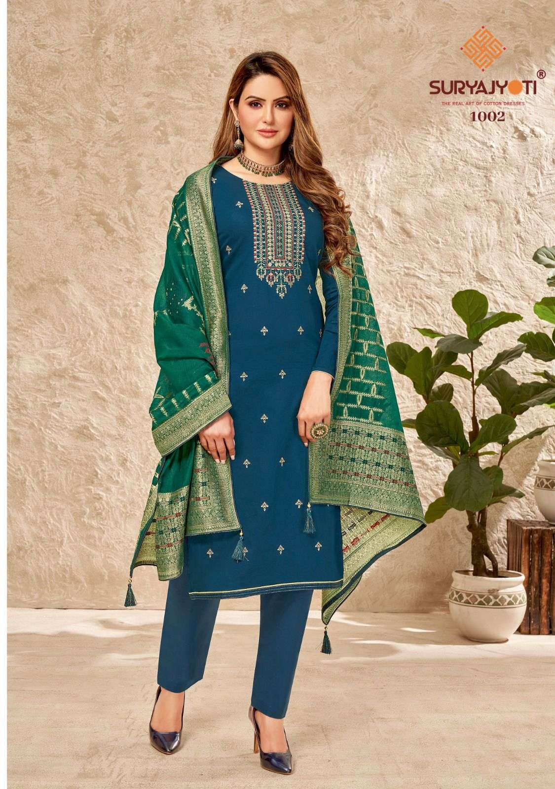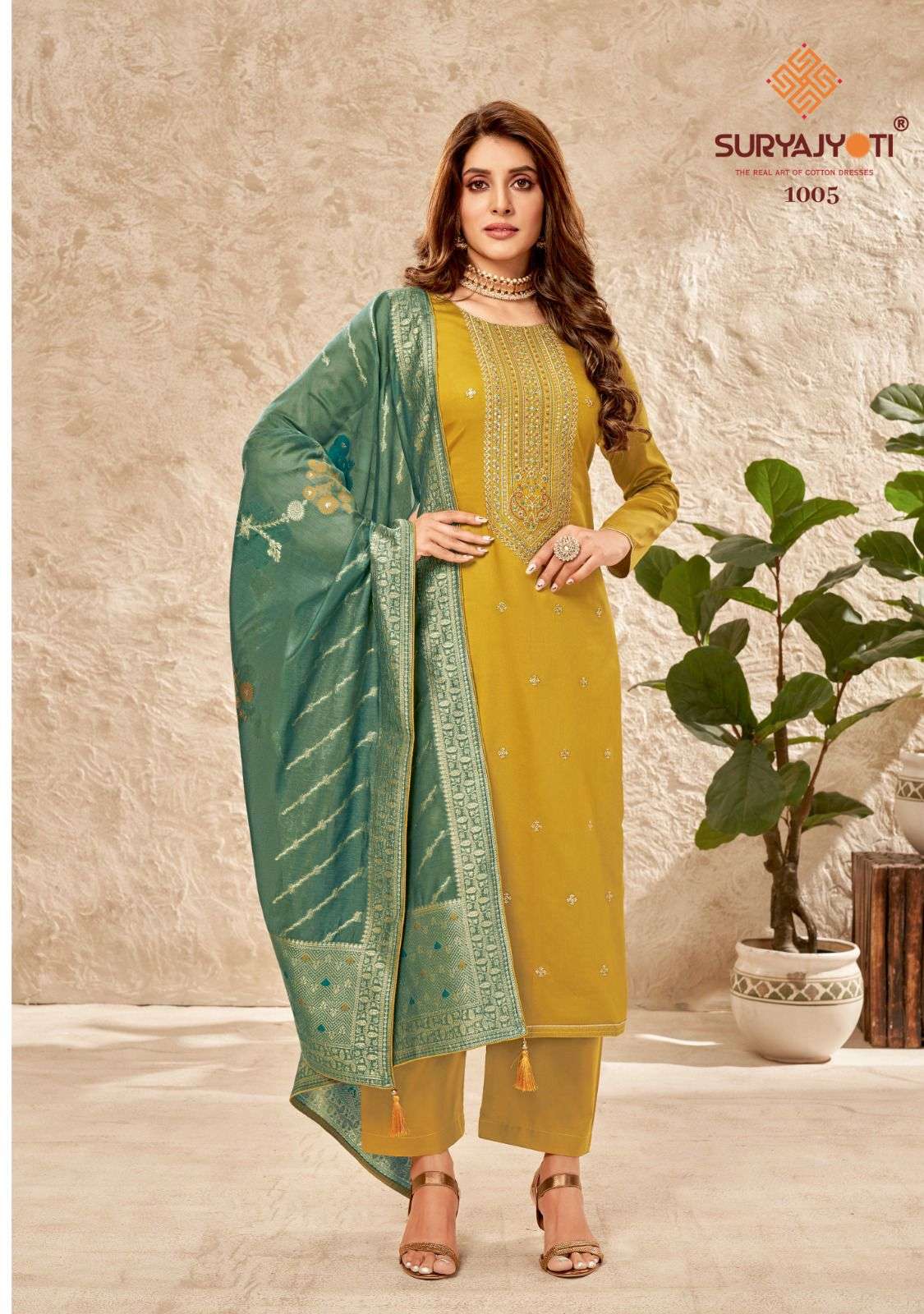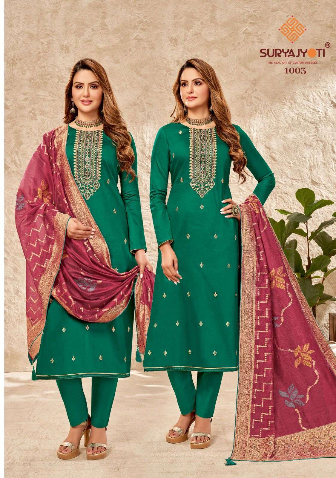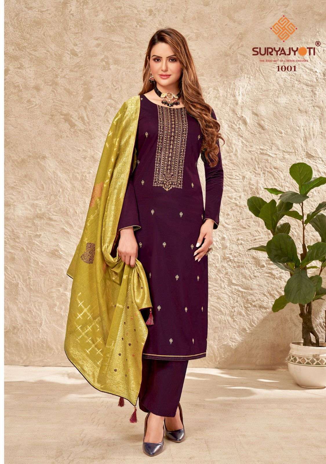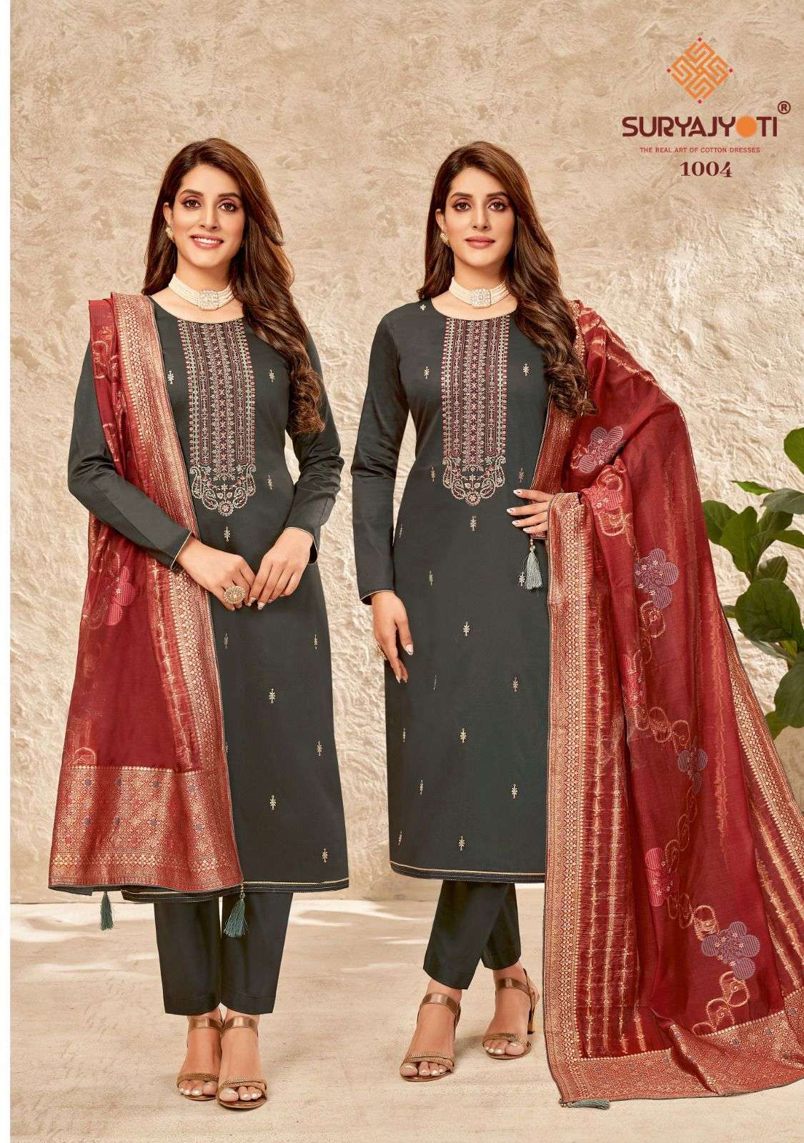 DEAR CUSTOMER, WELCOME TO SURYAJYOTI LAUNCHING OF SURYAJYOTI 'S NEW CATALOG 📕CATALOGUE:- GUZARISH VOL-1 👗CLOTH:- JAAM SATIN WITH NECK EMBRODIERY & SEQUENCE WORK 🧣DUPATTA:- FANCY JACQUARD DUPATTA WITH FOUR SIDE PIPING LACE & TESSELS 👖BOTTOM:- COTTON SOLID CUT:- 2.50-2.50-2.25 RATE:- 855 /- ONLY PACKING:- EXCLUSIVE POUCH PACK WITH BAG🧳 |