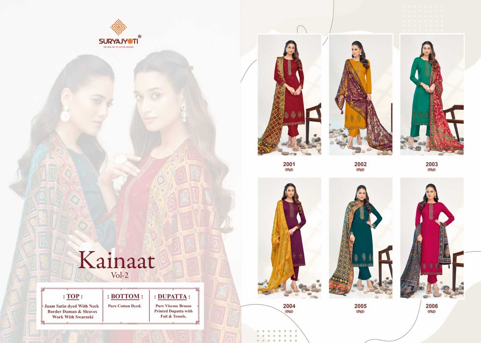 DEAR CUSTOMER, WELCOME TO SURYAJYOTI LAUNCHING OF SURYAJYOTI'S NEW EXCLUSIVE FANCY CATALOG 📕CATALOGUE:- KAINAAT VOL-2 👗CLOTH:- JAM SATIN DYED WITH NECK BORDER DAMAN & SLEEVES WORK WITH SWAROSKI 🧣DUPATTA:- PURE VISCOSE BRASO DUPATTA WITH FOIL & TESSELS 👖BOTTOM:- PURE COTTON CUT:- 2.50-2.50-2.25 RATE:- 1055/- PACKING:- EXCLUSIVE POUCH PACK WITH BAG🧳 |