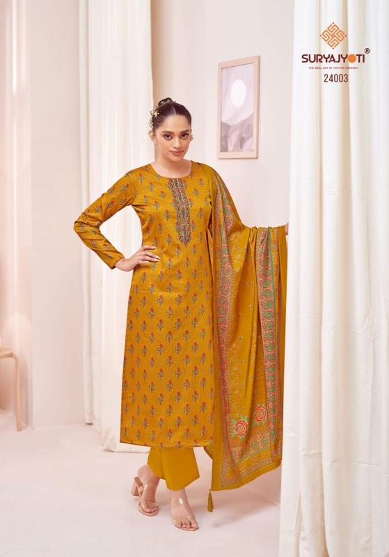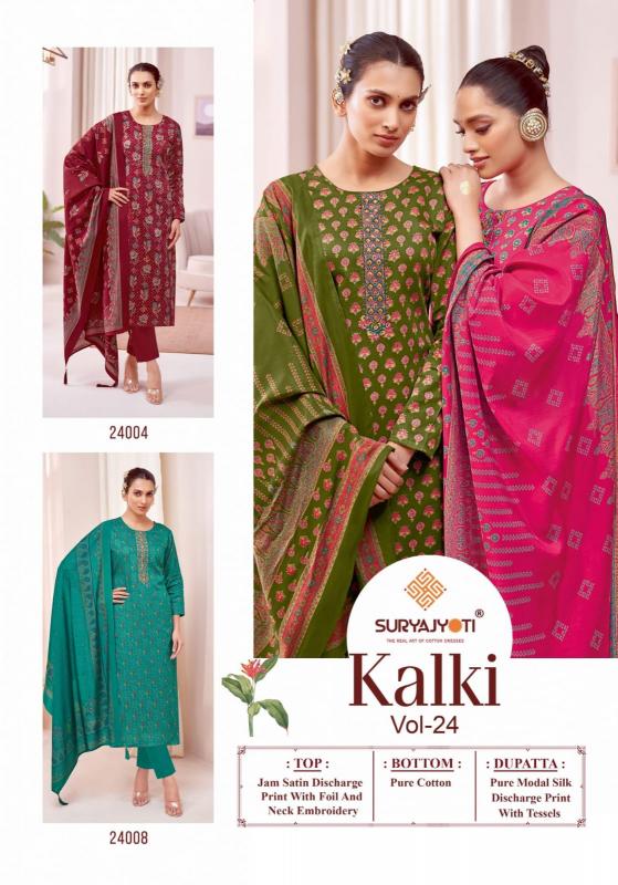 DEAR CUSTOMER WELCOME TO SURYAJYOTI LAUNCHING OF SURYAJYOTI’S NEW FANCY PRINT CATALOG 📕CATALOGUE- KALKI VOL-24 👚TOP- JAAM SATIN DISCHARGE PRINT WITH FOIL AND NECK EMBROIDERY 👖BOTTOM- PURE COTTON 🧣DUPATTA- PURE MODAL SILK DISCHARGE PRINT WITH TESSELS CUT- 2.50-2.50–2.25 RATE- 761/- PACKING- EXCLUSIVE POUCH PACK WITH BAG🧳 |