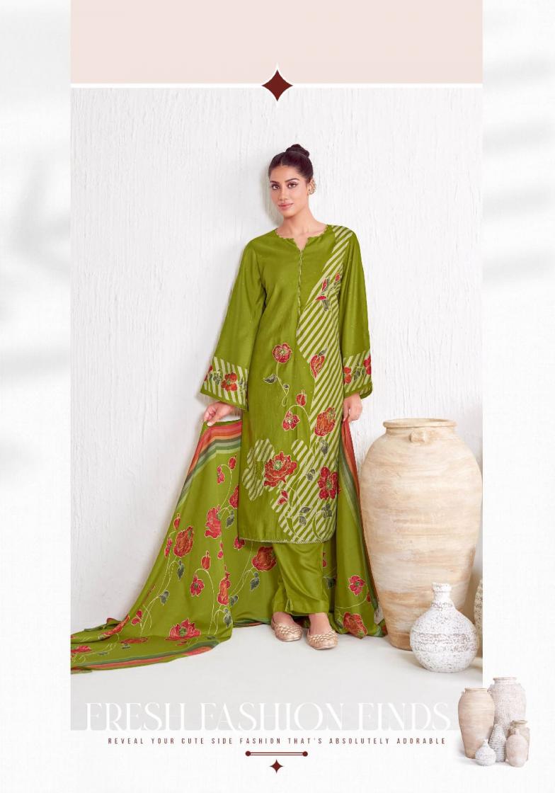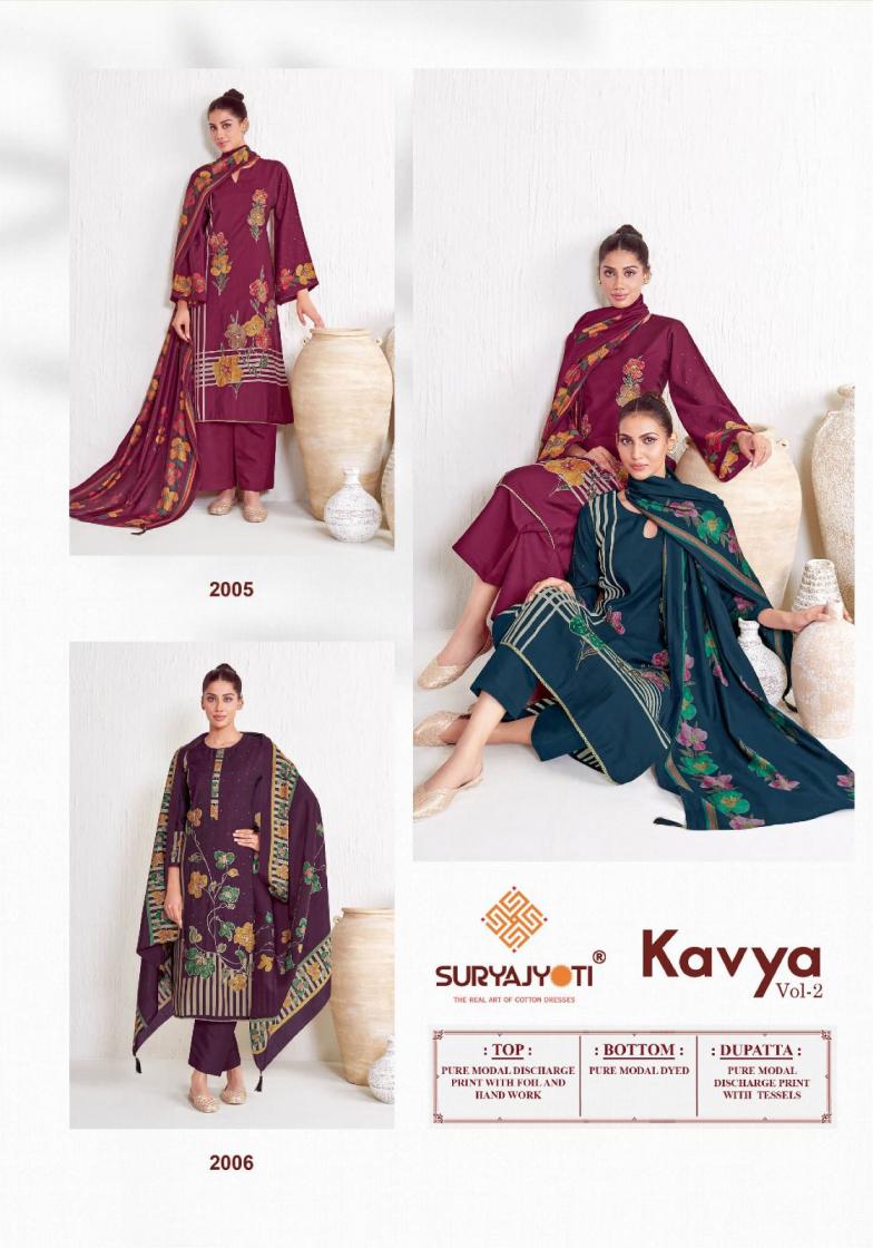 👫DEAR CUSTOMER👫 🙏WELCOME TO SURYAJYOTI 😍LAUNCHING OF SURYAJYOTI’S NEW FANCY CATALOG 📗CATALOGUE:- KAVYA VOL-2 👗TOP:- PURE MODAL DISCHARGE PRINT WITH FOIL N HAND WORK 👖BOTTOM:- PURE MODAL DYED 🧣DUPATTA:- PURE MODAL DISCHARGE PRINT WITH TESSELS CUT:- 👚2.50-👖2.50-🧣2.25 💸RATE:- 825/- 💼PACKING:- EXCLUSIVE POUCH PACK WITH BAG |
