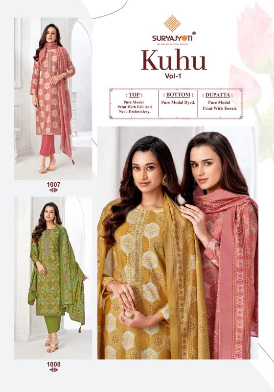 DEAR CUSTOMER WELCOME TO SURYAJYOTI LAUNCHING OF SURYAJYOTI’S NEW FANCY CATALOG 📕CATALOGUE:- KUHU VOL-1 👗TOP:- PURE MODAL DISCHARGE PRINT WITH FOIL N NECK EMBROIDERY 👖BOTTOM:- PURE MODAL DYED 🧣DUPATTA:- PURE MODAL PRINT WITH TESSELS CUT:- 2.50-2.50-2.25 RATE:- 780/- PACKING:- EXCLUSIVE POUCH PACK WITH BAG🧰 |