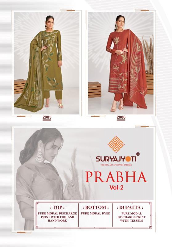 DEAR CUSTOMER WELCOME TO SURYAJYOTI LAUNCHING OF SURYAJYOTI’S NEW FANCY CATALOG 📕CATALOGUE:- PRABHA VOL-2 👗TOP:- PURE MODAL DISCHARGE PRINT WITH FOIL N HAND WORK 👖BOTTOM:- PURE MODAL DYED 🧣DUPATTA:- PURE MODAL DISCHARGE PRINT WITH TESSELS CUT:- 2.50-2.50-2.25 RATE:- 830/- PACKING:- EXCLUSIVE POUCH PACK WITH BAG🧰 |