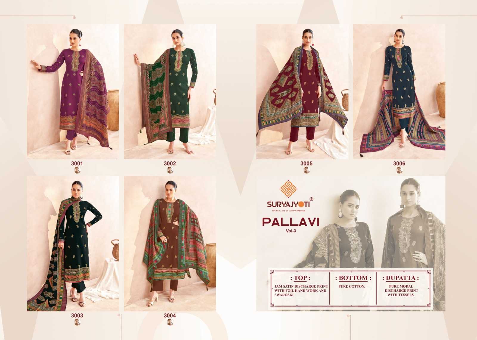 DEAR CUSTOMER WELCOME TO SURYAJYOTI LAUNCHING OF SURYAJYOTI’S NEW FANCY CATALOG 📕CATALOGUE- PALLAVI VOL-3 👚TOP- JAAM SATIN DISCHARGE PRINT WITH FOIL,HANDWORK AND SWAROVSKI 👖BOTTOM- PURE COTTON 🧣DUPATTA- PURE MODAL SILK DISCHARGE PRINT WITH TESSELS CUT- 2.50-2.50–2.25 RATE- 790/- PACKING- EXCLUSIVE POUCH PACK WITH BAG🧳 |