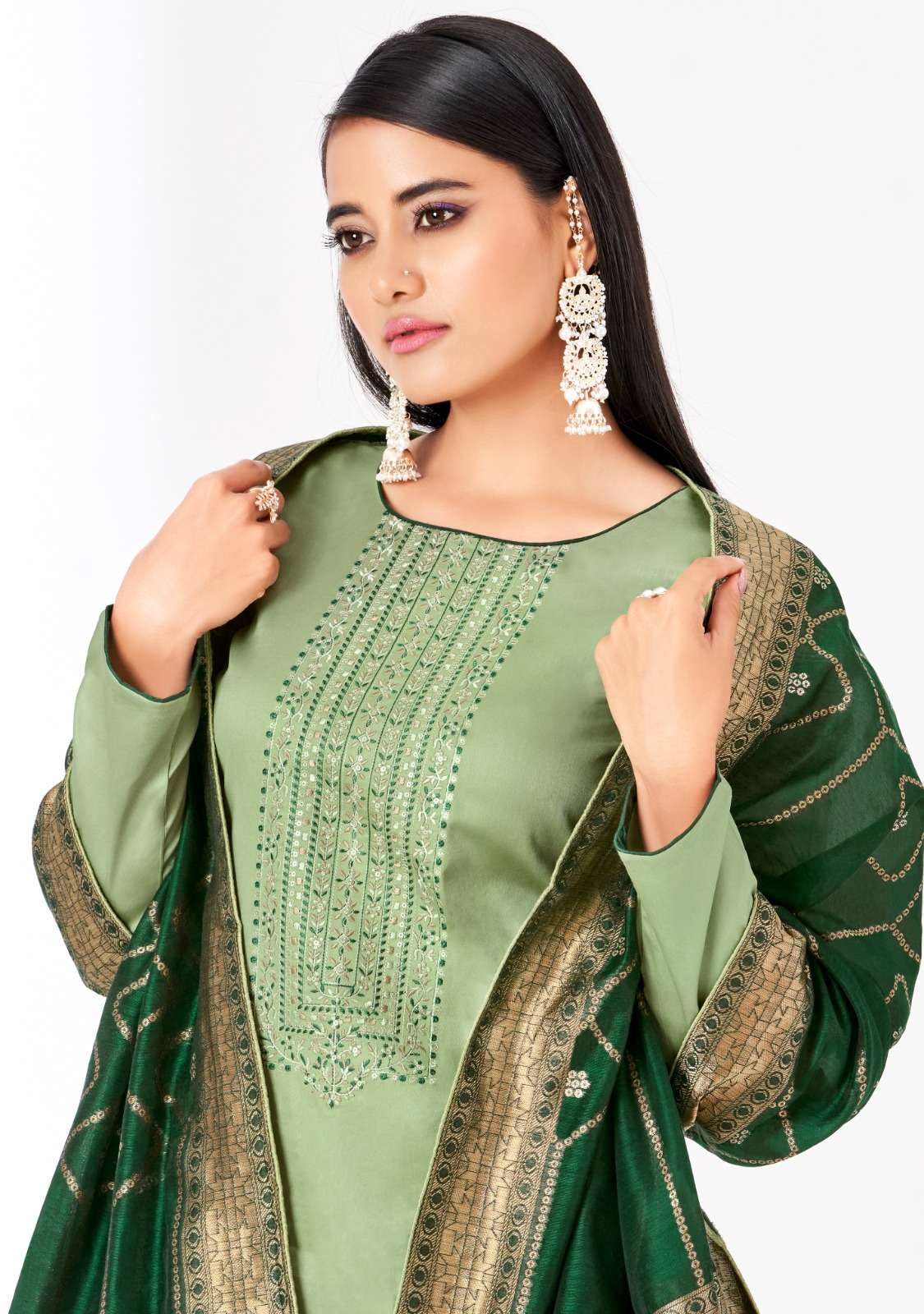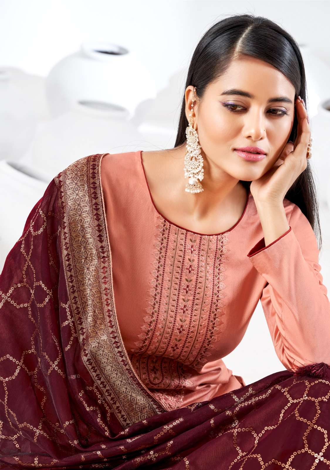 DEAR CUSTOMER, WELCOME TO SURYAJYOTI LAUNCHING OF SURYAJYOTI 'S NEW CATALOG 📕CATALOGUE:- KALPI VOL-1 👗CLOTH:- JAAM SATIN WITH NECK AND BORDER EMBRODIERY 🧣DUPATTA:- FANCY JACQUARD DUPATTA WITH FOUR SIDE PIPING LACE & TESSELS 👖BOTTOM:- COTTON SOLID CUT:- 2.50-2.50-2.25 RATE:- 825/- ONLY PACKING:- EXCLUSIVE POUCH PACK WITH BAG🧳 |