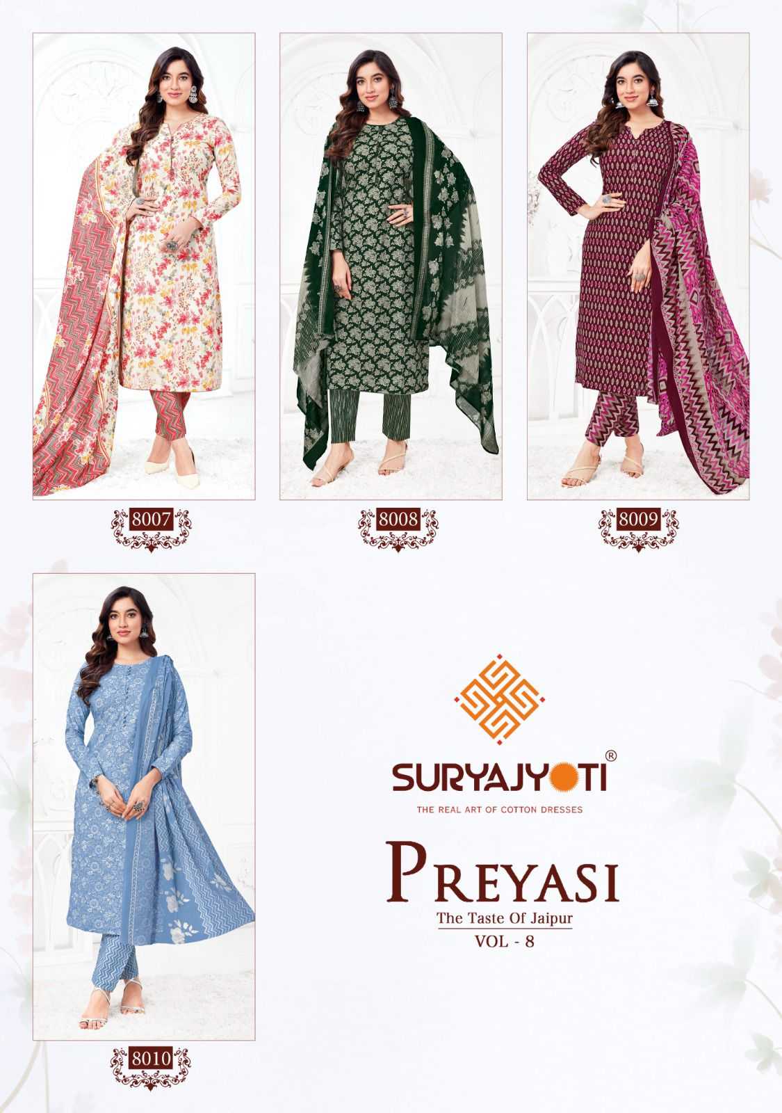 DEAR CUSTOMER WELCOME TO SURYAJYOTI LAUNCHING OF SURYAJYOTI'S NEW JAIPURI PRINT CATALOG 📕CATALOGUE:- PREYASI VOL-8 FABRIC💃🏻 🧣DUPATTA:- COTTON 👖BOTTOM:- COTTON CUT:- 2.50-2.0-2.25 RATE:- 490/- PACKING:- EXCLUSIVE POUCH WITH BAG PACK |