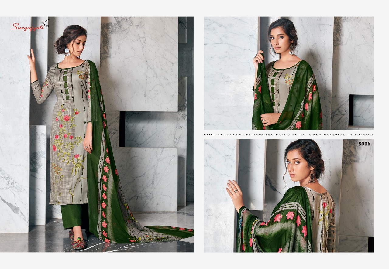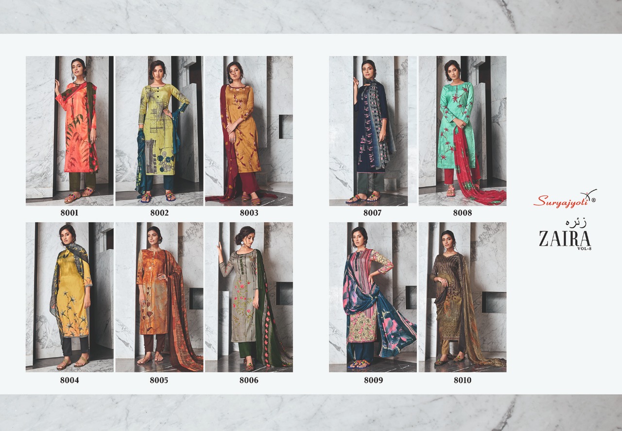 Suryajyoti Zaira Vol 8 Zam Satin Ladies Printed Suits Wholesaler In Surat