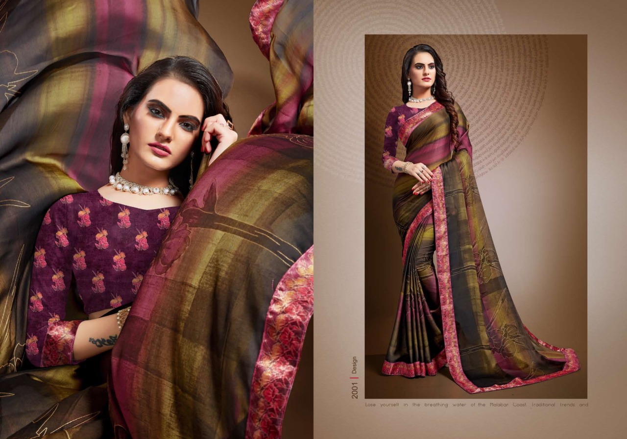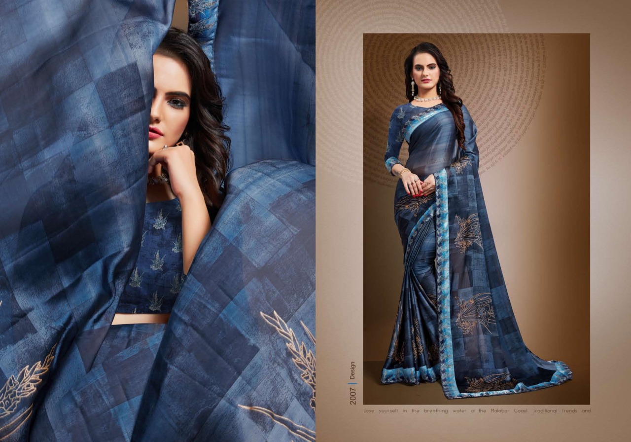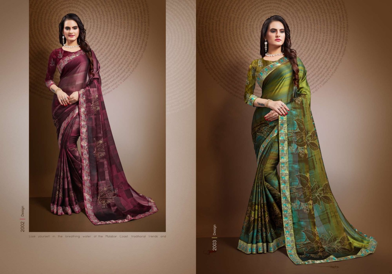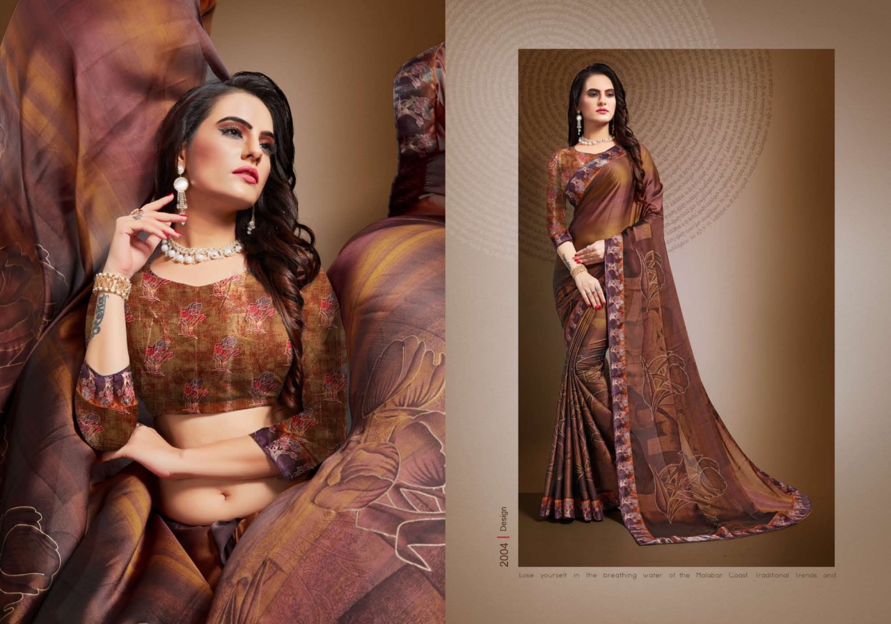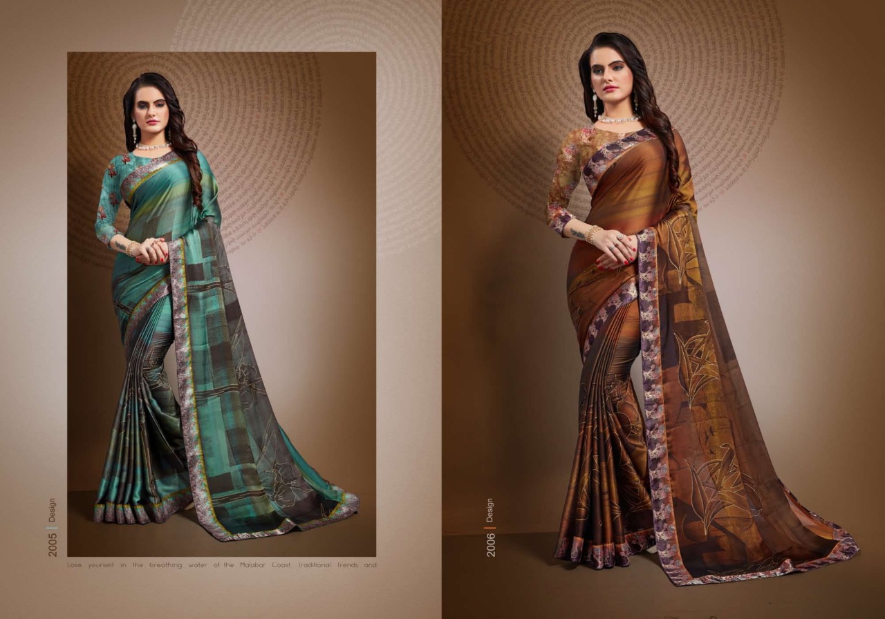 SURAT NEW INTRODUCING Swaruchi Brand:- MANSAROVER FASHION Rate:- 590/- _Fabric:- Black chinese CHIFFON WITH EXCLUSIVE Digital blouse & Digital FANCY BODER Total Designs:- 08 _Packing pcs :- set to set GST 5 Percent Extra. Delivery from today Matching :- Eight COLOR Matching WITH BLOUSE |