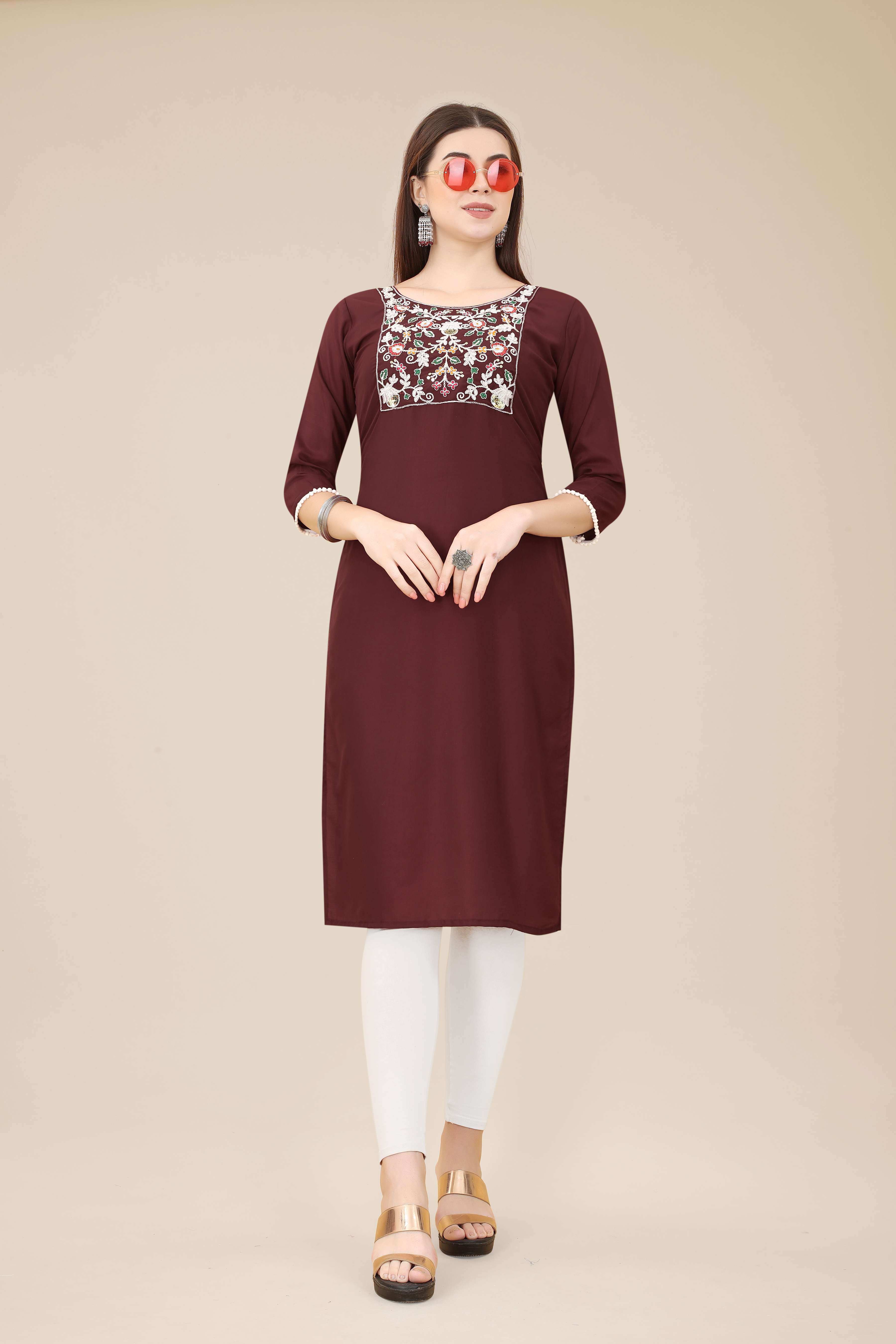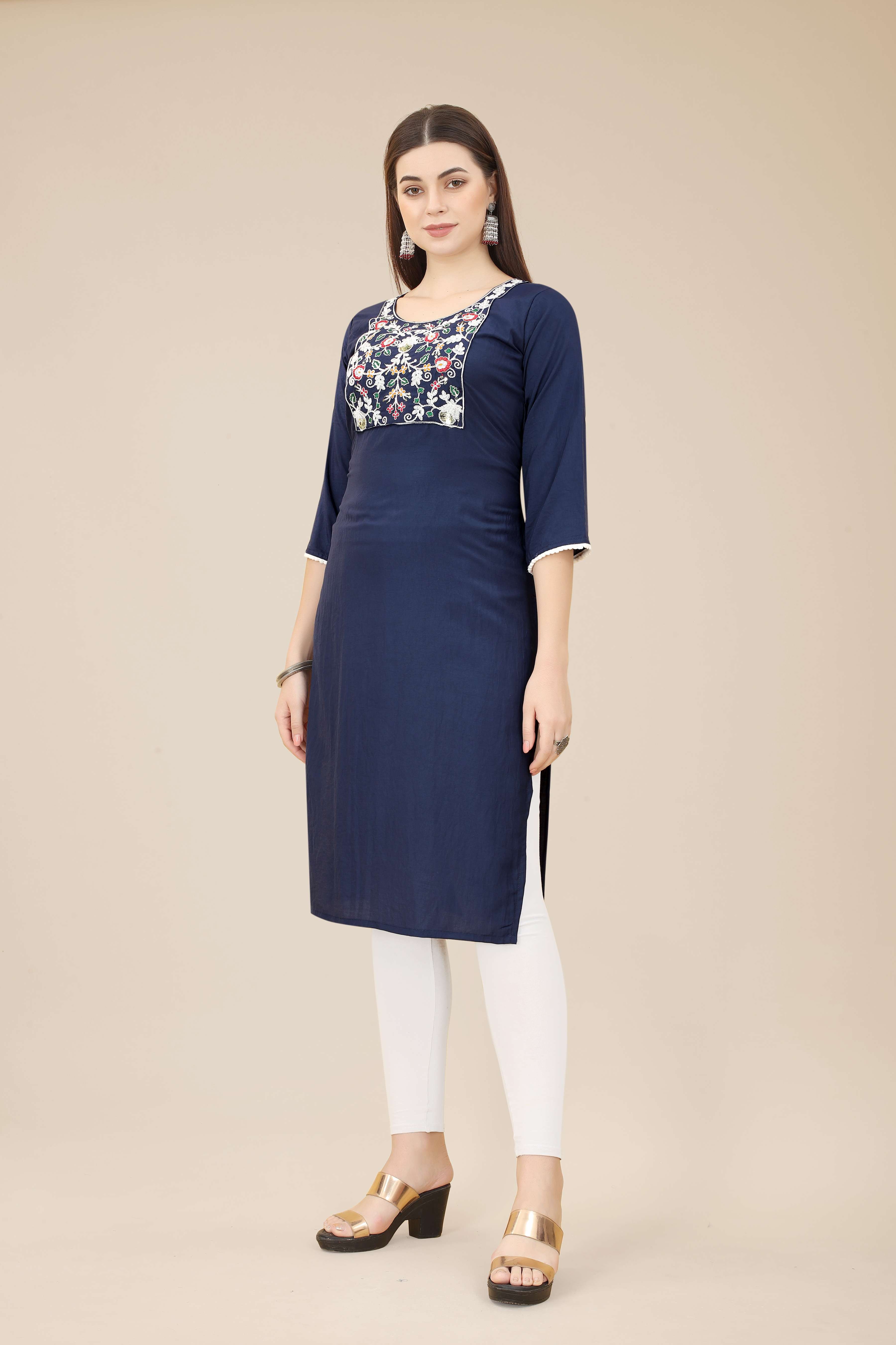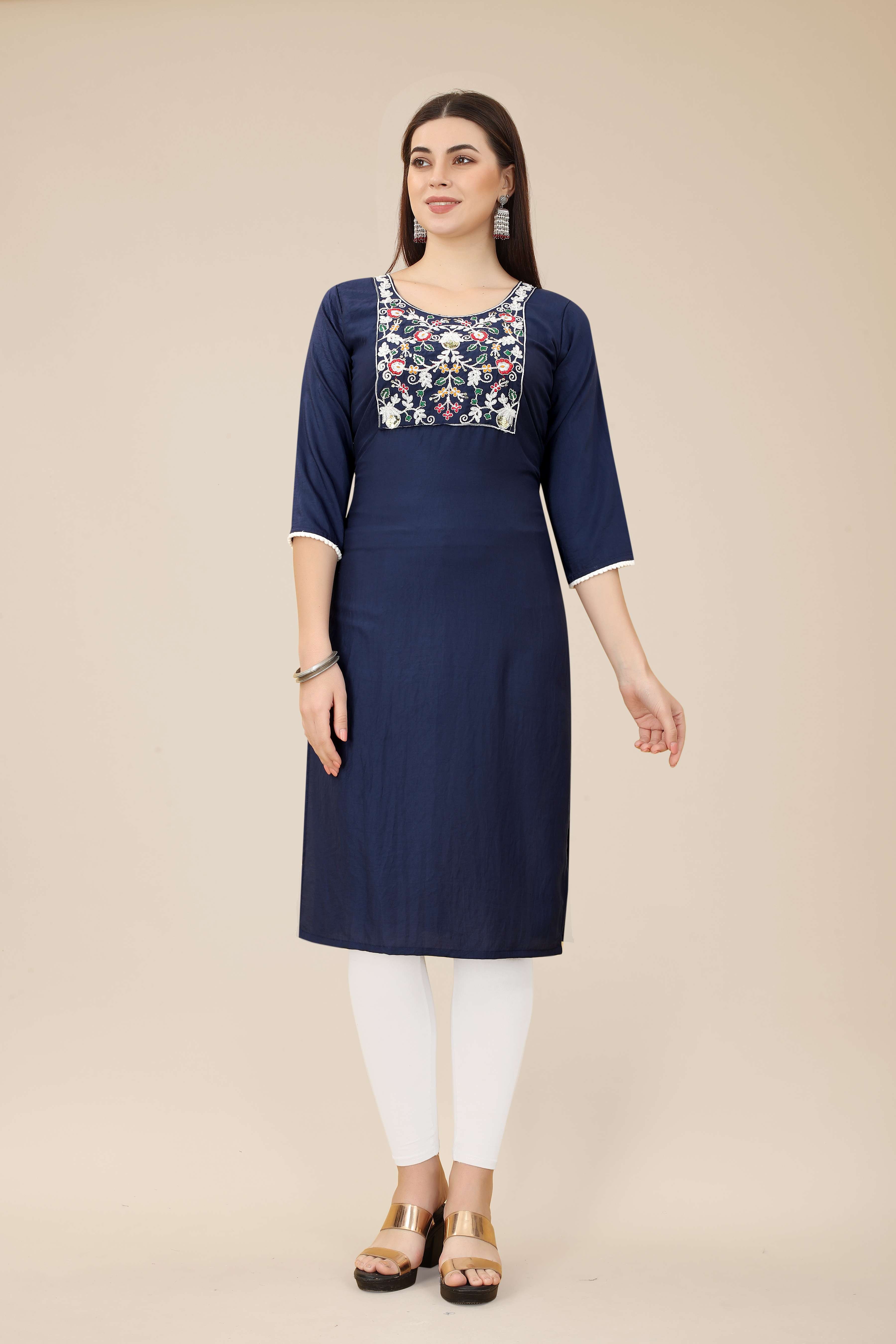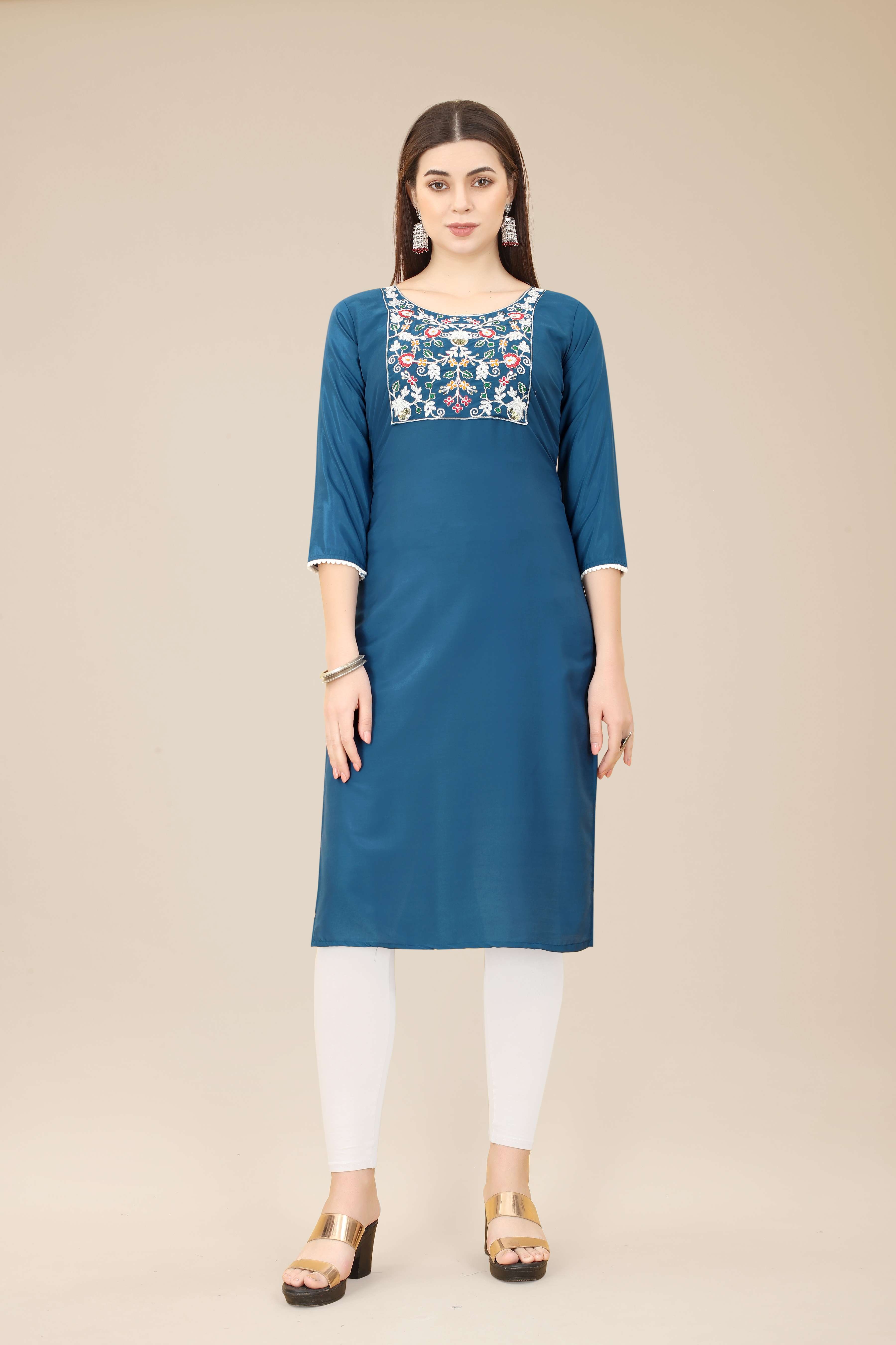 Swati Soft chinnon Kurta with Embroidery Work Straight Shape Three Quarter Sleeves Round Neck |