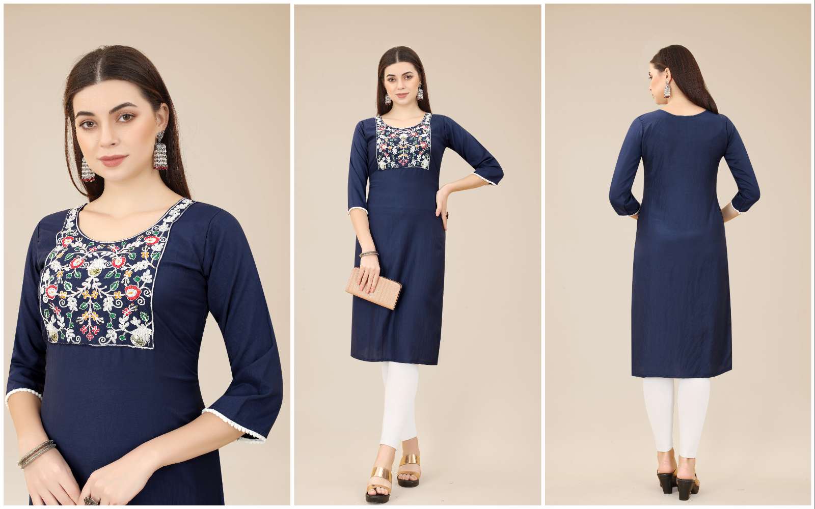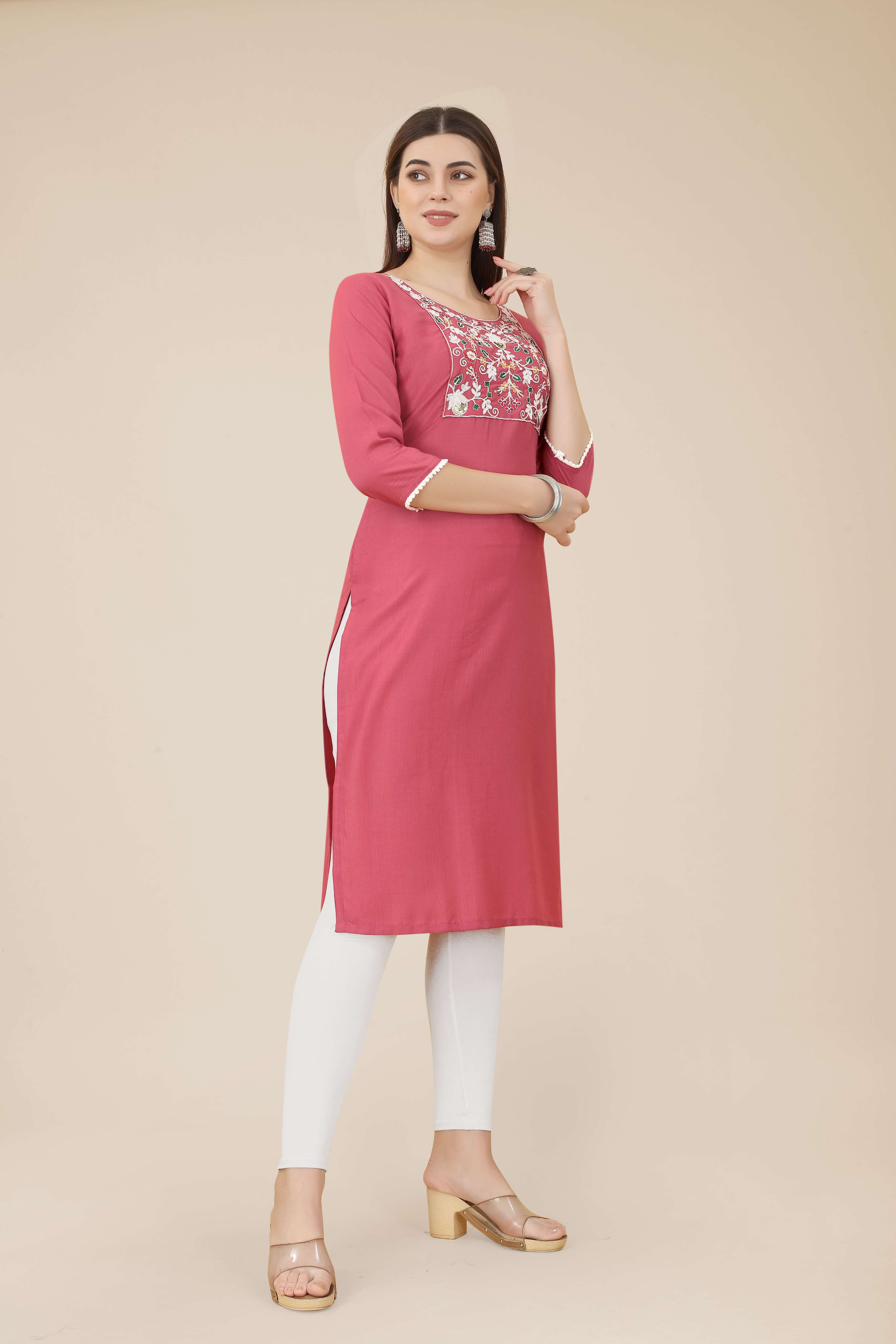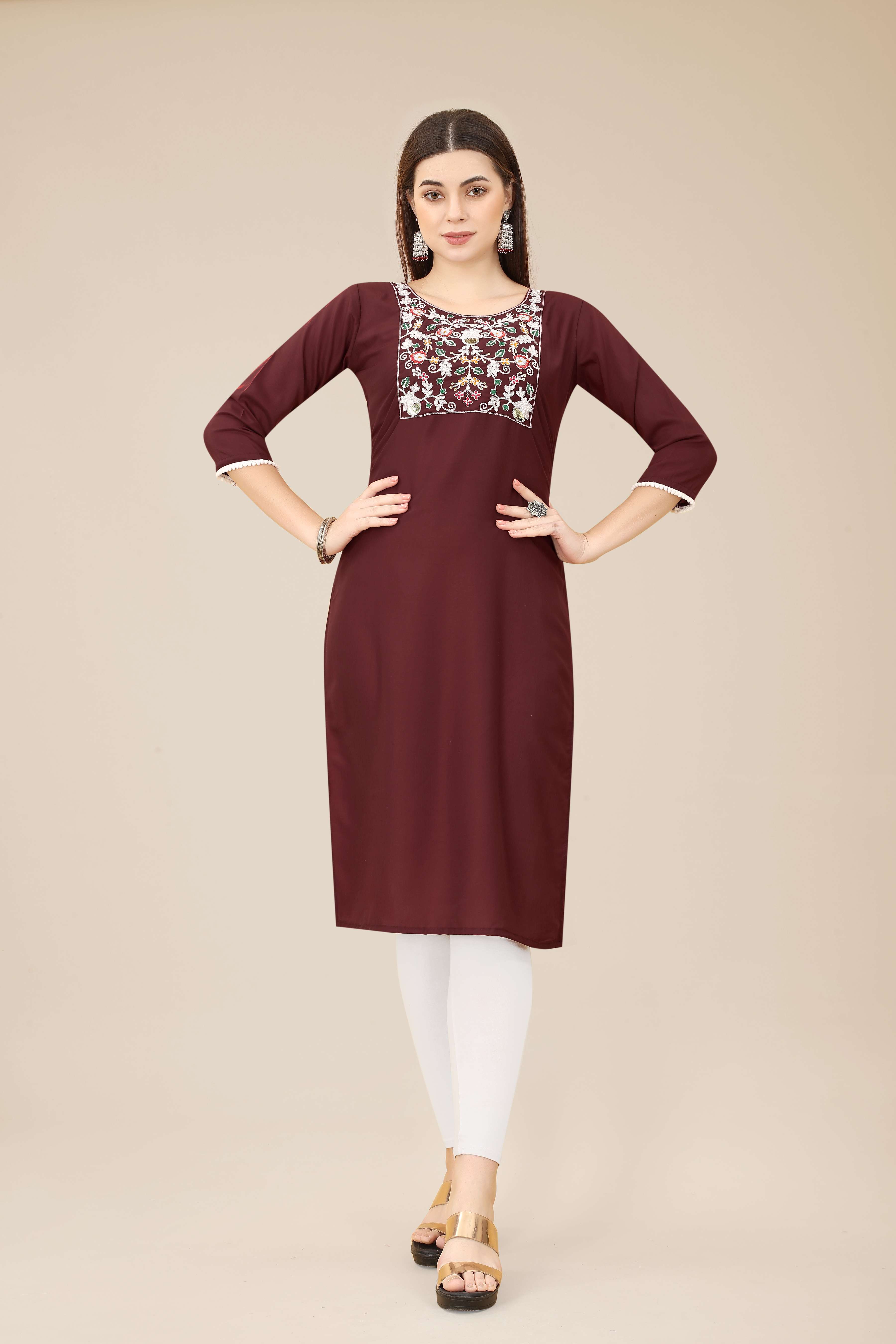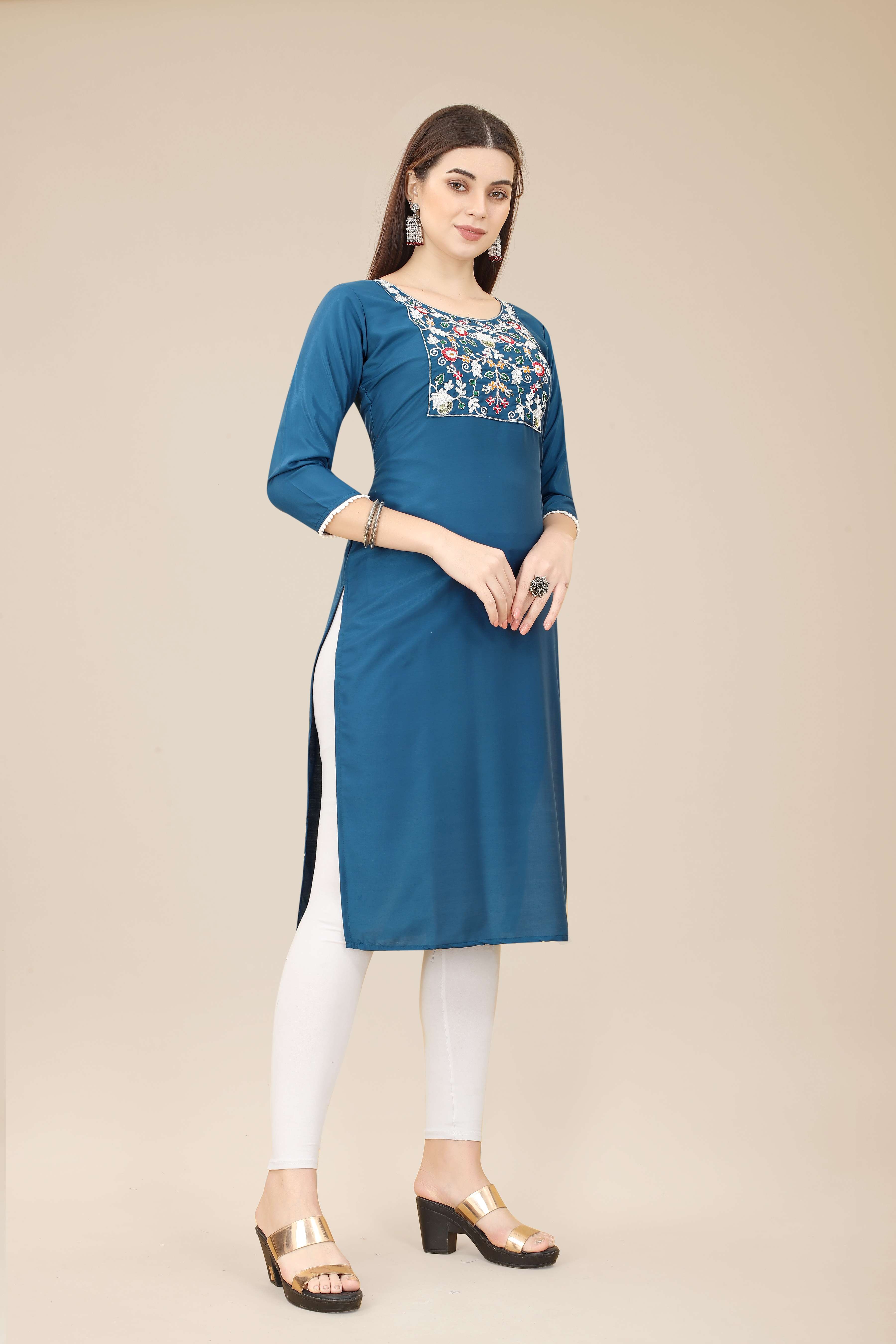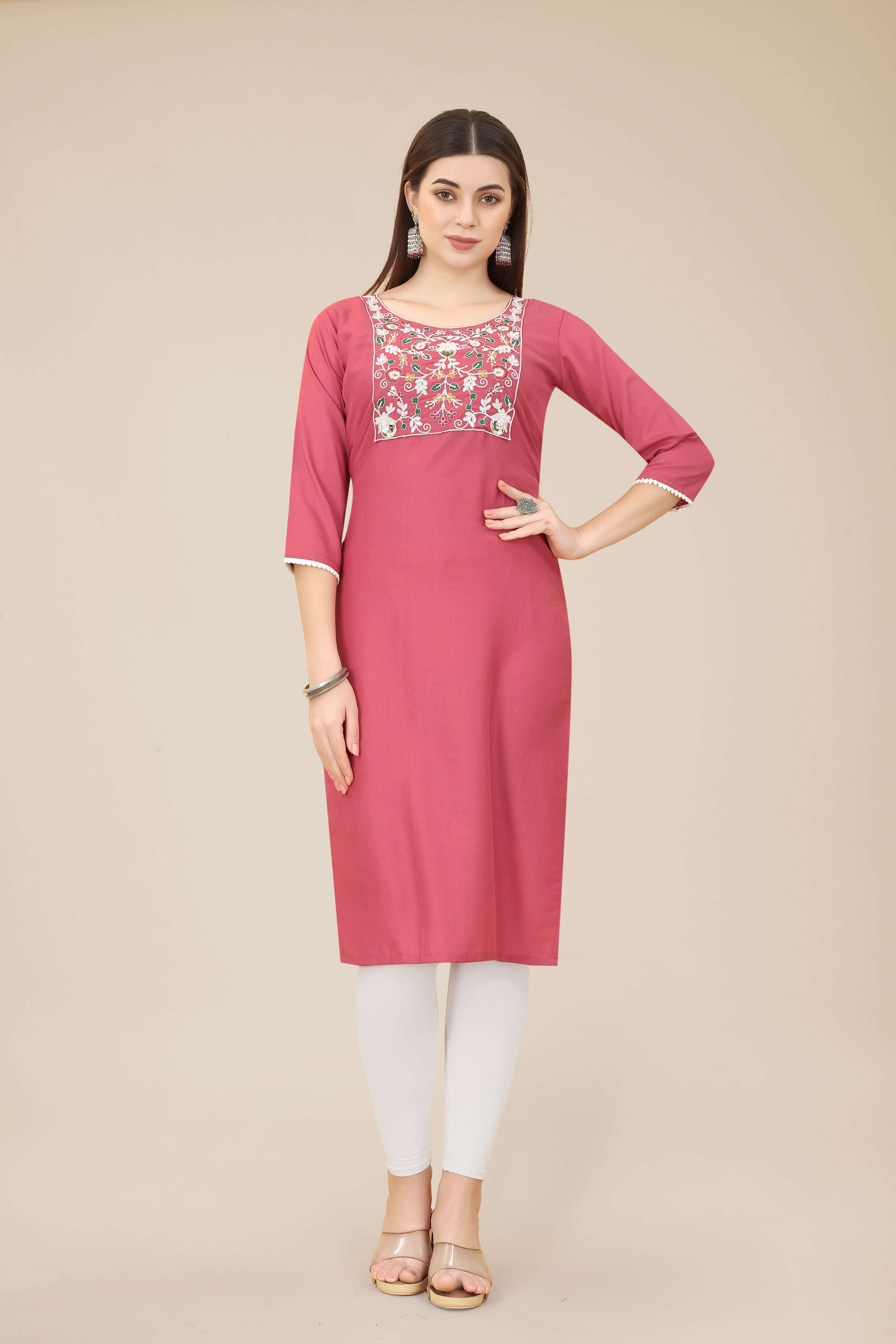 Swati Soft chinnon Kurta with Embroidery Work Straight Shape Three Quarter Sleeves Round Neck |