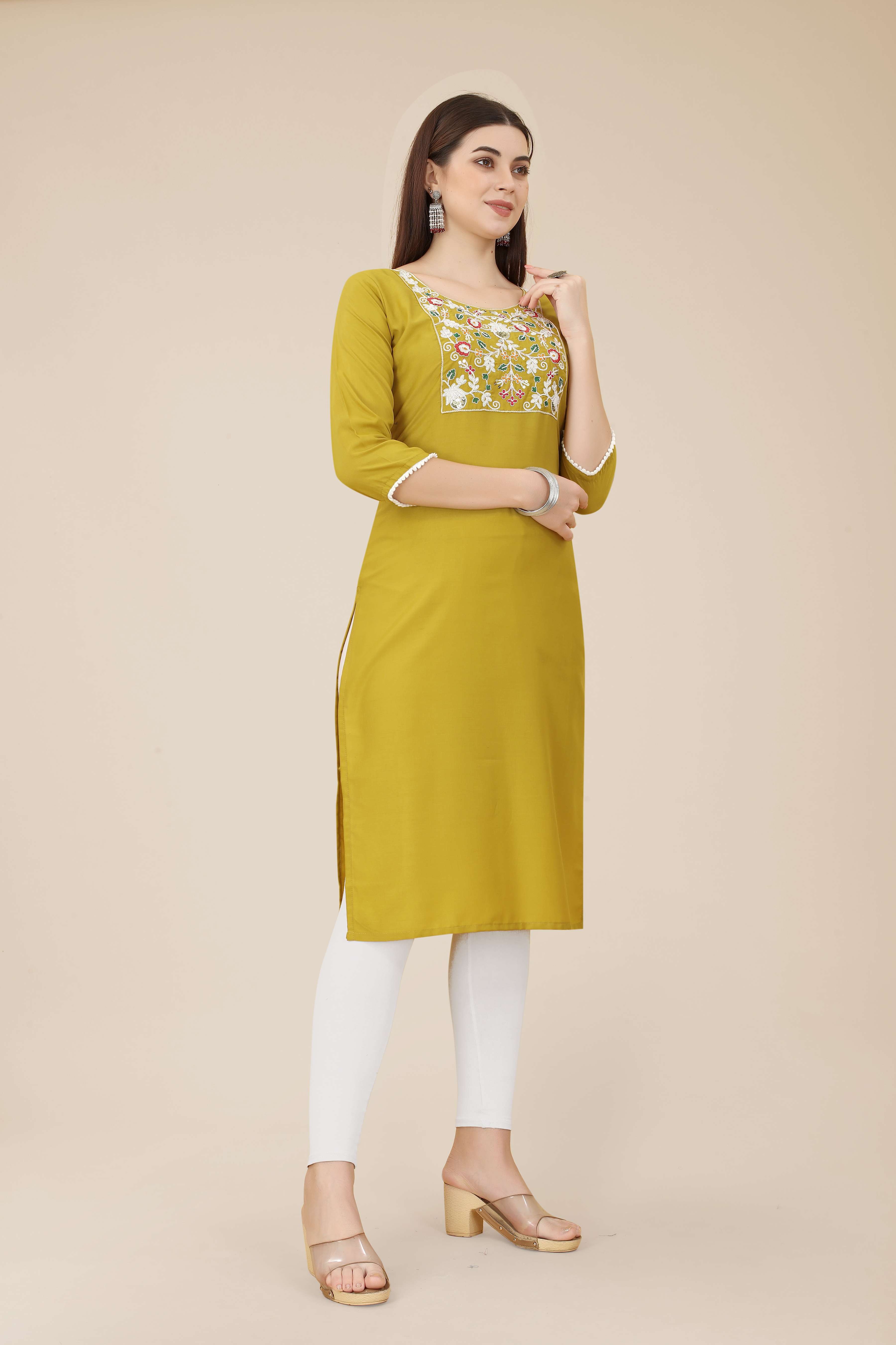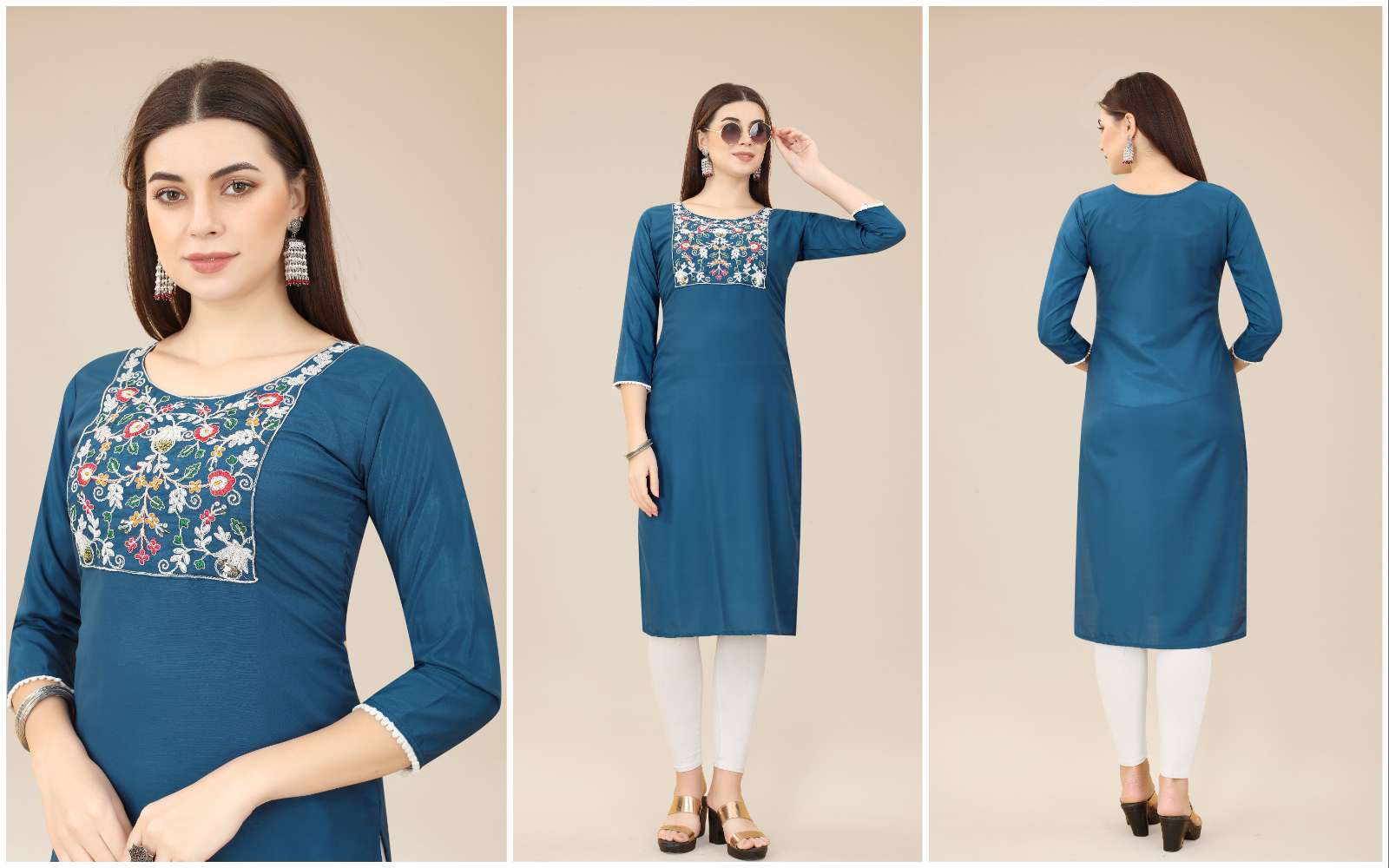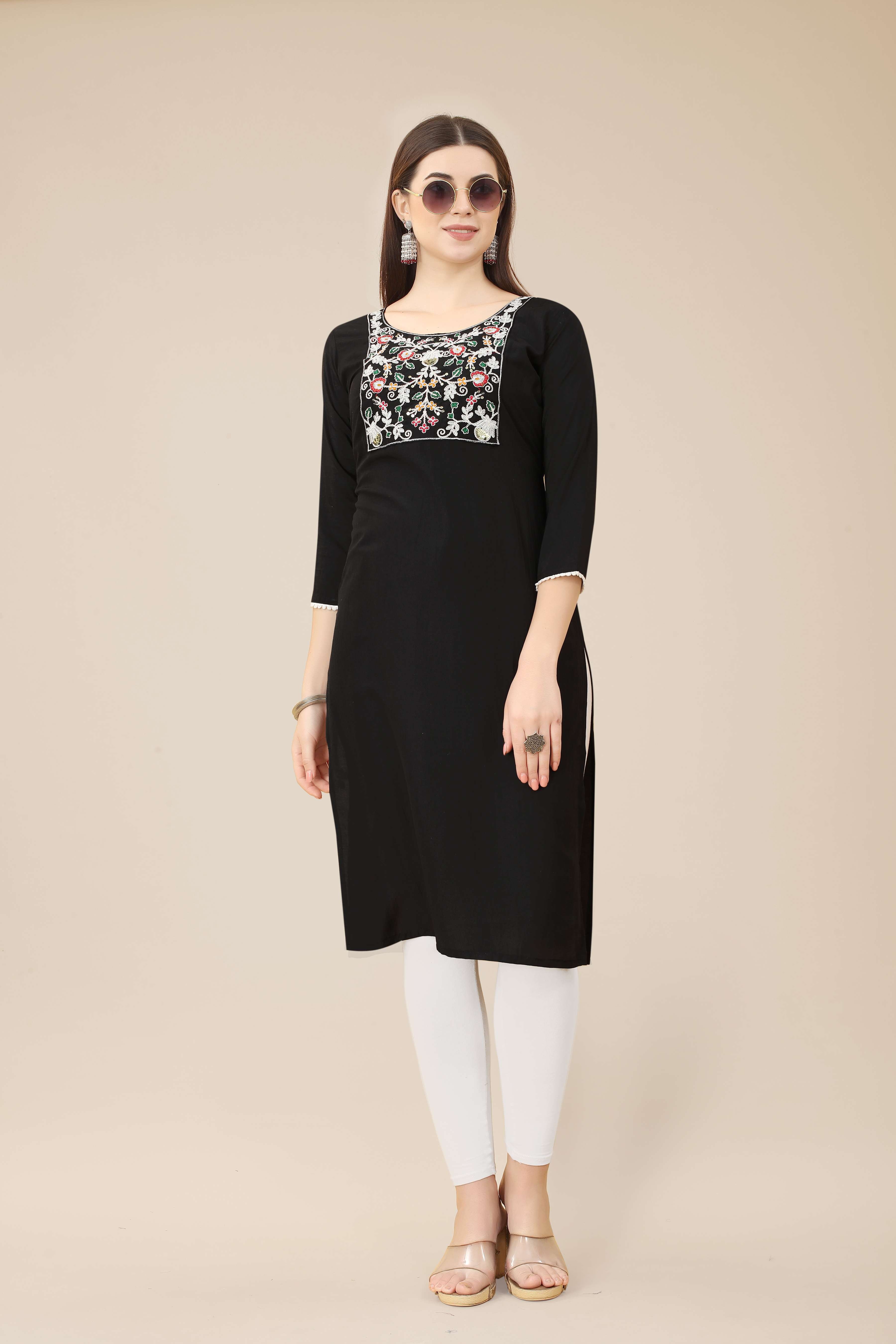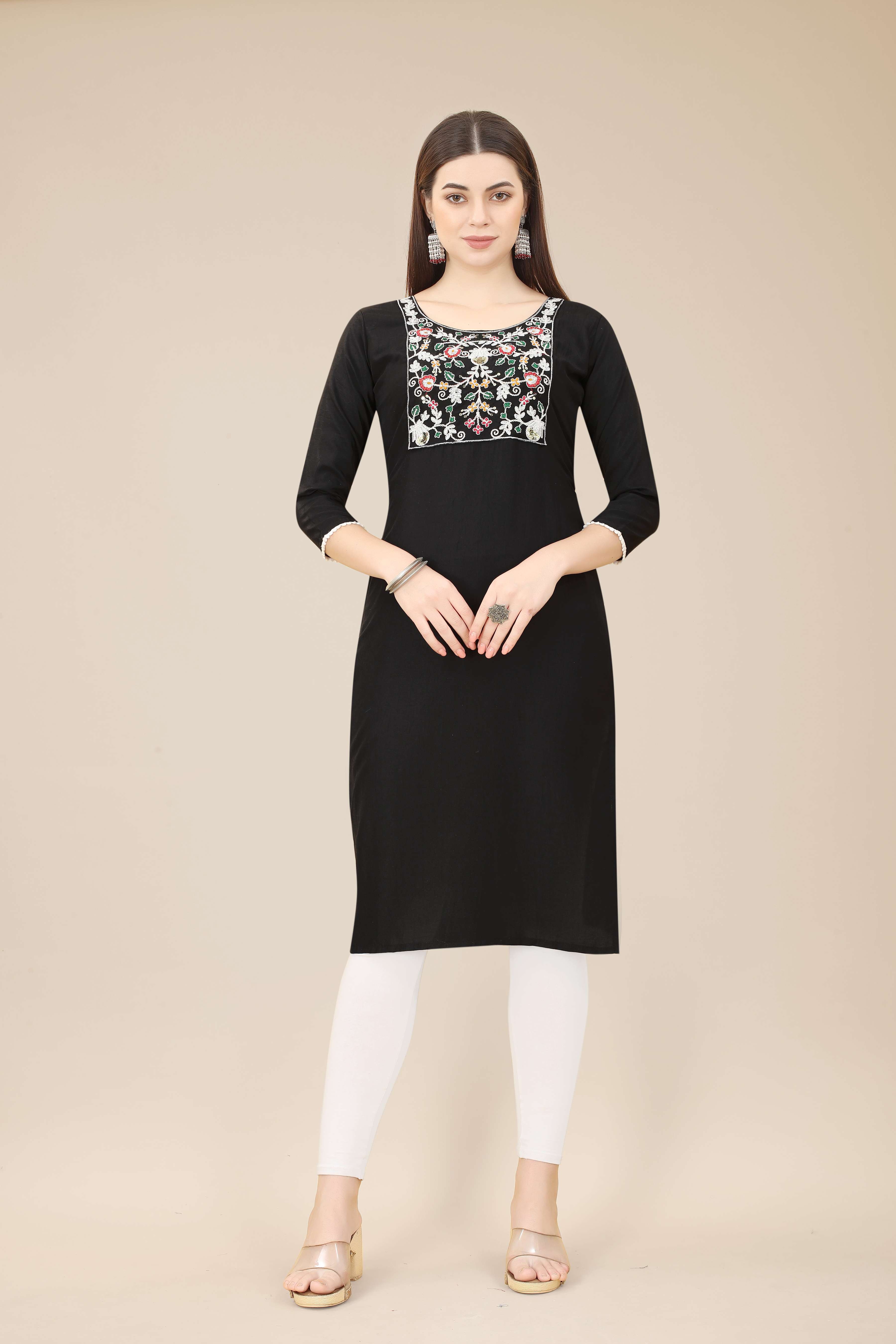 Swati Soft chinnon Kurta with Embroidery Work Straight Shape Three Quarter Sleeves Round Neck |