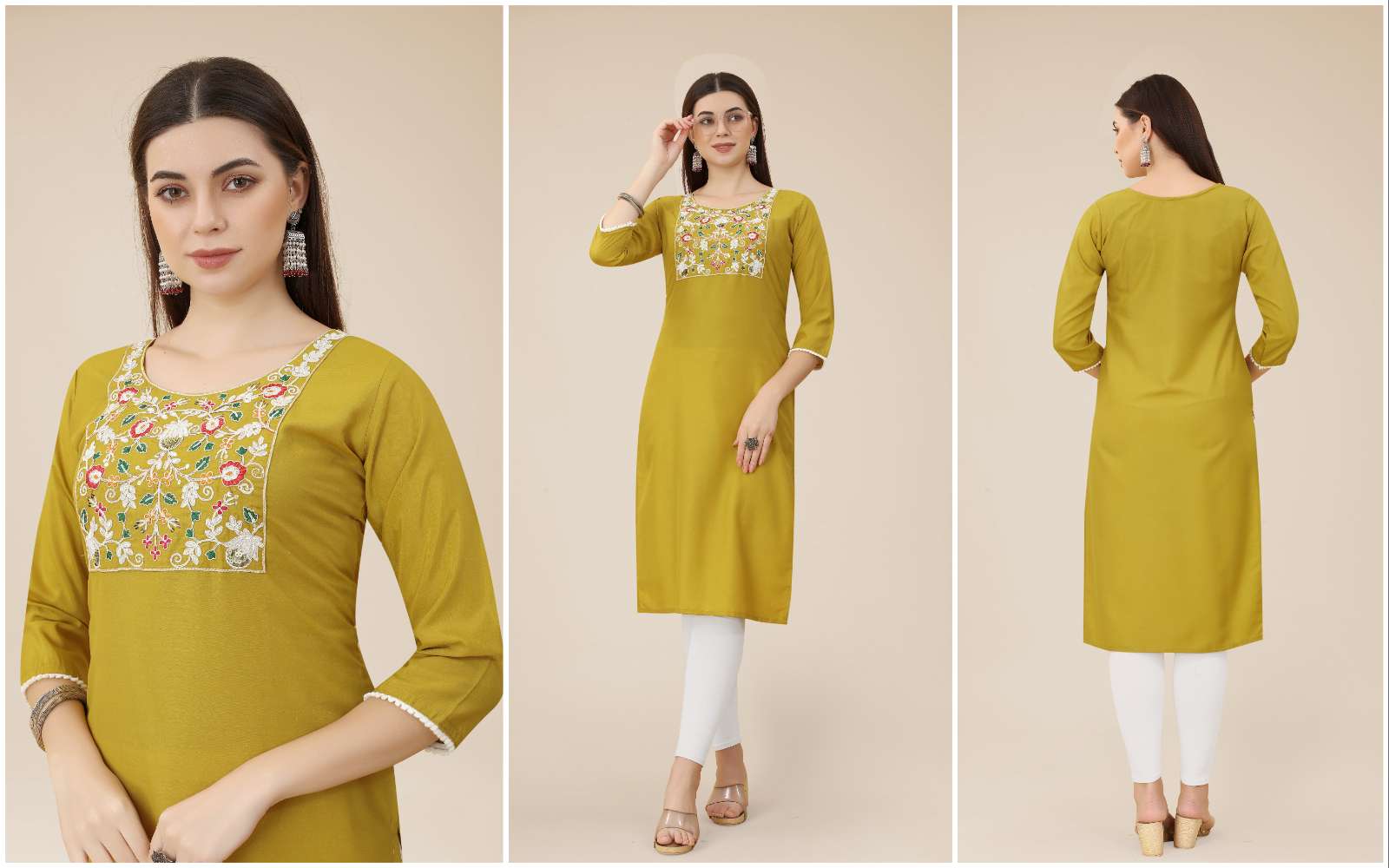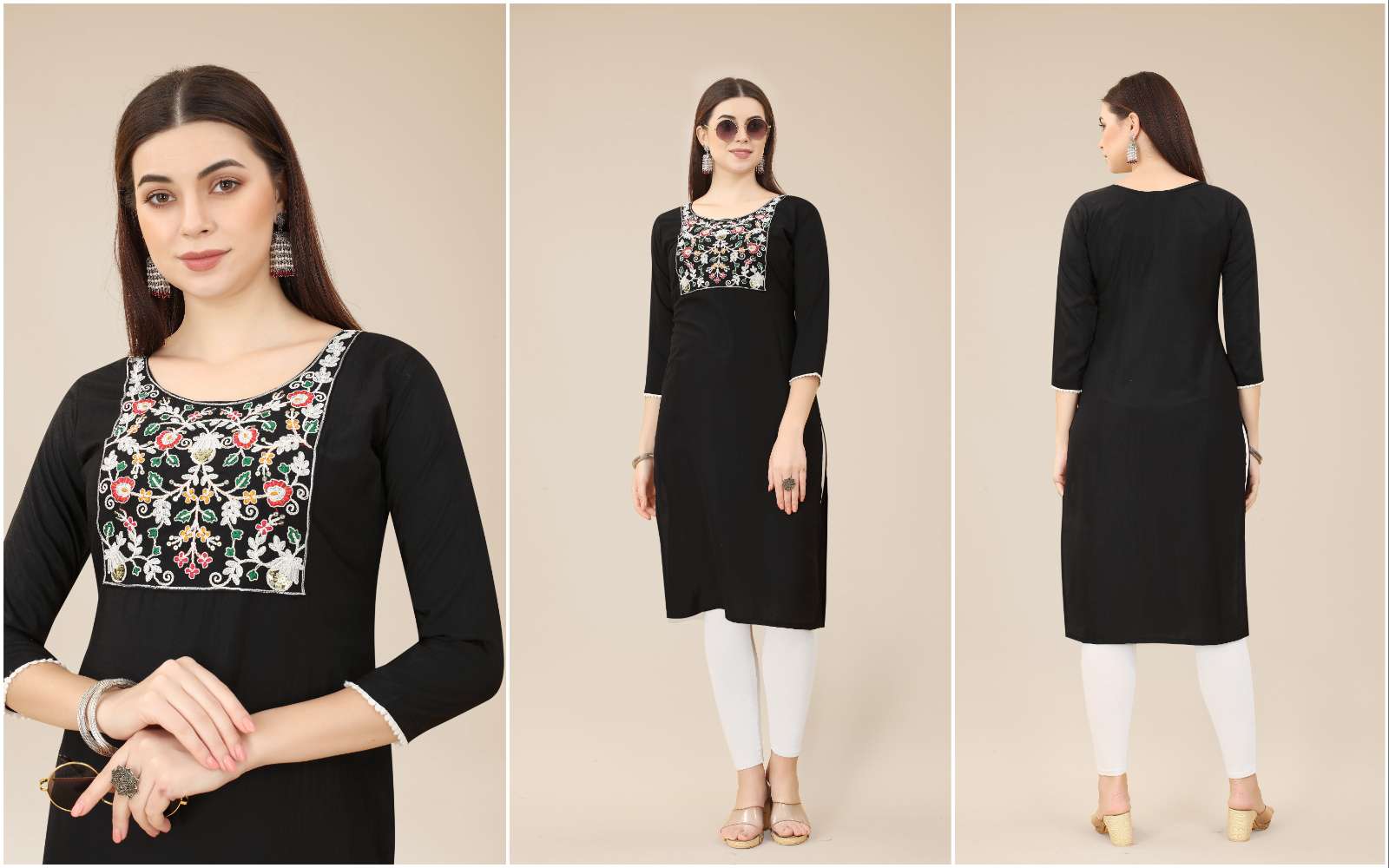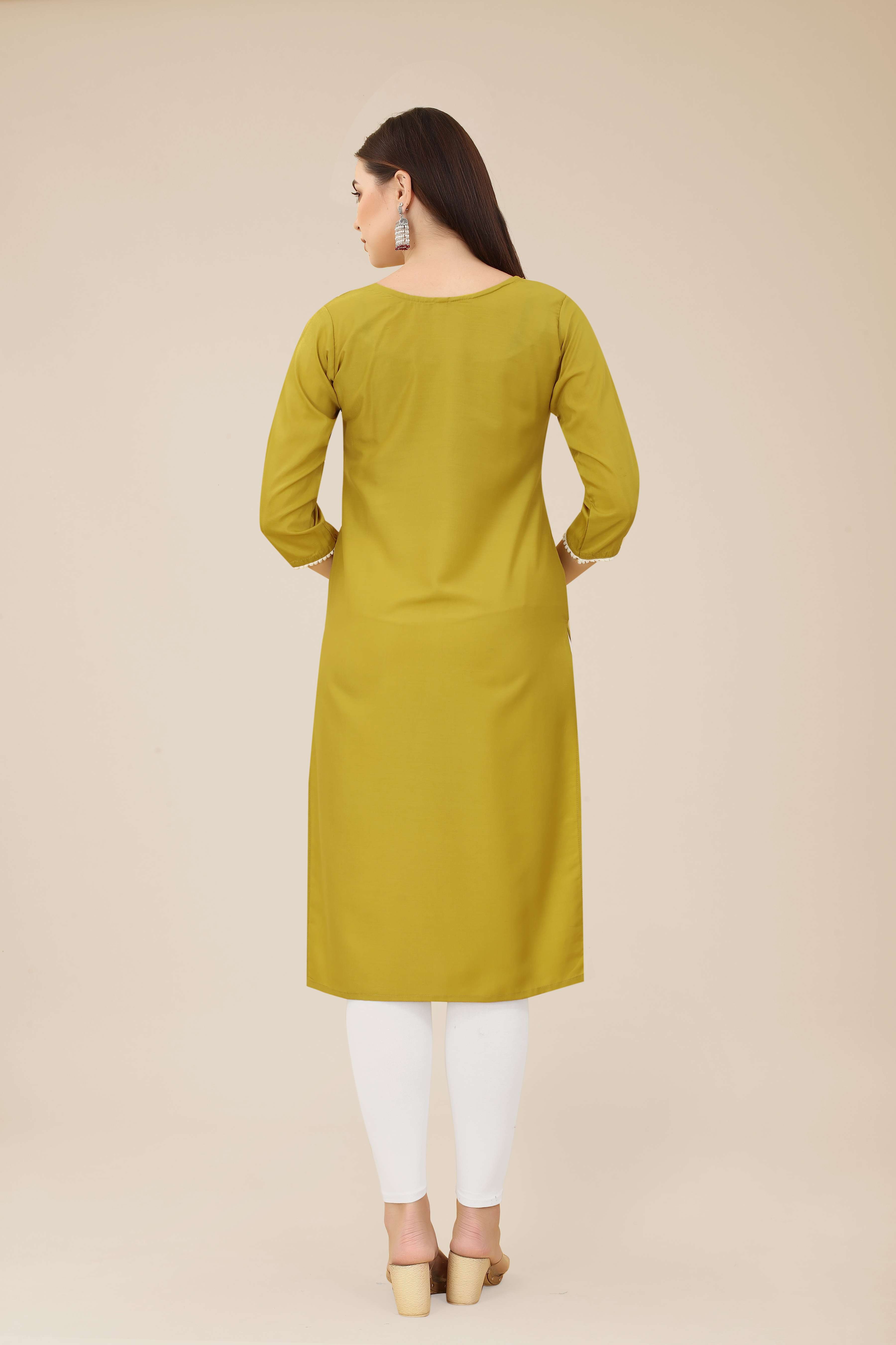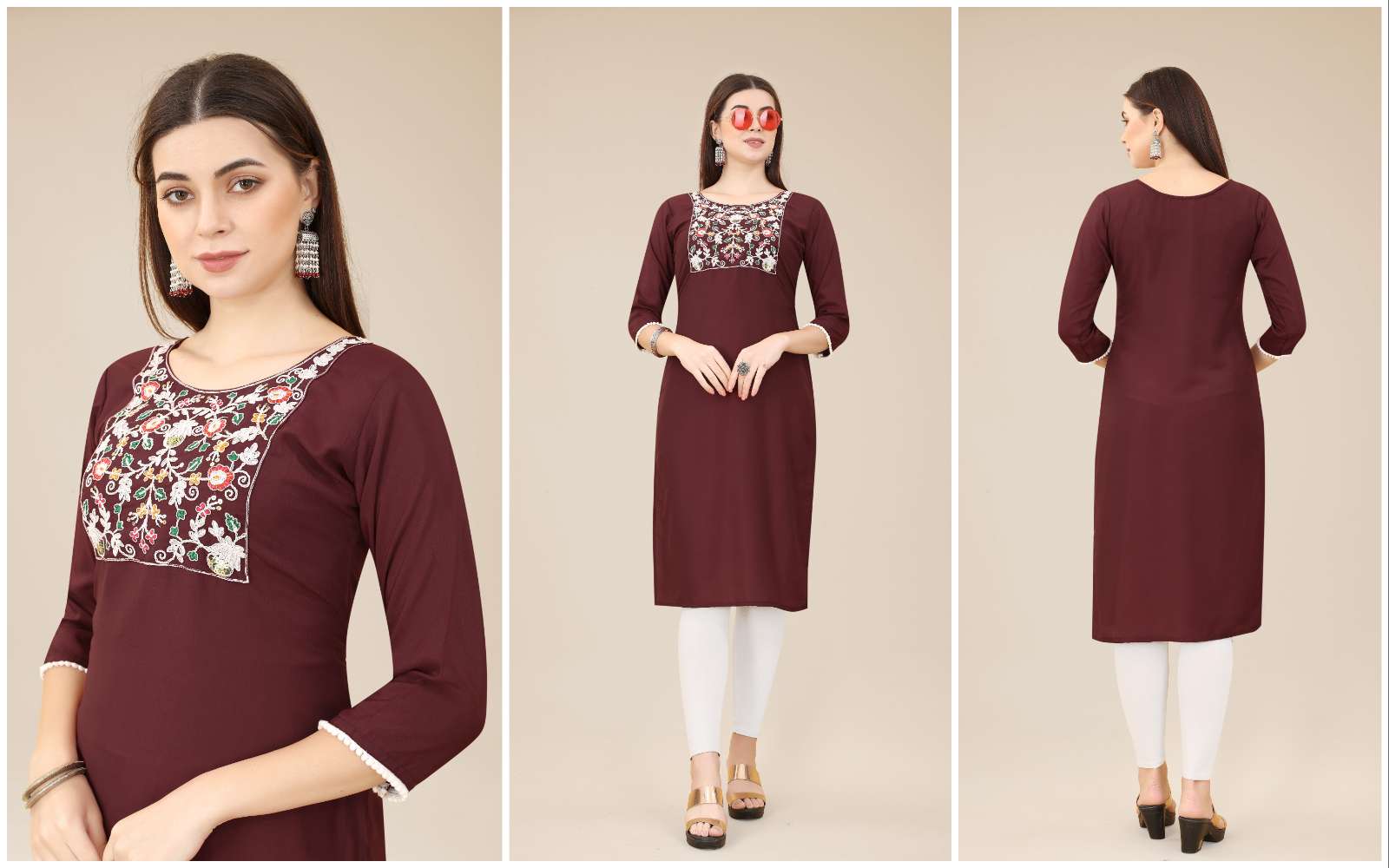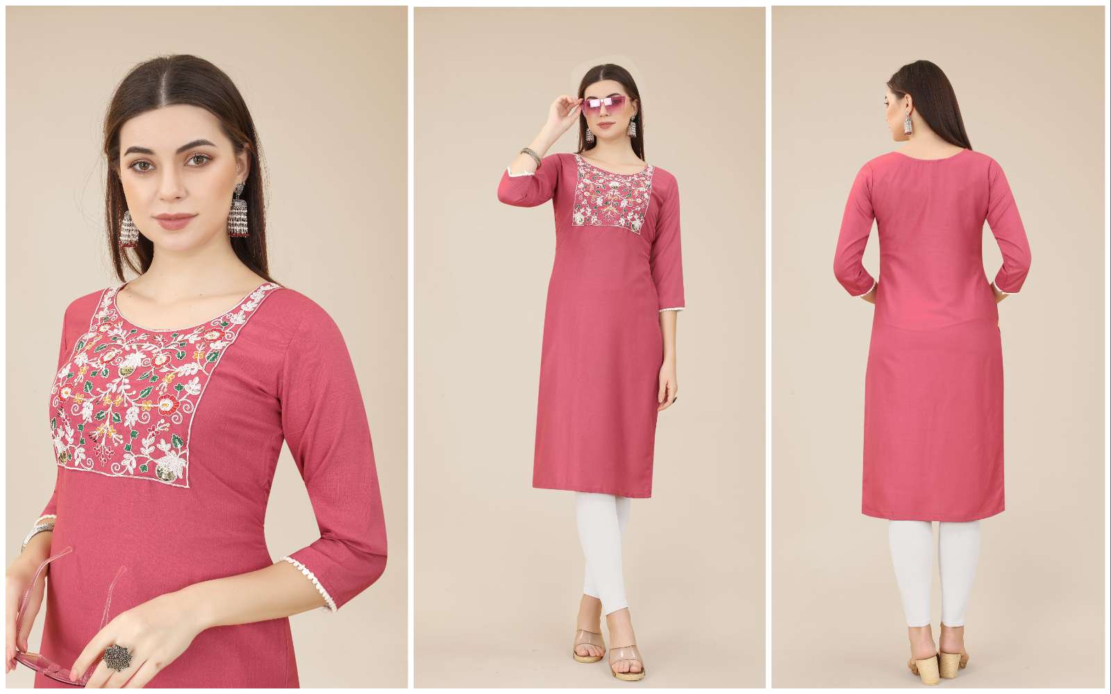 Swati Soft chinnon Kurta with Embroidery Work Straight Shape Three Quarter Sleeves Round Neck |