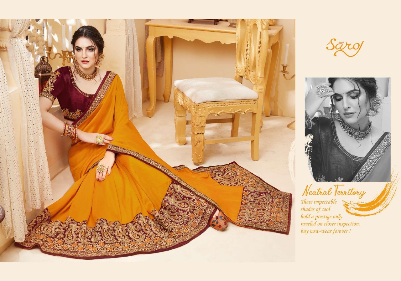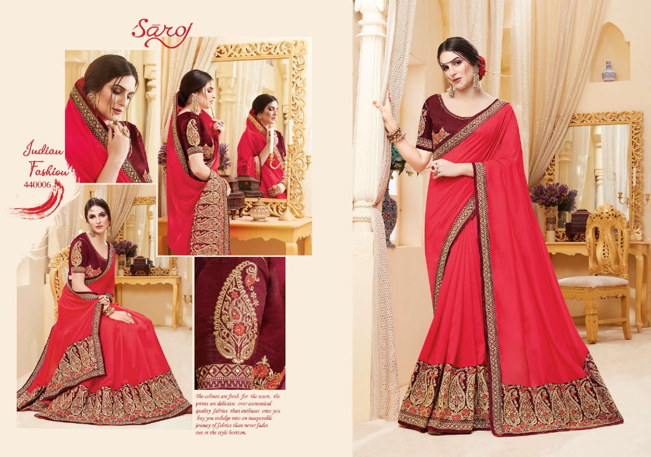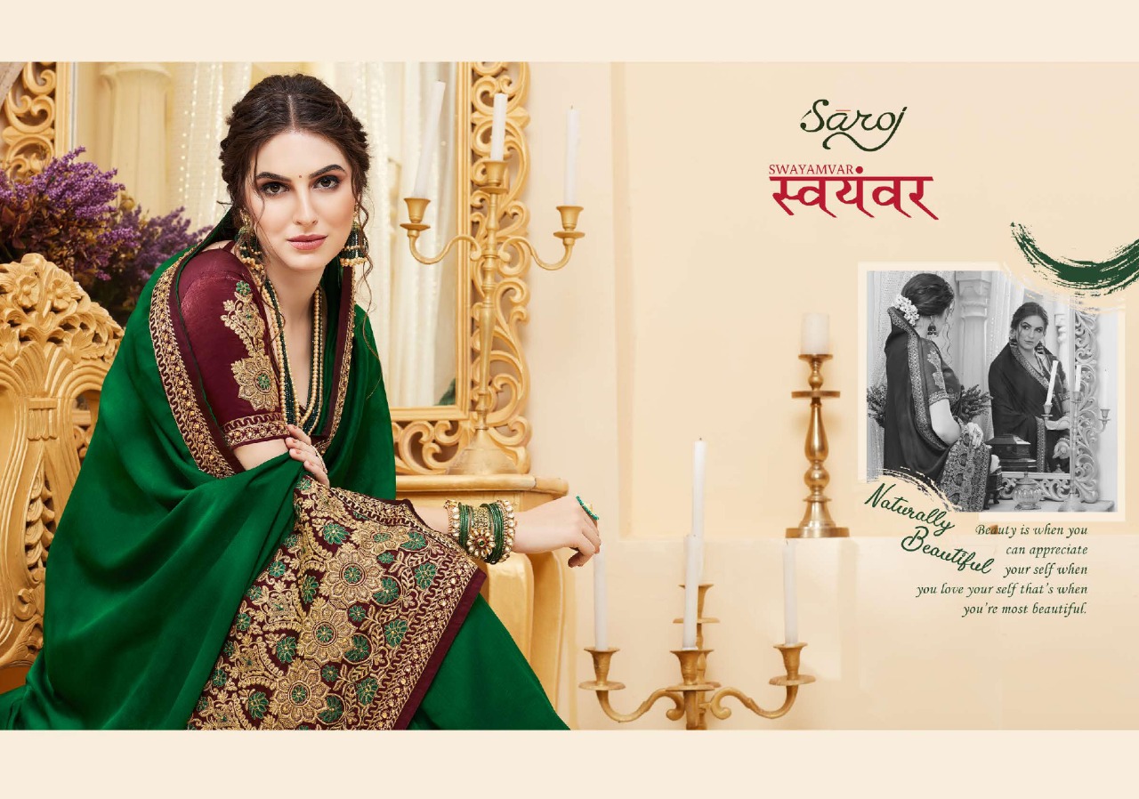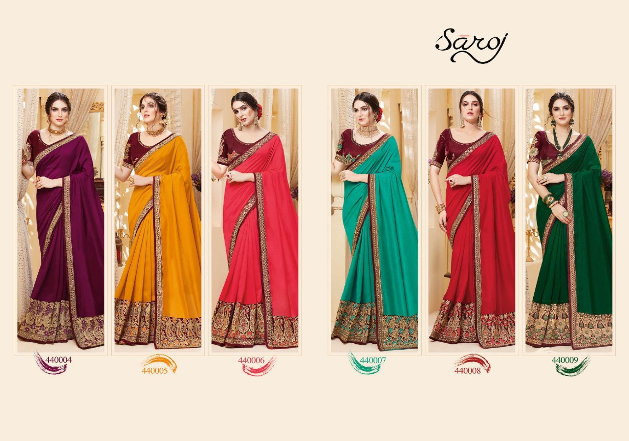 Saroj Present Swayamvar (Rs.1510) Fabric: Vichitra Silk with emb. work. Blouse: Heavy work - Banglori silk. 6 Designs |