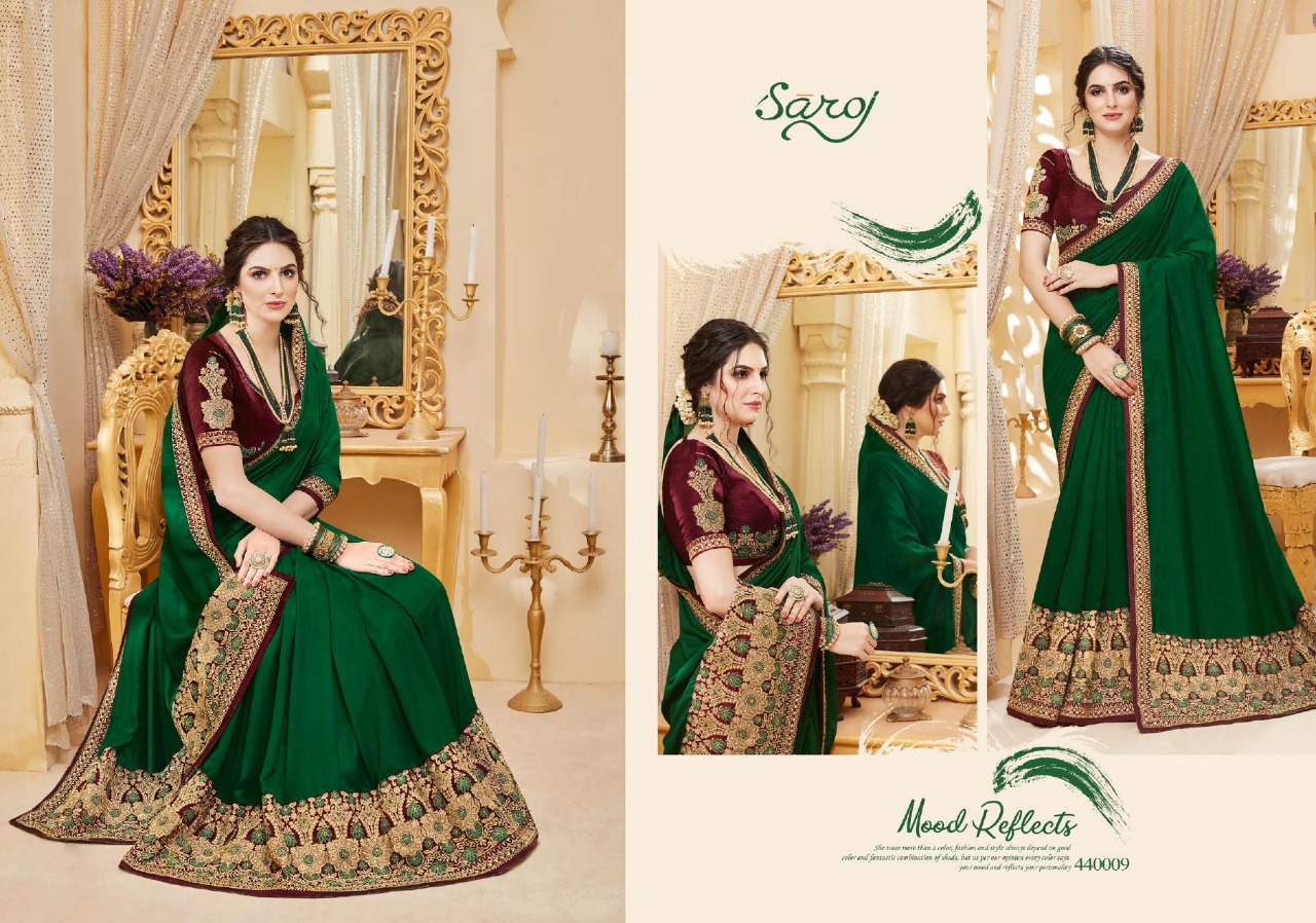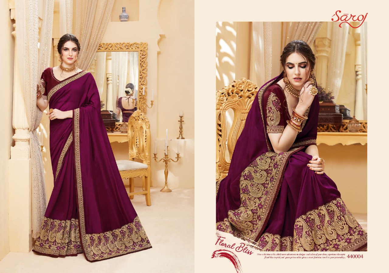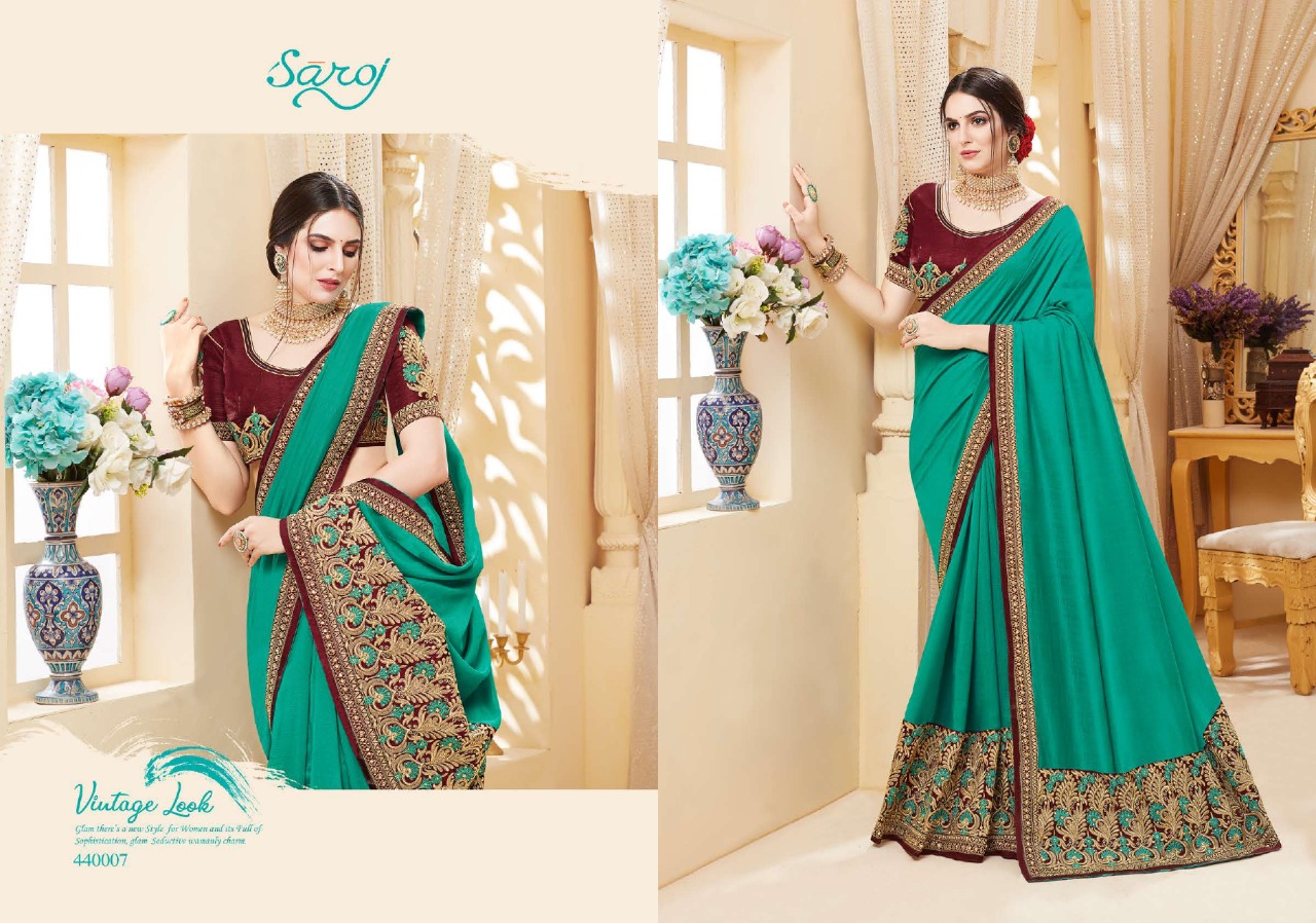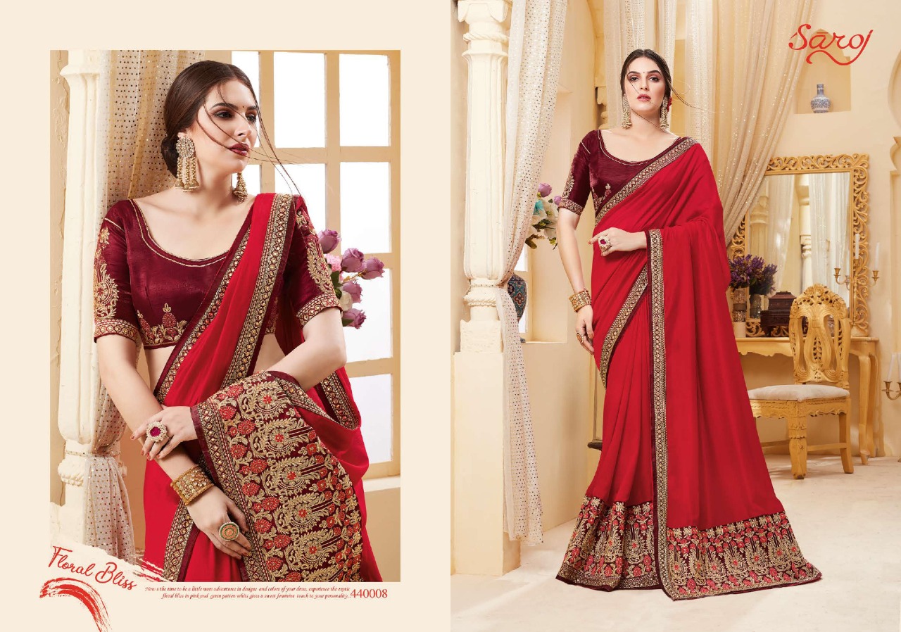Saroj Present Swayamvar (Rs.1510) Fabric: Vichitra Silk with emb. work. Blouse: Heavy work - Banglori silk. 6 Designs |