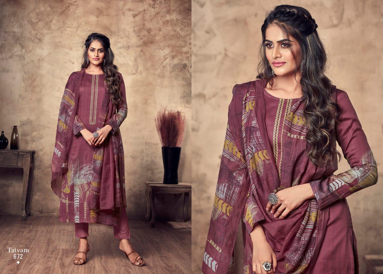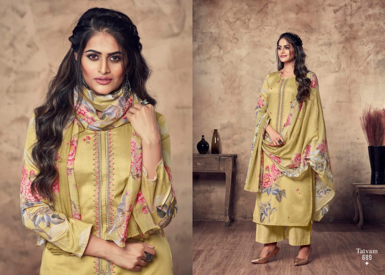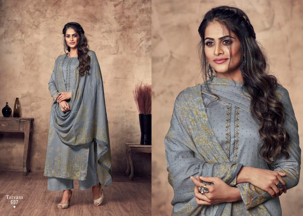 T And M Present Tatvam Cotton Satin Printed Embroidery Dress Materials