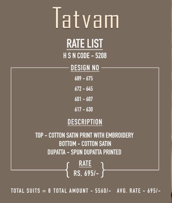 P R E S E N T S TATVAM TOP-COTTON SATIN PRINT WITH EMBROIDERY BOTTOM-COTTON SATIN DUPATTA-SPUN PRINTED R A T E - 695₹ |