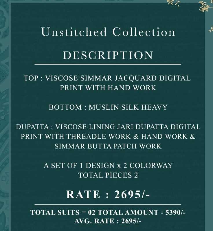 BOTTOM: MUSLIN SILK HEAVY DUPATTA: VISCOSE LINING JARI DUPATTA DIGITAL A SET OF 1 DESIGN × 2 COLORWAY TOTAL PIECES 2 RATE: 2695/- per pcs GST EXTRA Set to set |