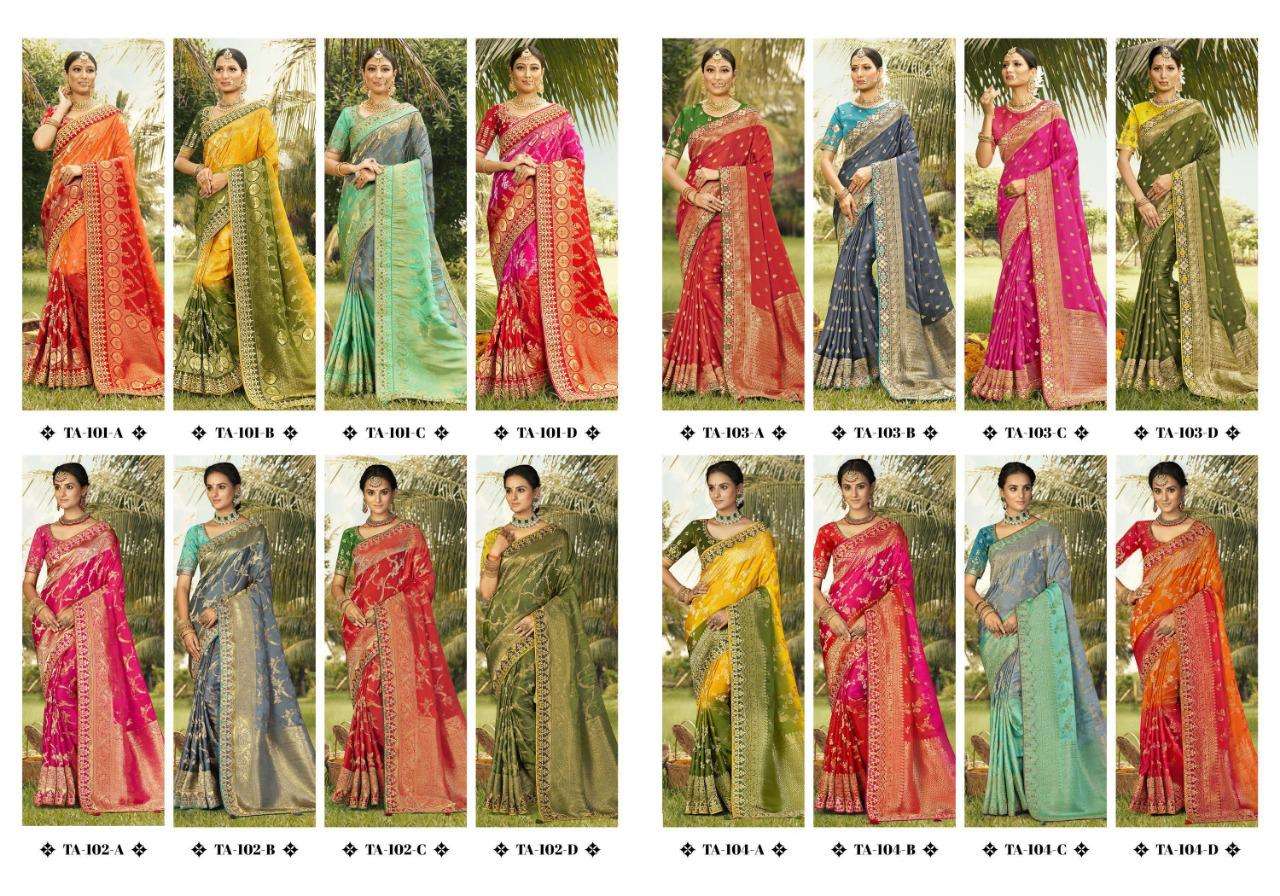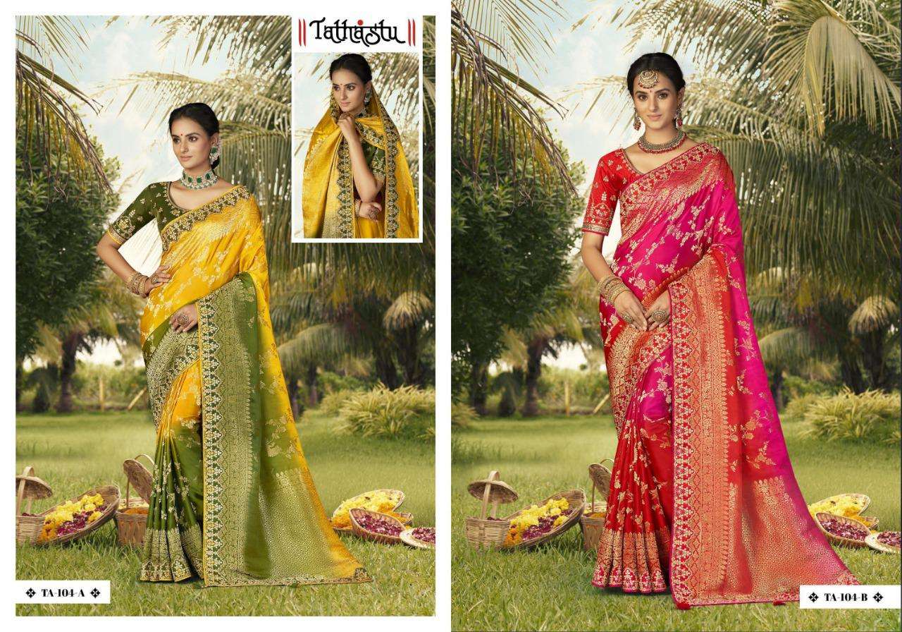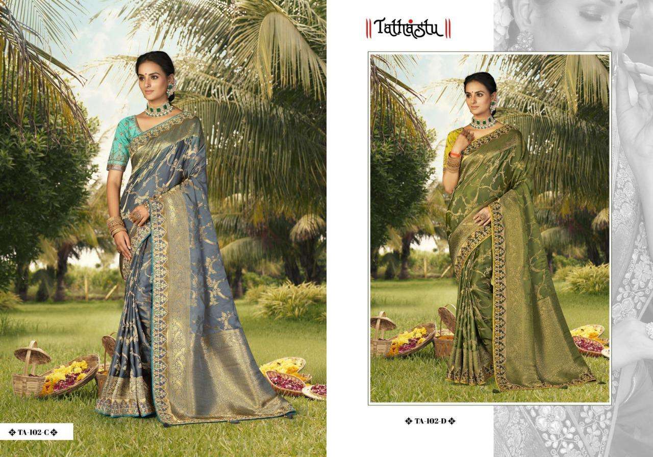 BRAND : TATHASTU CATALOG NAME : 100 SERIES SAREE FABRIC : GAJI SILK WITH WEAVING BLOUSE FABRIC : HEAVY RAW SILK WITH GOTA PATI WORK *Rate : 4775 per pcs * *DISPATCH : Today |