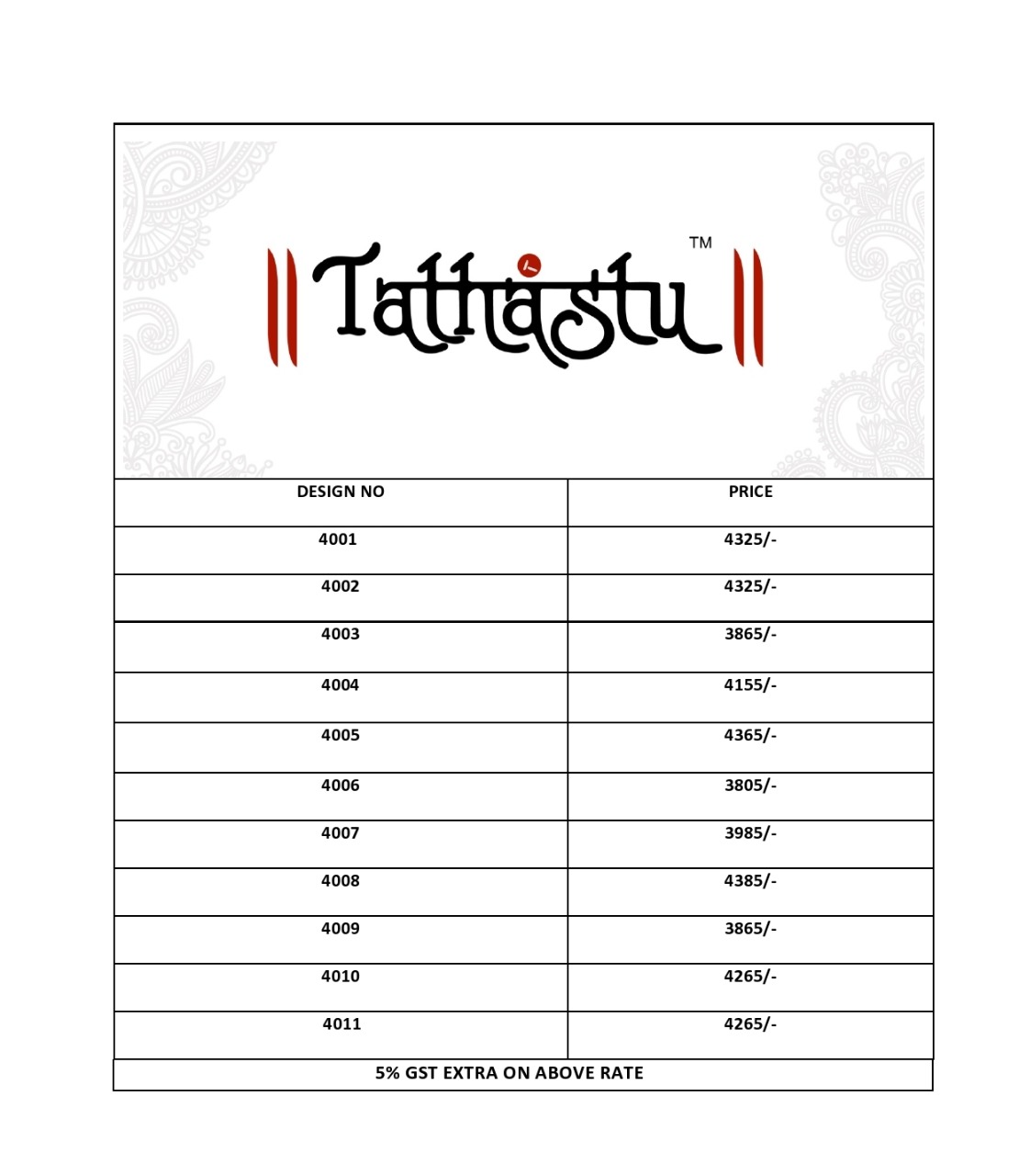 Brand - Tathastu. Type - Saree . Series - 4001 to 4011. set to set Avr Rate - 4146/- PRICE LIST HAS ATTACHED GST 5 Percent Extra. Delivery from today |