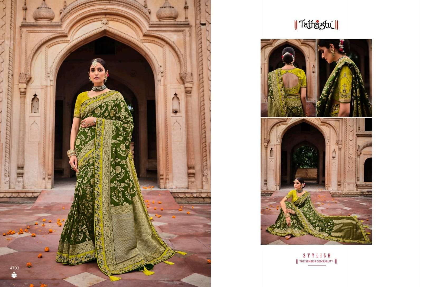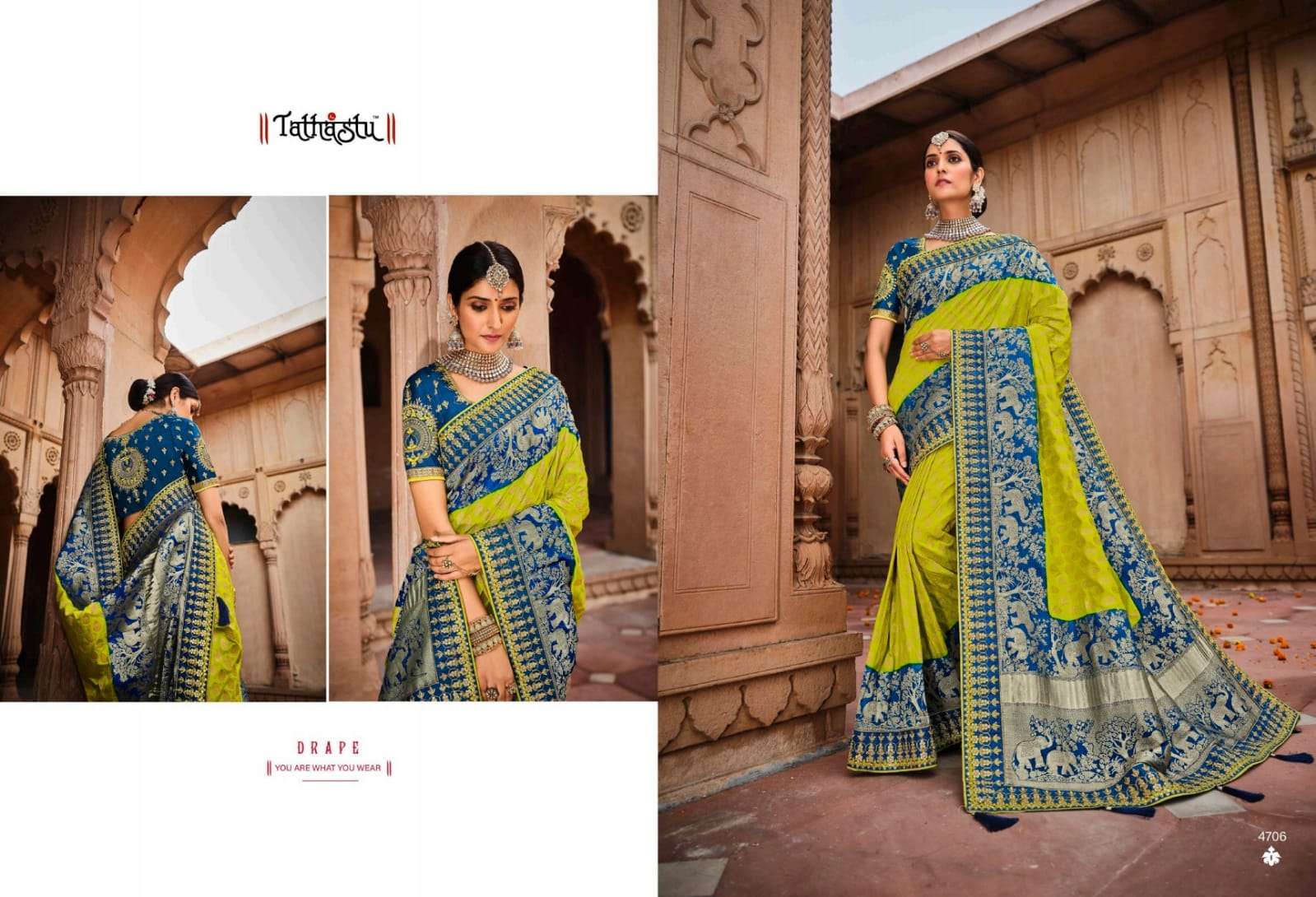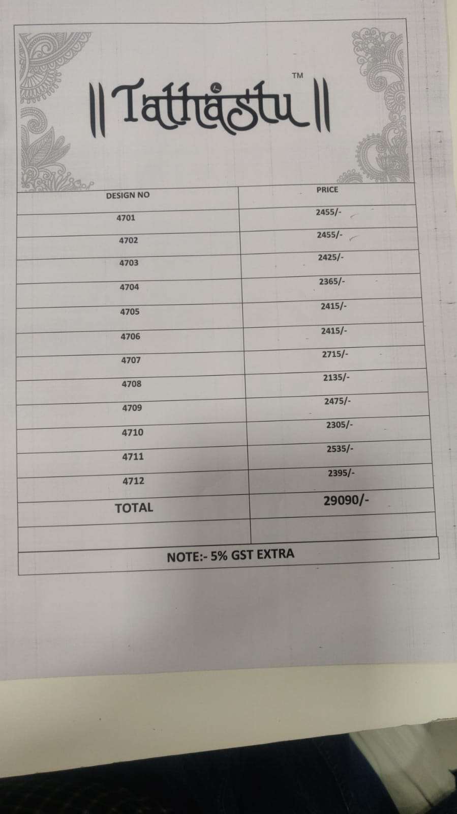 TATHASTU. Series - Â 4701 TO 4712 Fabric- Silk . RATE LIST ATTACHED GST 5 Percent Extra Avr Rate - 2425/- DELIVERY- 3-4 Days BOOK YOUR ORDER NOW |