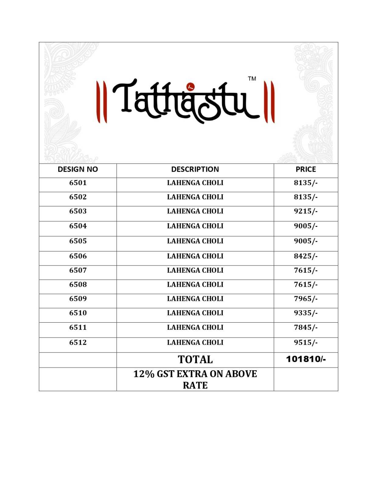 â™» OUR NEW LEHENGA COLLECTION â™» BRAND : TATHASTU CATALOG : ANAARA (6500 SERIES) PRICE : ATTACHED+12% GST EXTRA LEHENGA FABRIC : FANCY SILK MATERIAL BLOUSE FABRIC : PURE ROW SILK EMBROIDERY GOTA WORK DUPPATA : FANCY SILK MATERIAL |