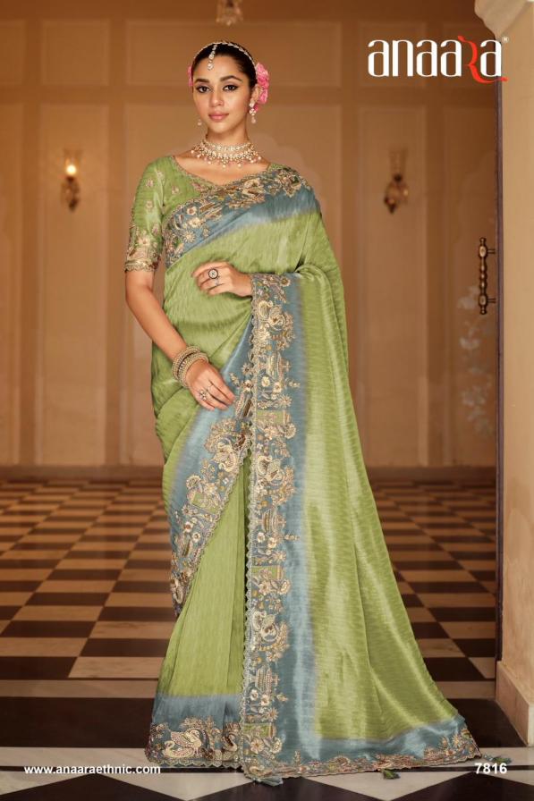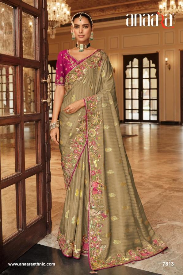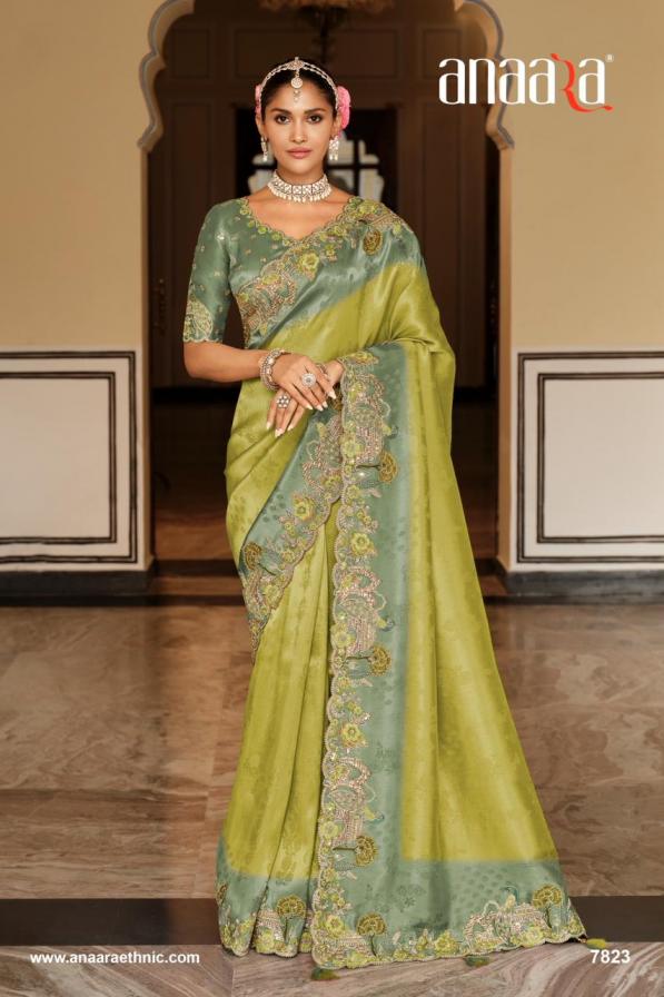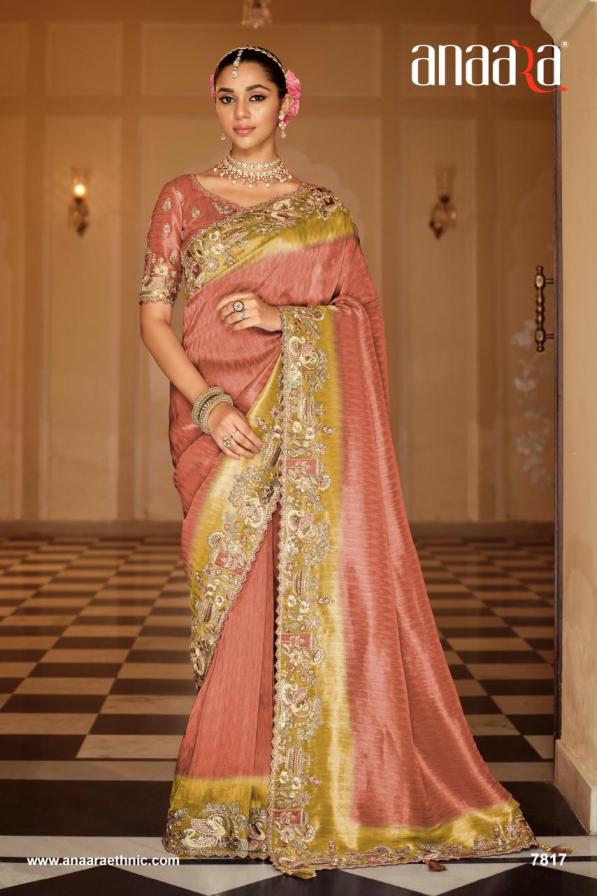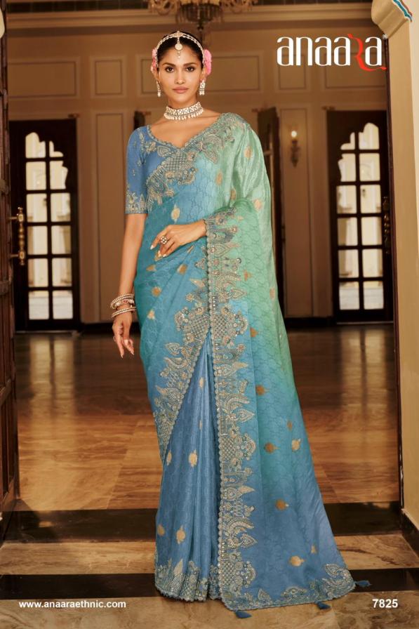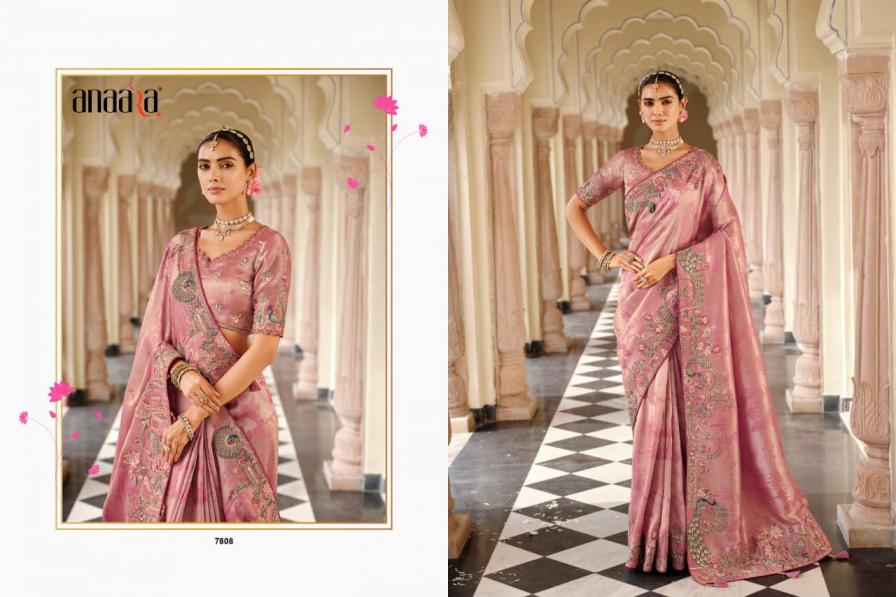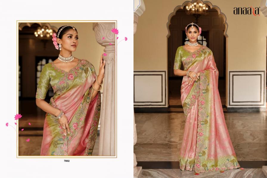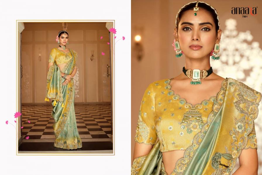 Brand - Tathastu Catalog Name -Anaara-7800 Series Series :- 7801 To 7812 & Colours Rate : Attached+5% Gst Fabric: Soft Silk with Beutifull Zari weaving,Heavy Embroidery & khatli work Blouse: Silk With Heavy Work Occasion: Party Wear, Festival Wear,Wedding Wear |