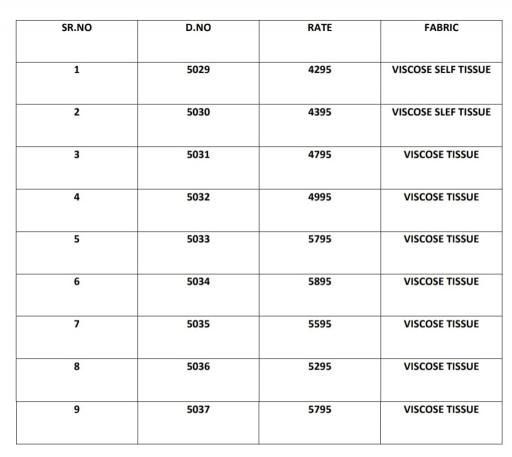 Brand : Tatvam Fashion LLP Catalog Name :- Tatvam Series : 5029 to 5037 Fabric Details :- Attached List Rate : List Attached +5 %GST Premium Festival Collection Pls Note : -5030 Not Available |