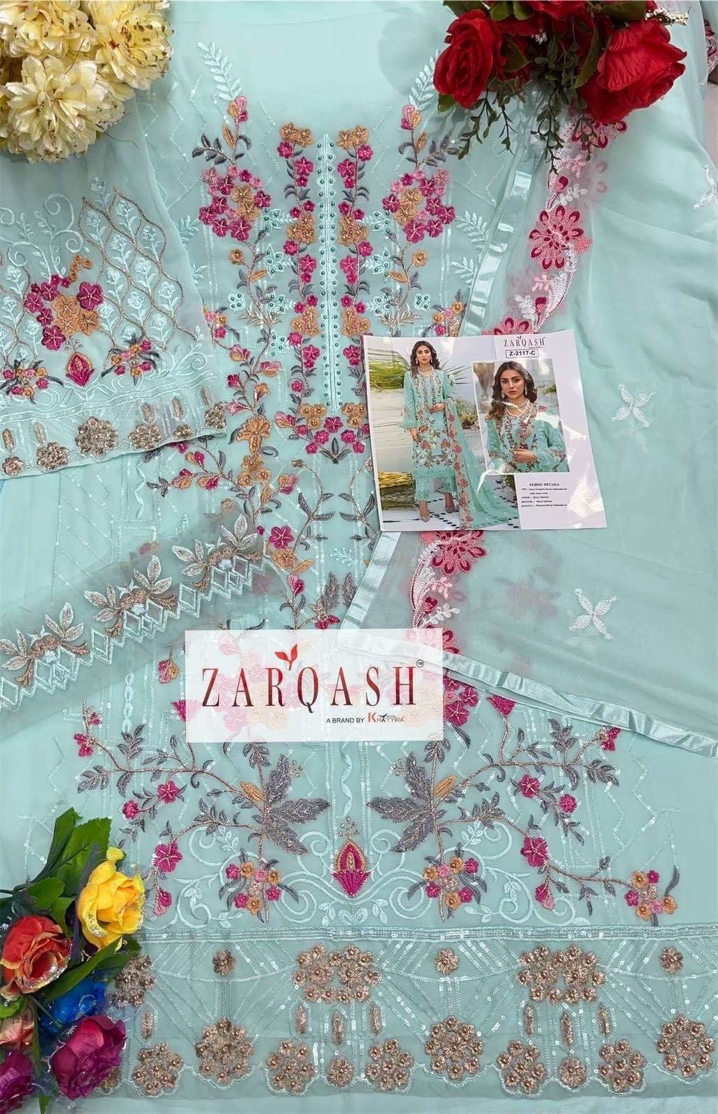 ZARQASH ™️ Catalog :- TAZIM D. No :- Z-2117 TOP - FOX Georgette HEAVY EMBROIDERERY WITH PERAL WORK UNSTITCH INNER BOTTOM - HEAVY SANTOON With bottom Patch DUPATTA - Nazneen HEAVY EMBROIDERED WITH Foreside Less 4 PCS IN SET RATE - 1199 ₹ PER PCS + GST DELIVERY - Today * |