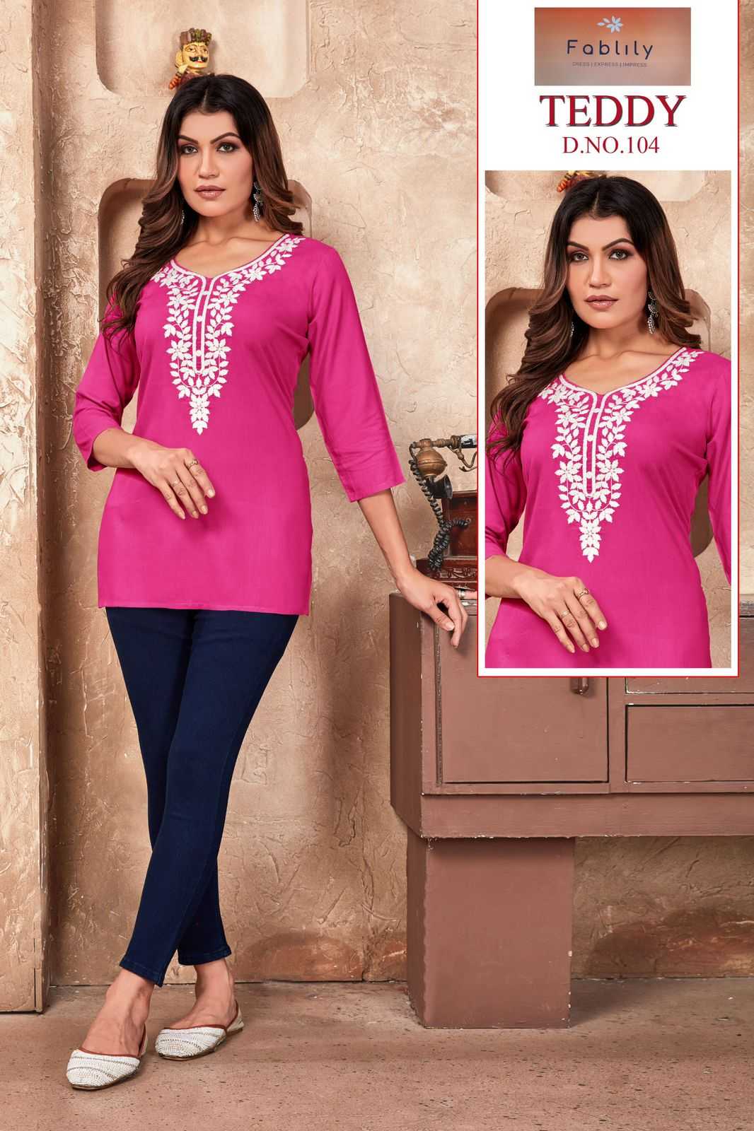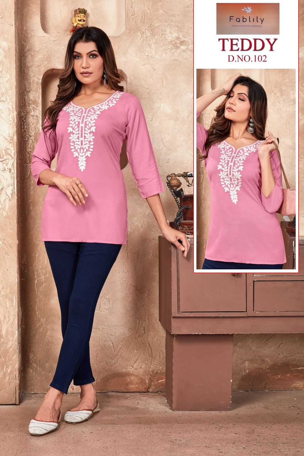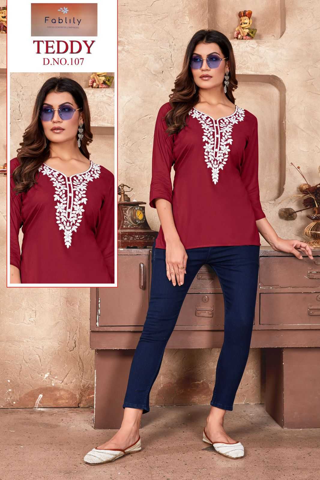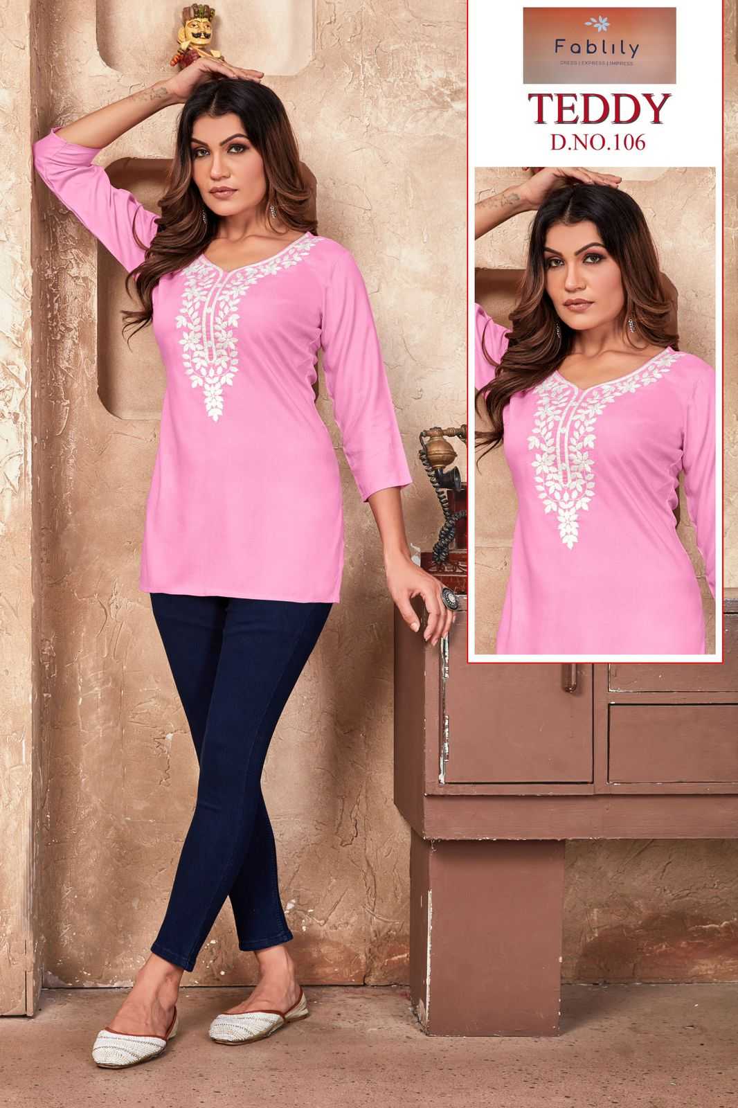 teddy by fablily classy outfit look rayon embroidery neck work full stitch girls top