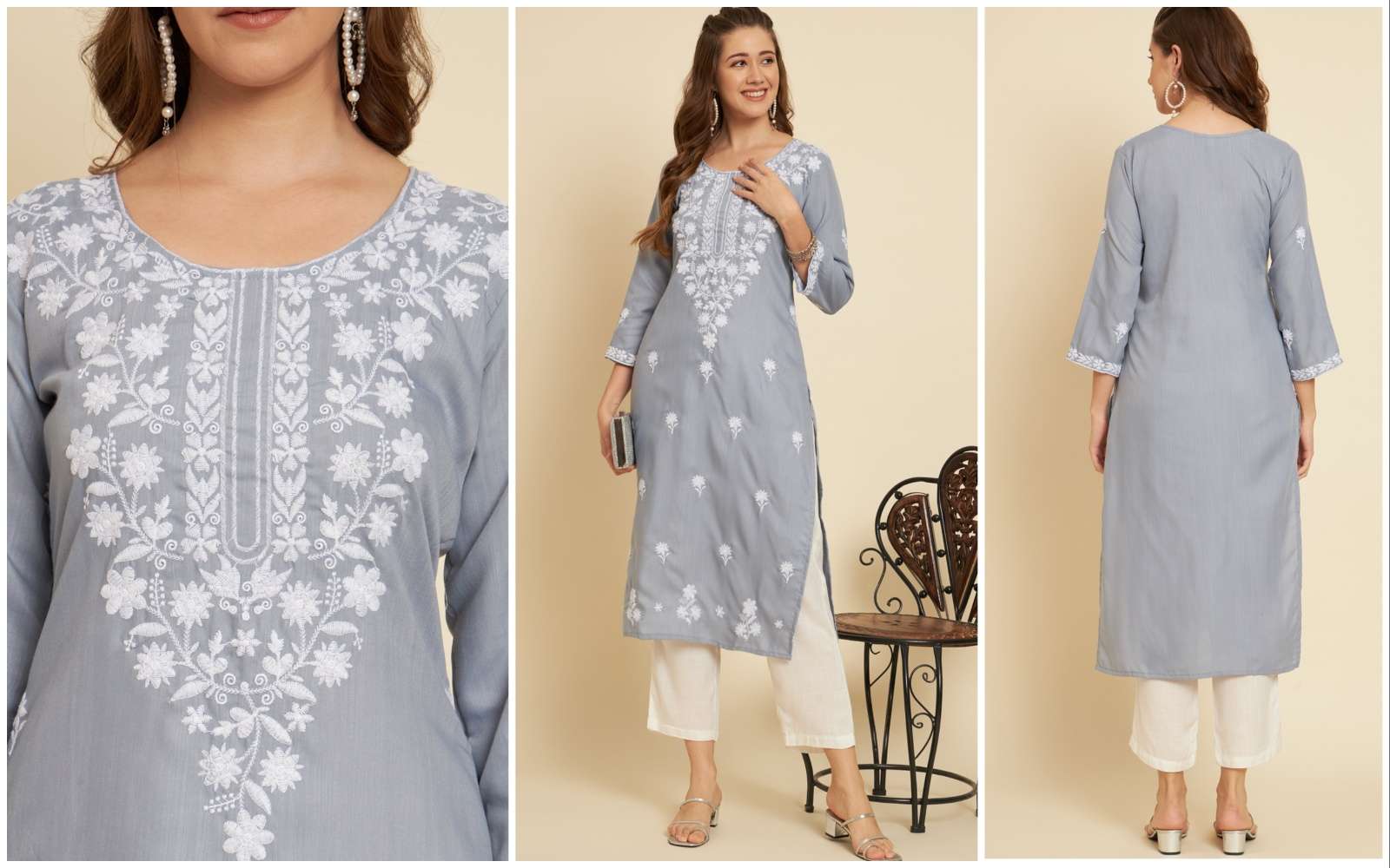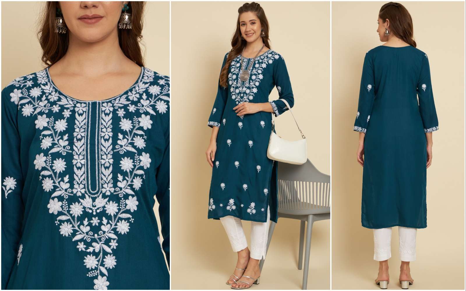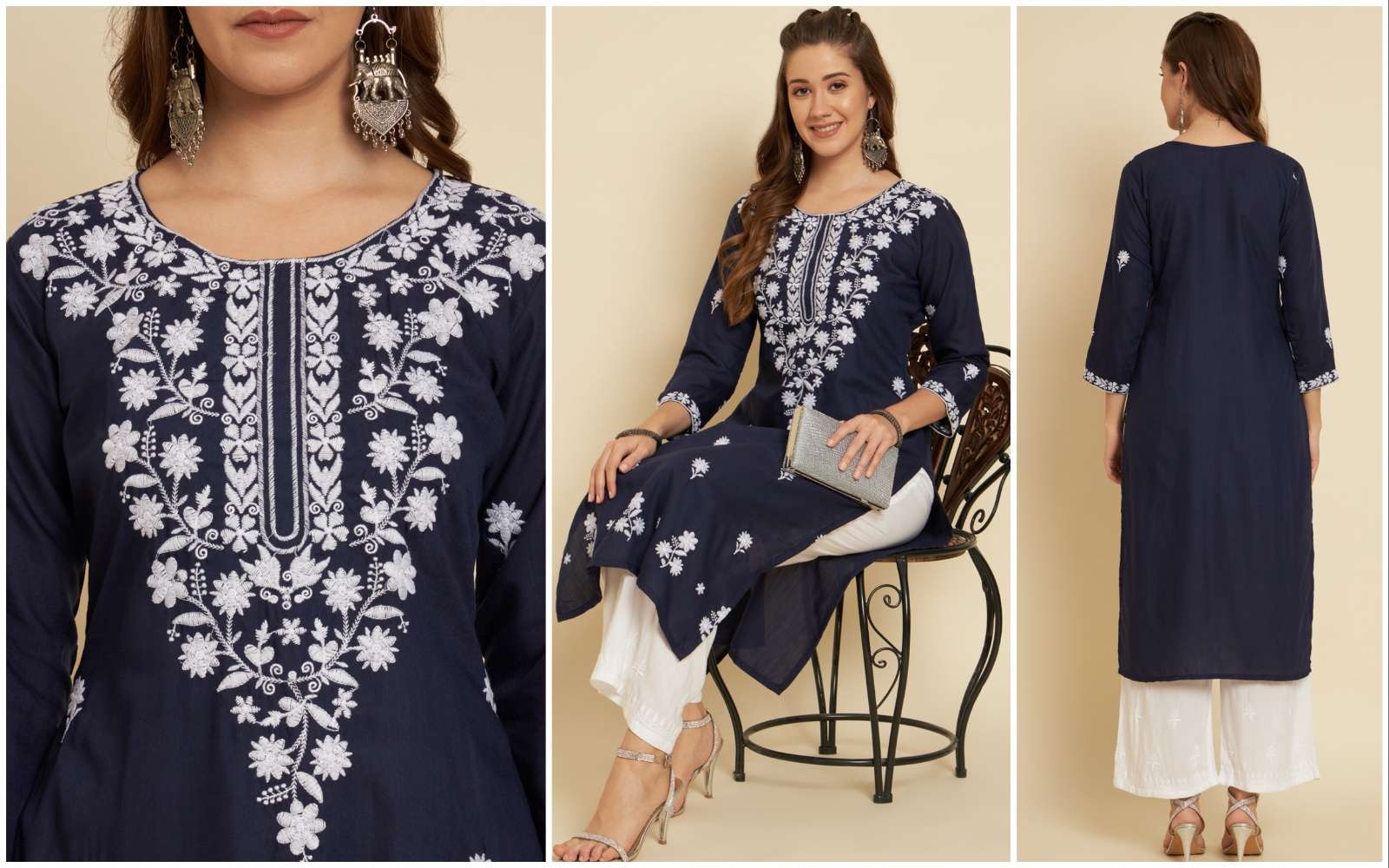 Tesla Soft Slub Cotton Kurta with Embroidery Work Straight Shape Three Quarter Sleeves Round Neck Lucknowi chickankari work |