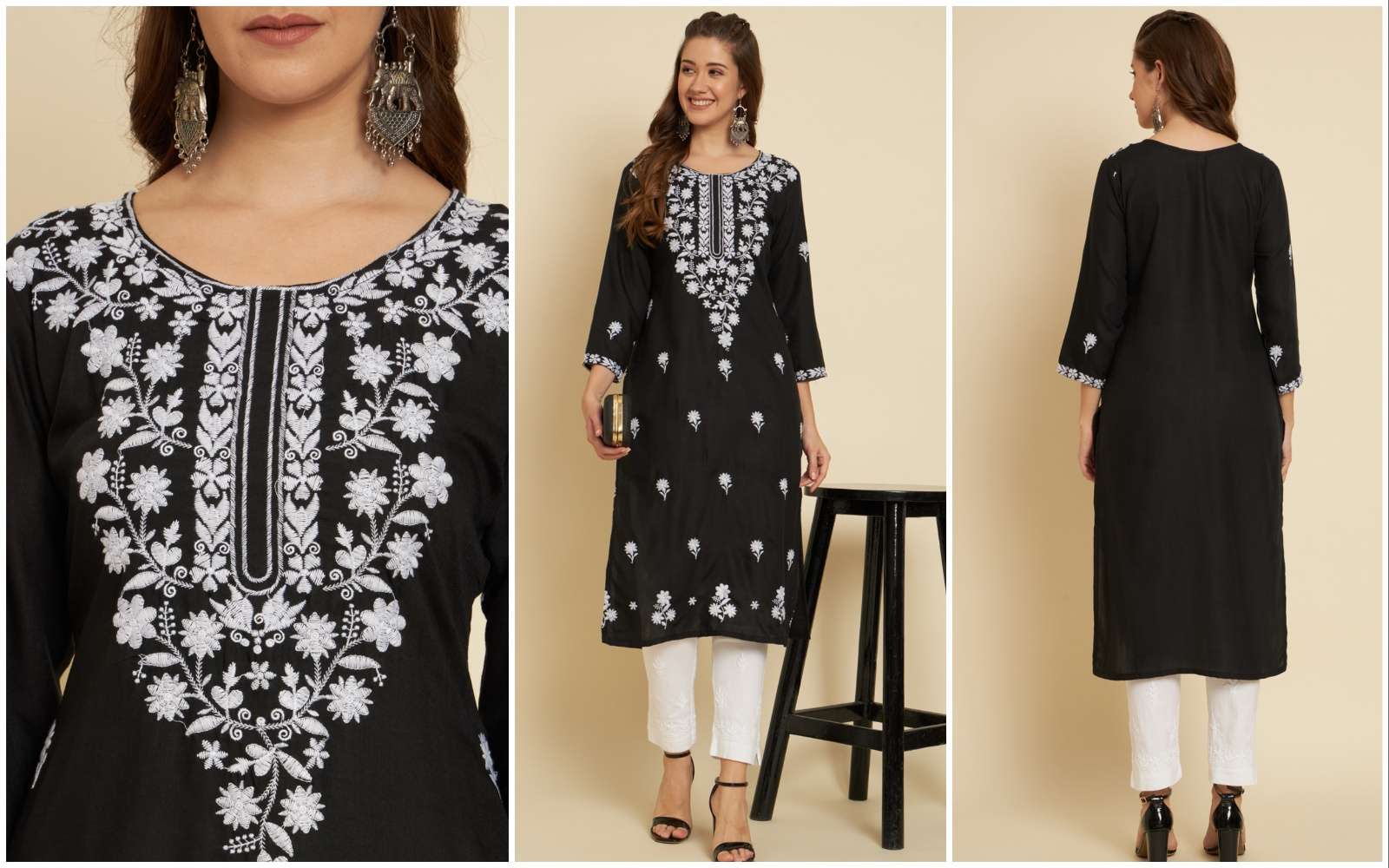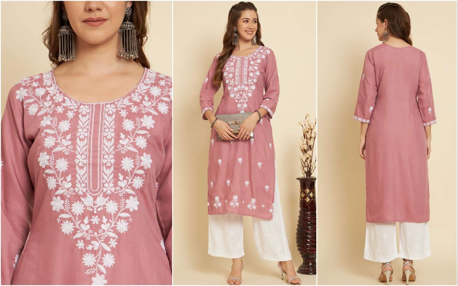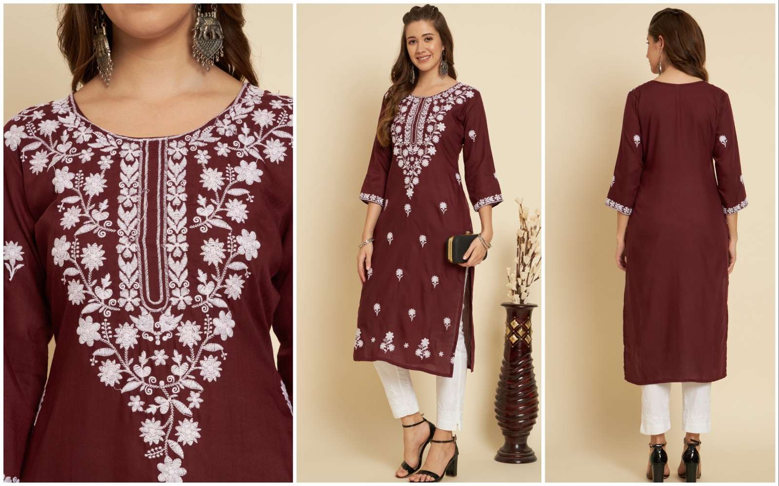 Tesla Soft Slub Cotton Kurta with Embroidery Work Straight Shape Three Quarter Sleeves Round Neck Lucknowi chickankari work |
