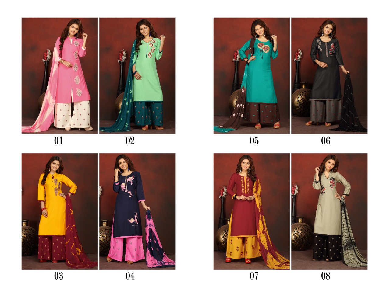 Presenting 3 Piece Set Kurti With Plazo Work & Dupatta... Name :- kiyara Description-: Heavy Reyon Plain Top With Embroidery Work ,Heavy Reyon Plain Plazzo With Embroidery Work & Nazneen Shibori Deyed Dupatta Size:- L XL XXL Rate-: 665/- |