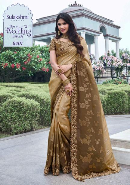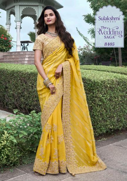 This Pure tissue silk saree drapes elegantly, creating a flowing silhouette that accentuates the beauty of the wearer. With its regal presence and intricate craftsmanship, this saree is sure to turn heads and steal hearts. Brand : Sulakhmi Catalog Name : The Wedding Saga Colours Saree Fabric : Pure Tissue Silk Fabric With Embroidery, Stone, Pearl, Real Mirror Work On Border With Zari Weaving Across The all Over Saree Blouse Fabric : Silk With Work Rate : List Attached +5% Gst Occasion : Wedding Wear, Ceremonial, Party Wear |