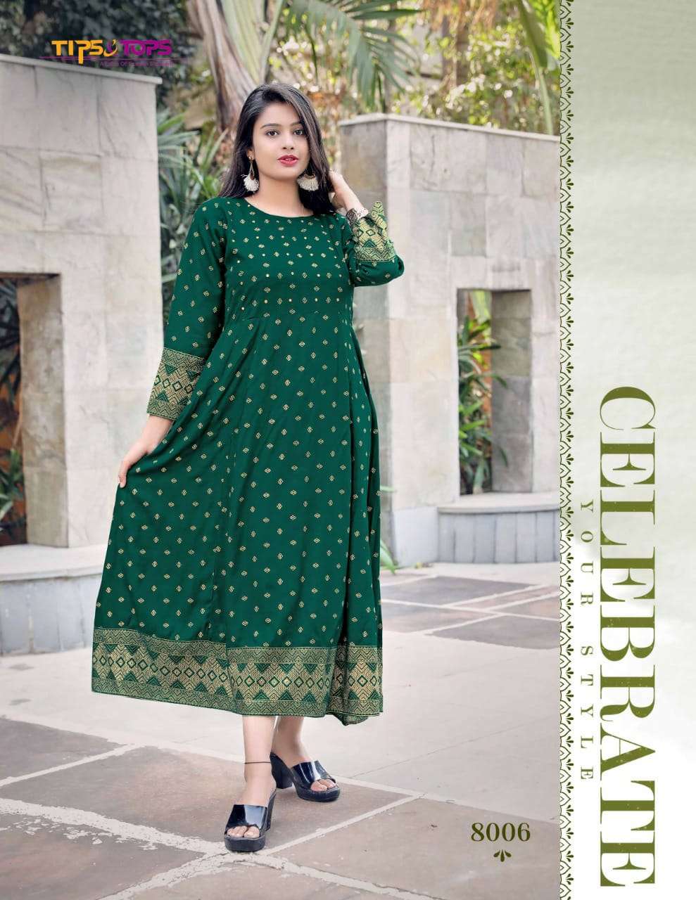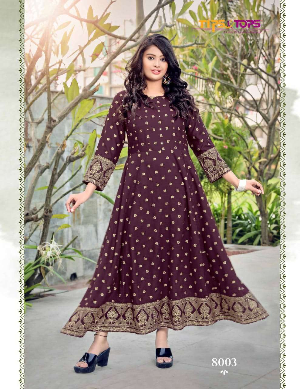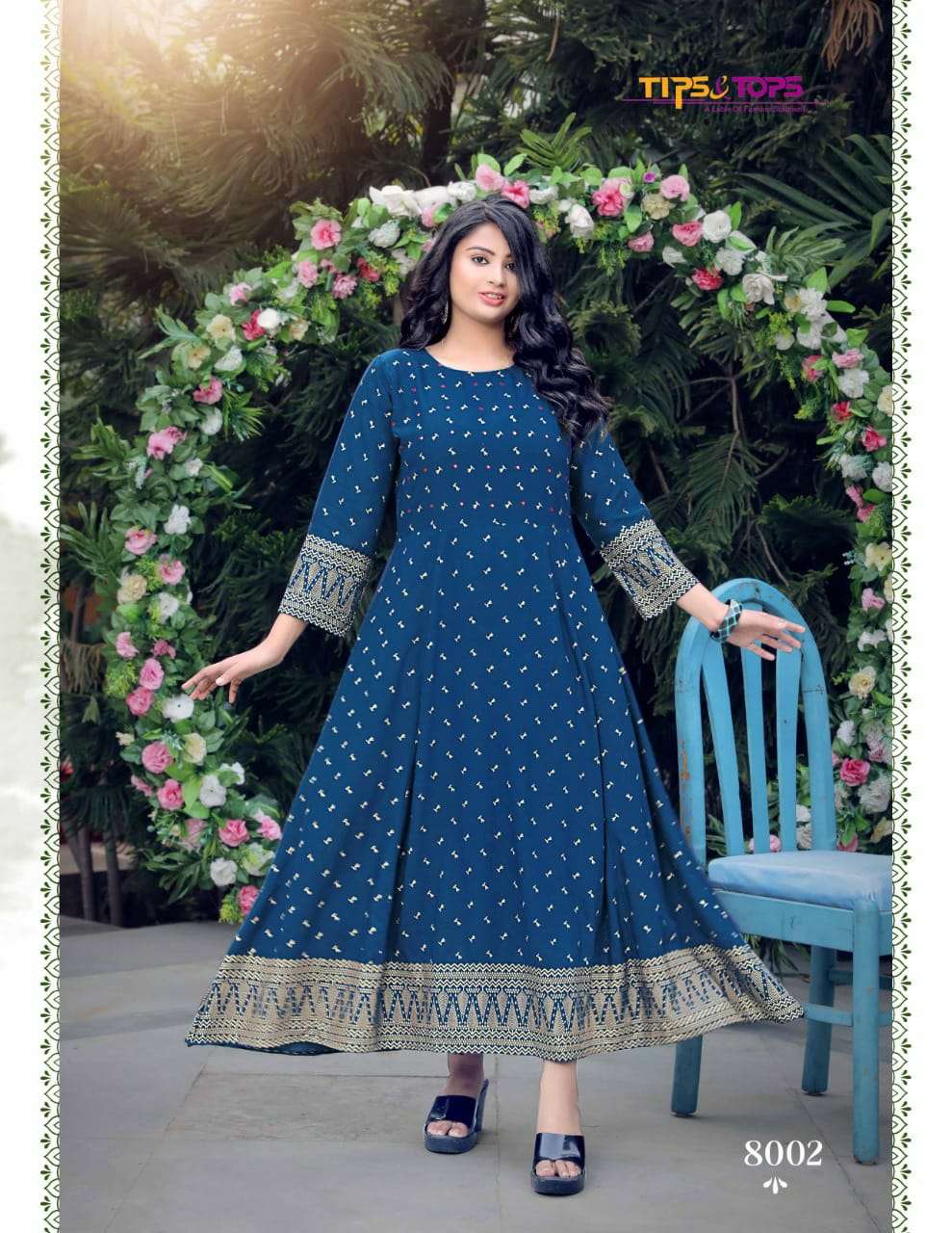 TIPS & TOPS Catalouge Name : 💃 MONALISA Vol 08 💃 Fancy Gowns kum Kurtis Fabrics : Heavy Reyon Slub Foil Print 14kg Rate : *535/- per pcs * + GST 5% TIPS & TOPS 😊 |