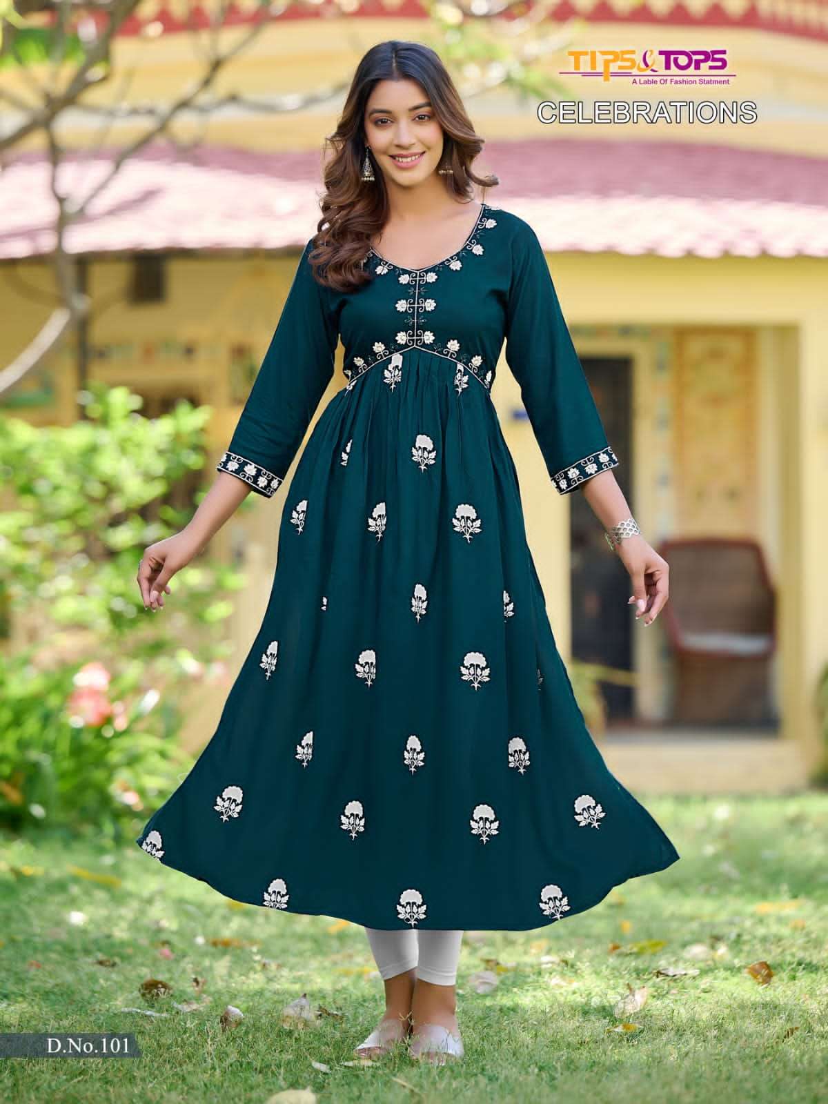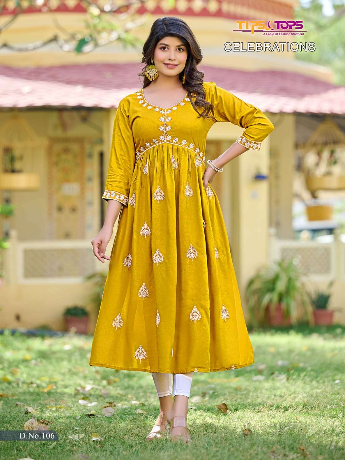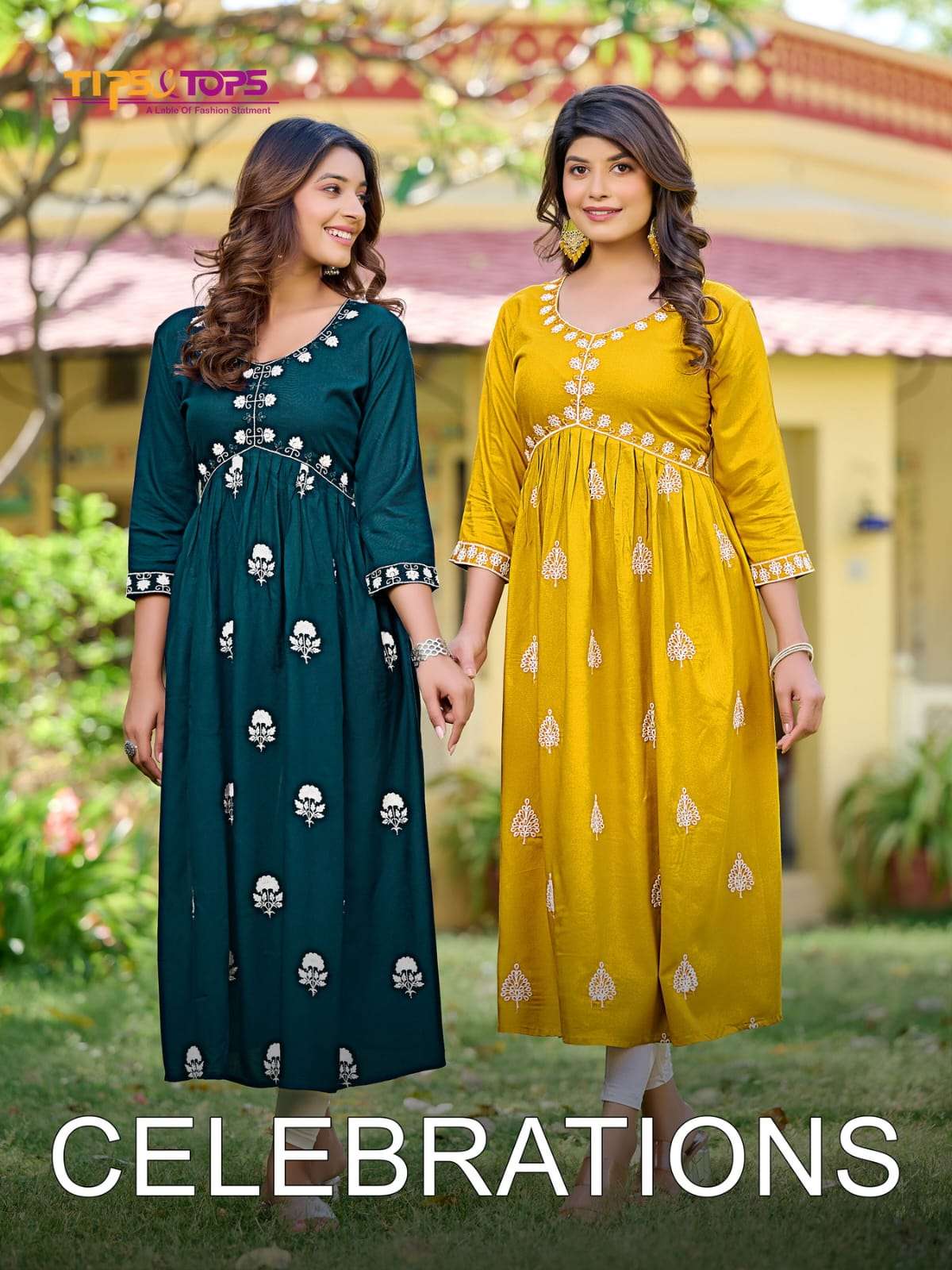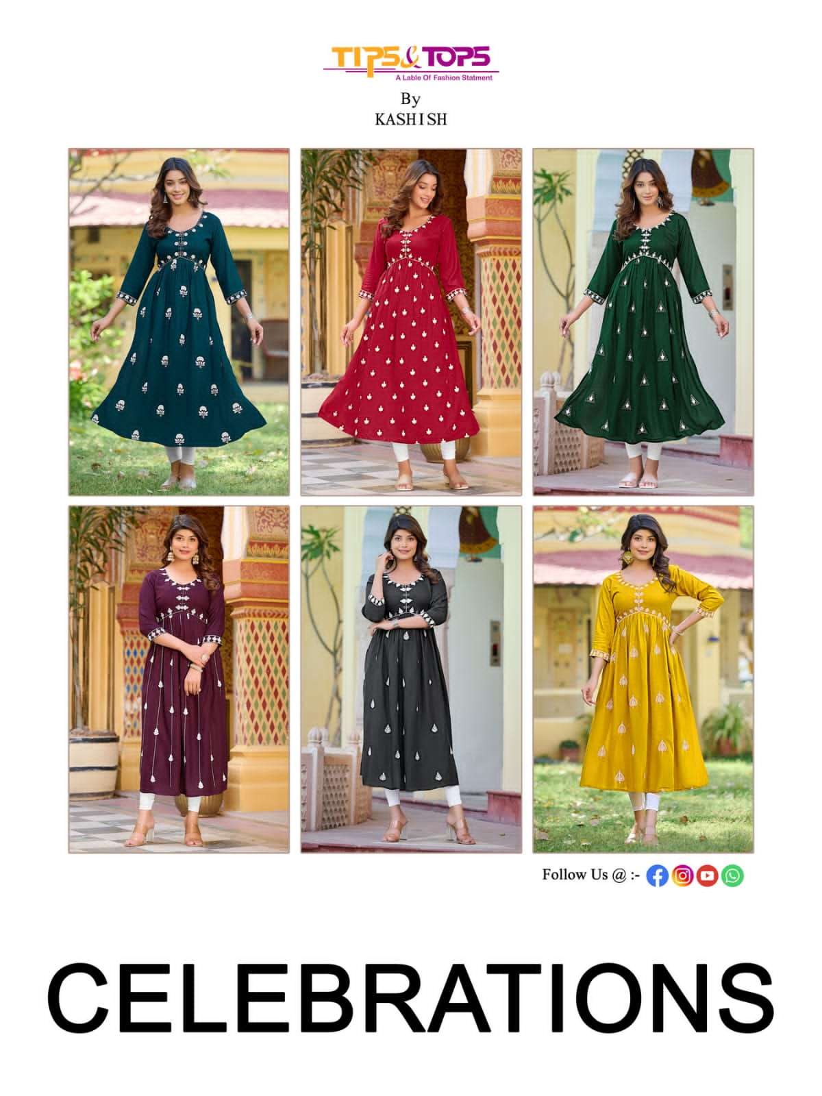 Namaste 👏🏻👏🏻 TIPS & TOPS Name : 💃 CELEBRATIONS 💃 Fancy ALIA Style Kurtis Fabrics : Heavy Reyon 14kg Rate : 545 + GST 5% TIPS & TOPS 😊 |