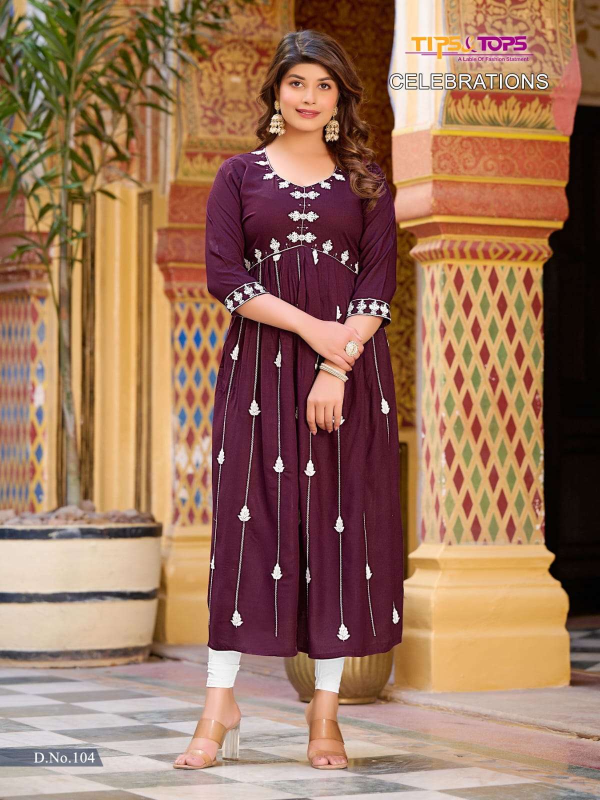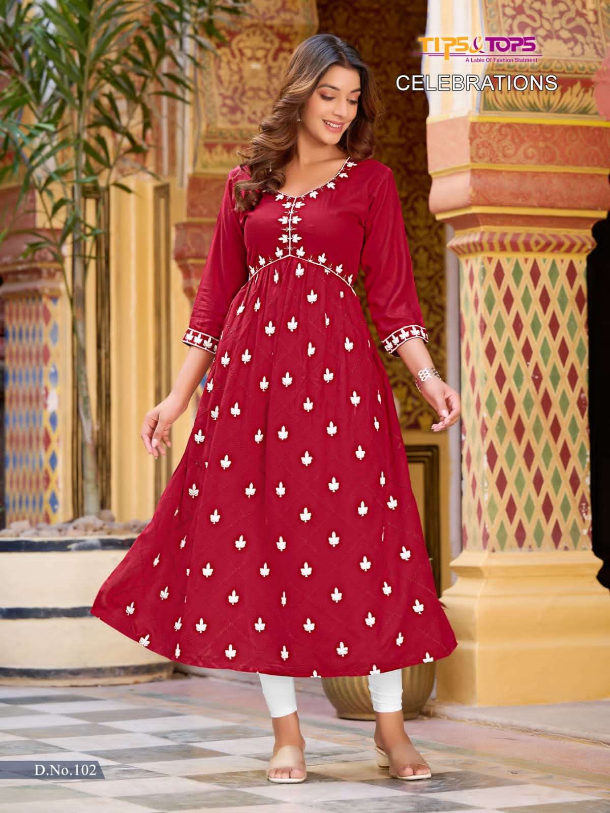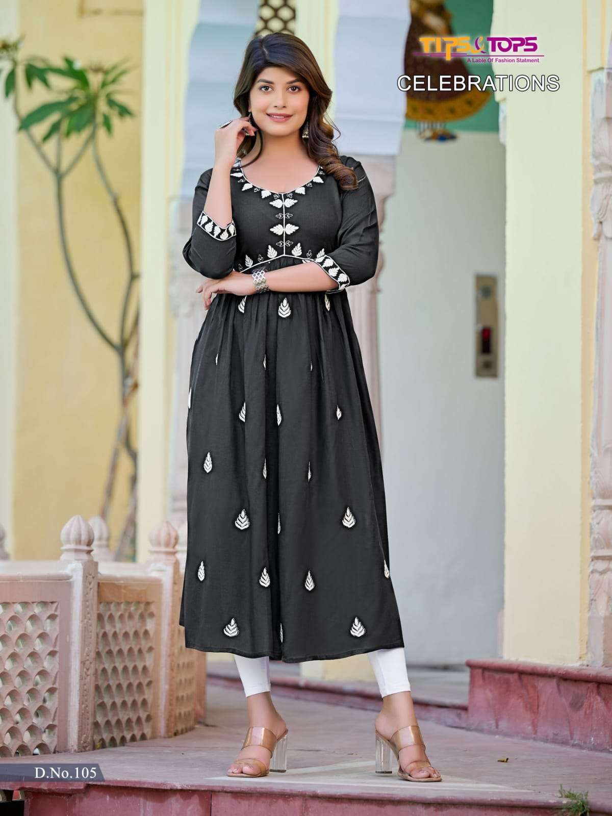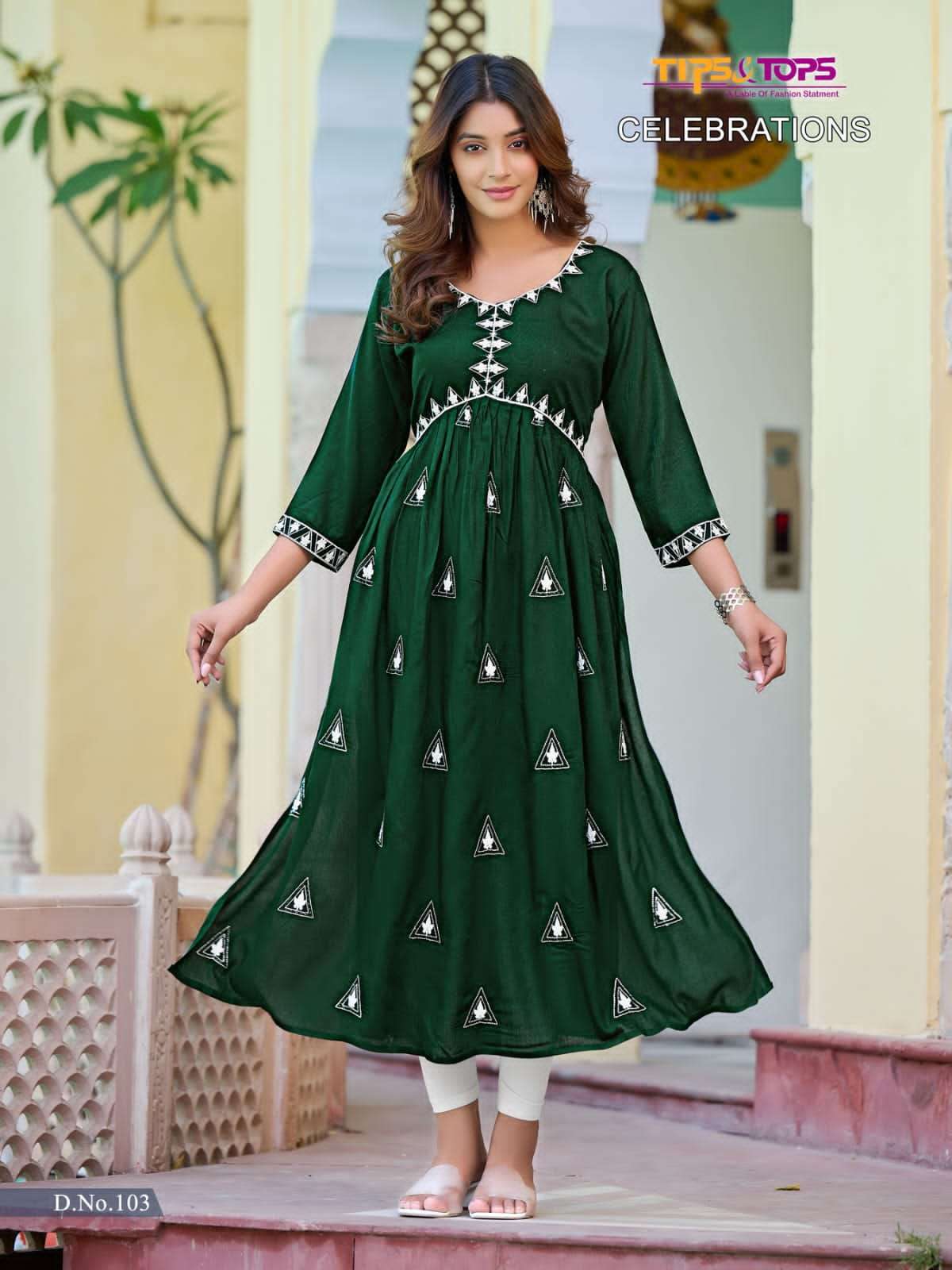 Namaste 👏🏻👏🏻 TIPS & TOPS Name : 💃 CELEBRATIONS 💃 Fancy ALIA Style Kurtis Fabrics : Heavy Reyon 14kg Rate : 545 + GST 5% TIPS & TOPS 😊 |