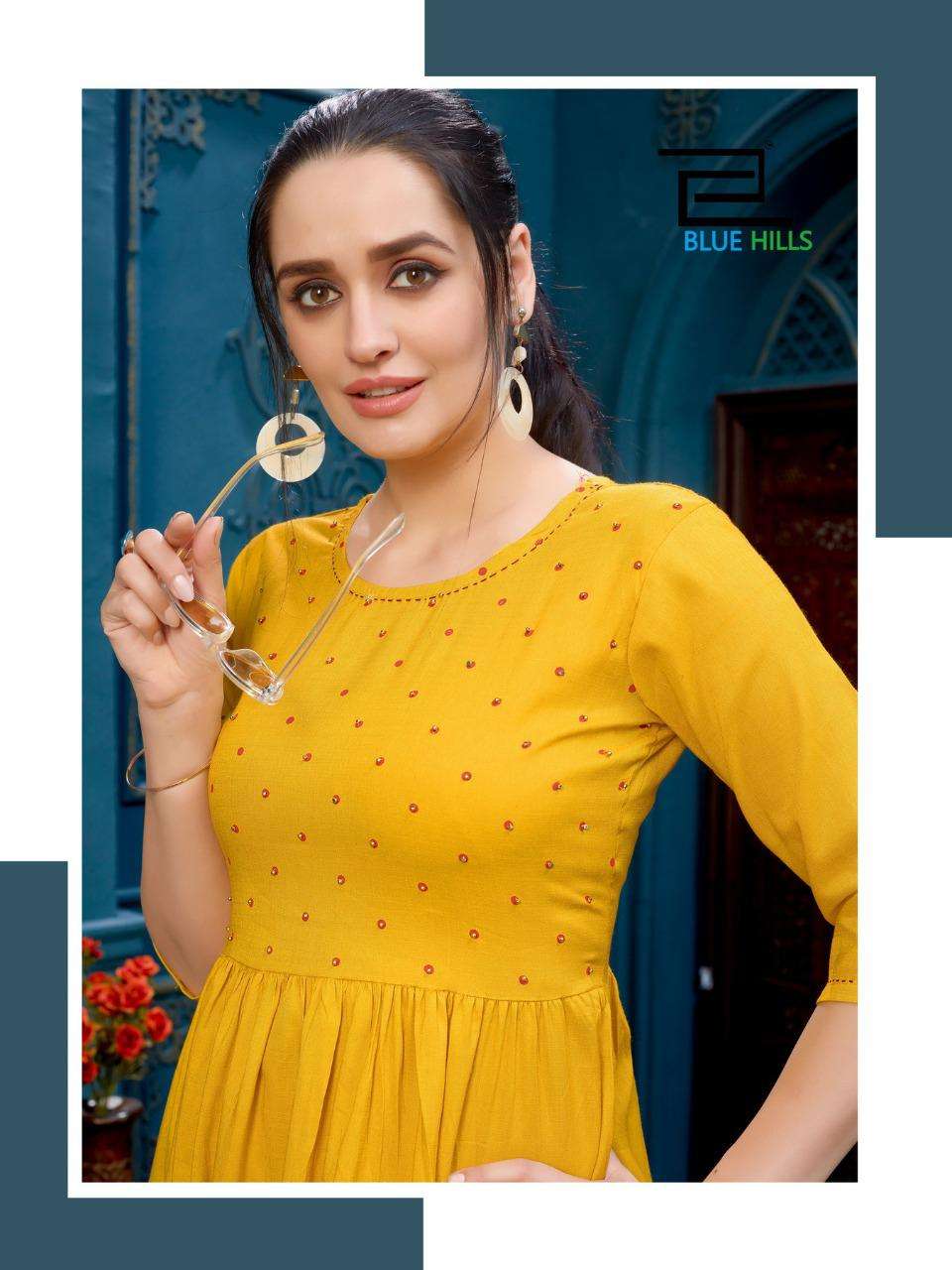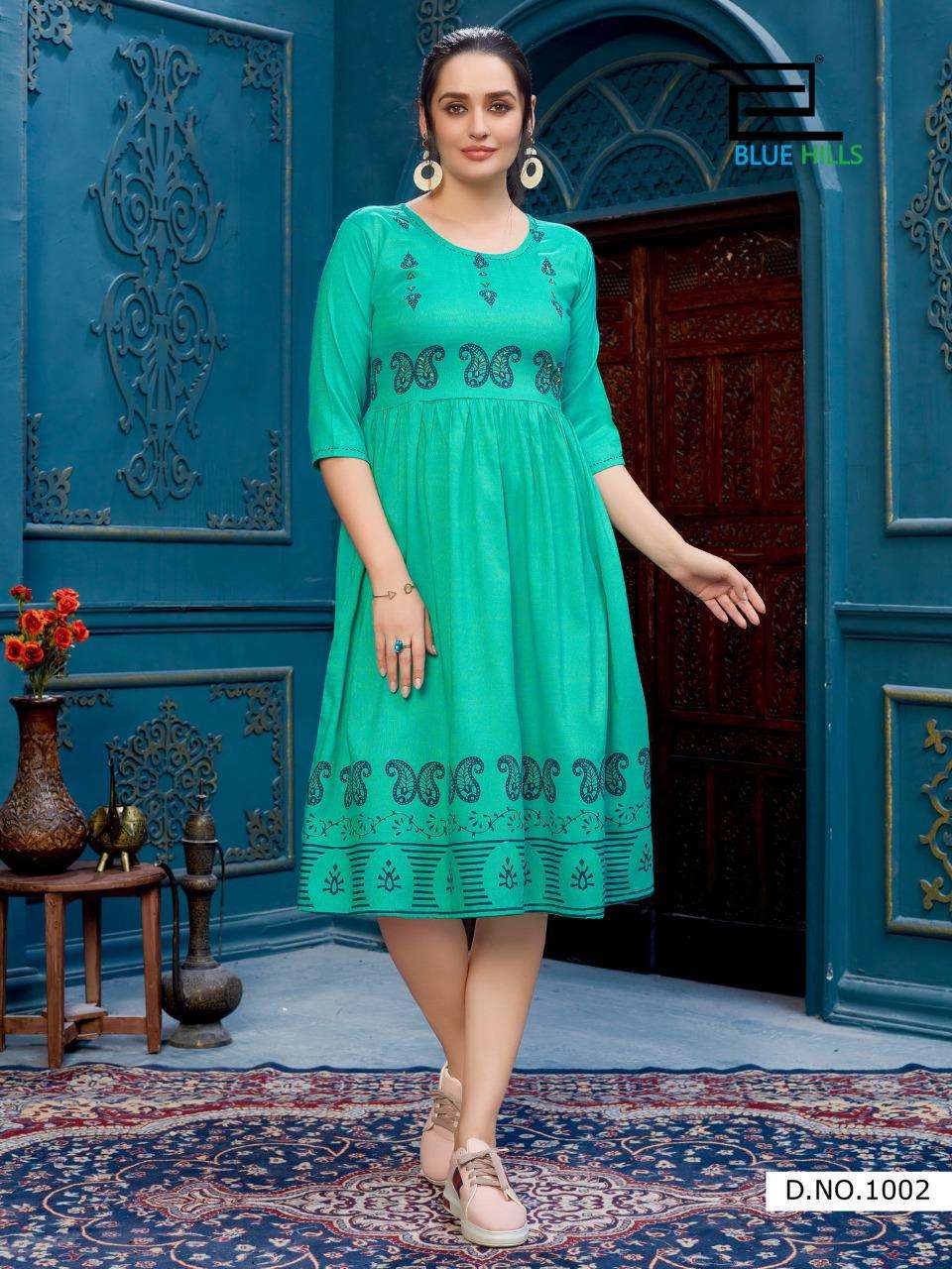 Brand name - BLUE HILLS Catalogue name - TREND VOL 10 Fabric : HEAVY RAYON TWO TONE Size:- *M (38 )L(40) XL( 42" ) XXL( 44" )3XL(46) Concept:- frill with foil print with khatha work