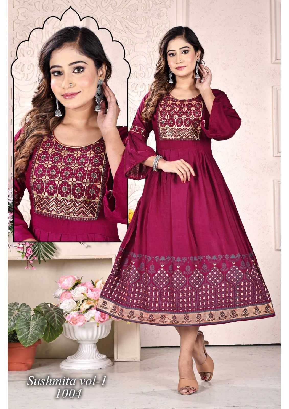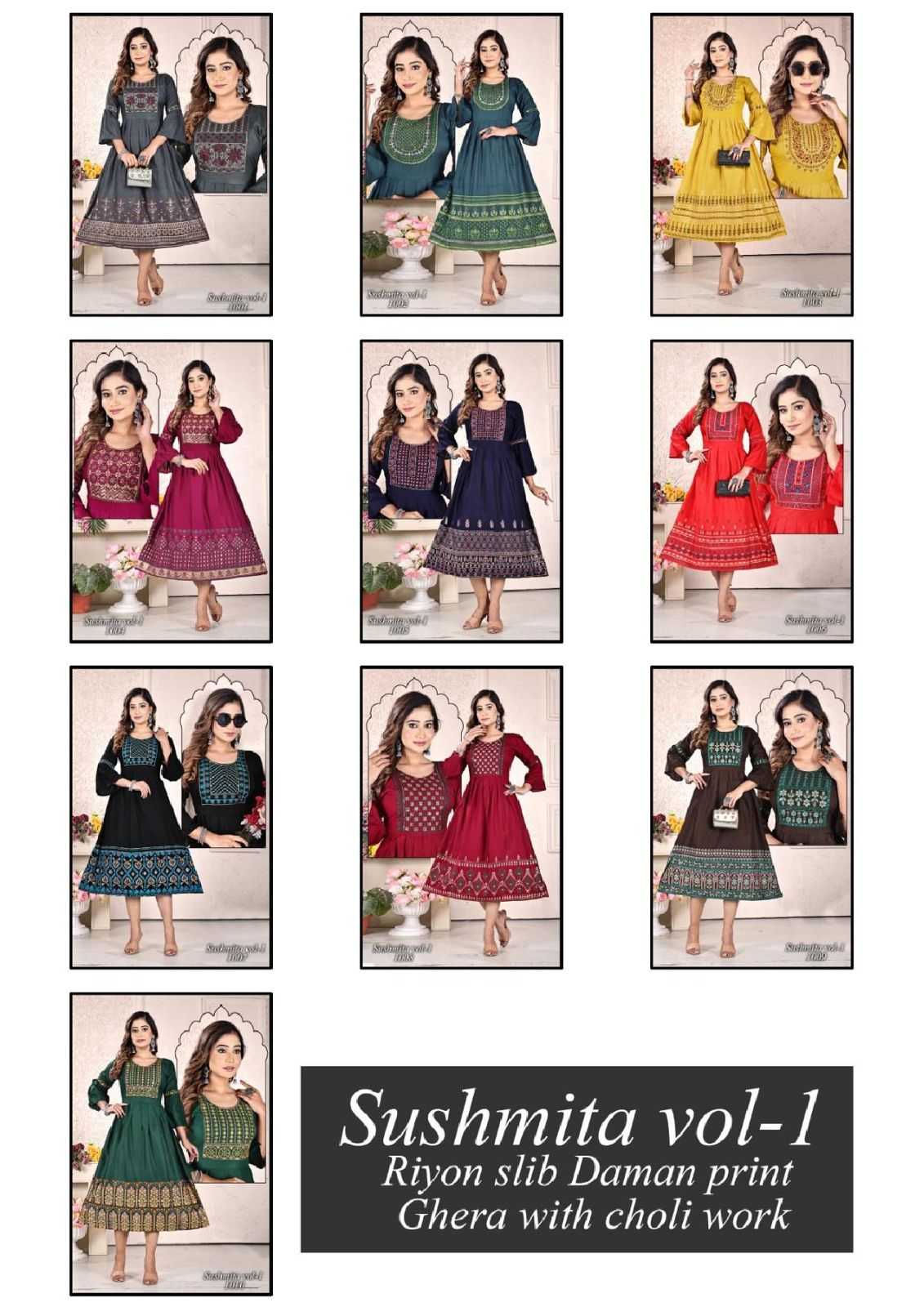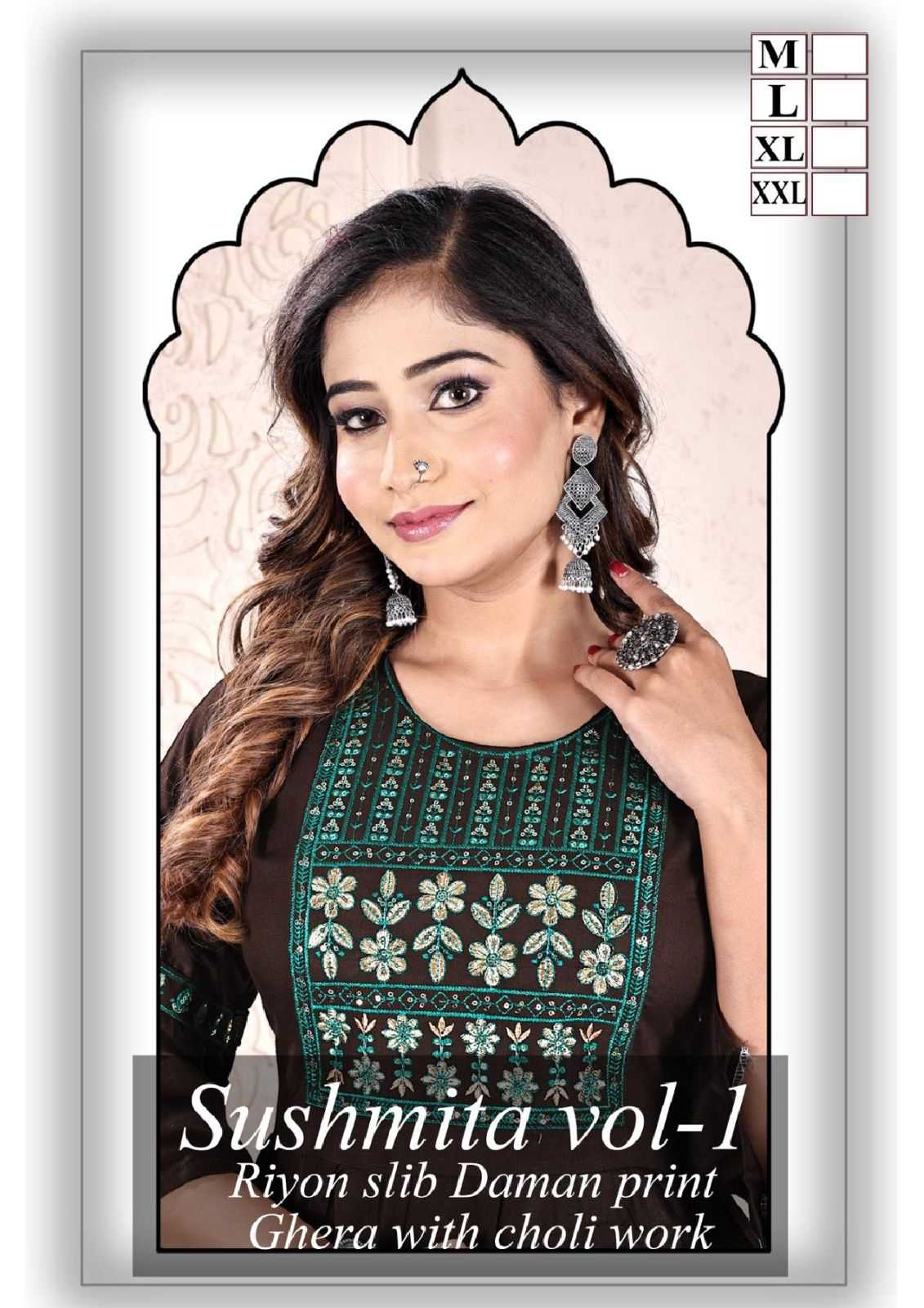 TRENDY SUSHMITA VOL.1 RAYON SLIB DAMAN PRINT GHERA WITH CHOLI WORK