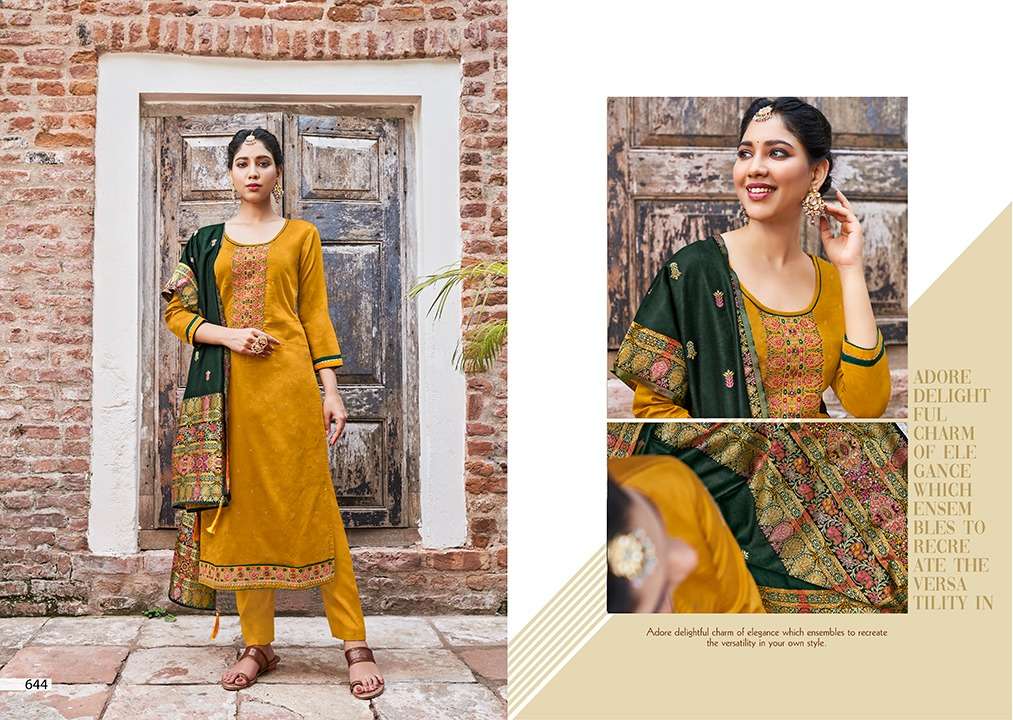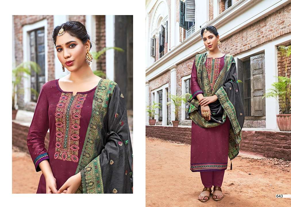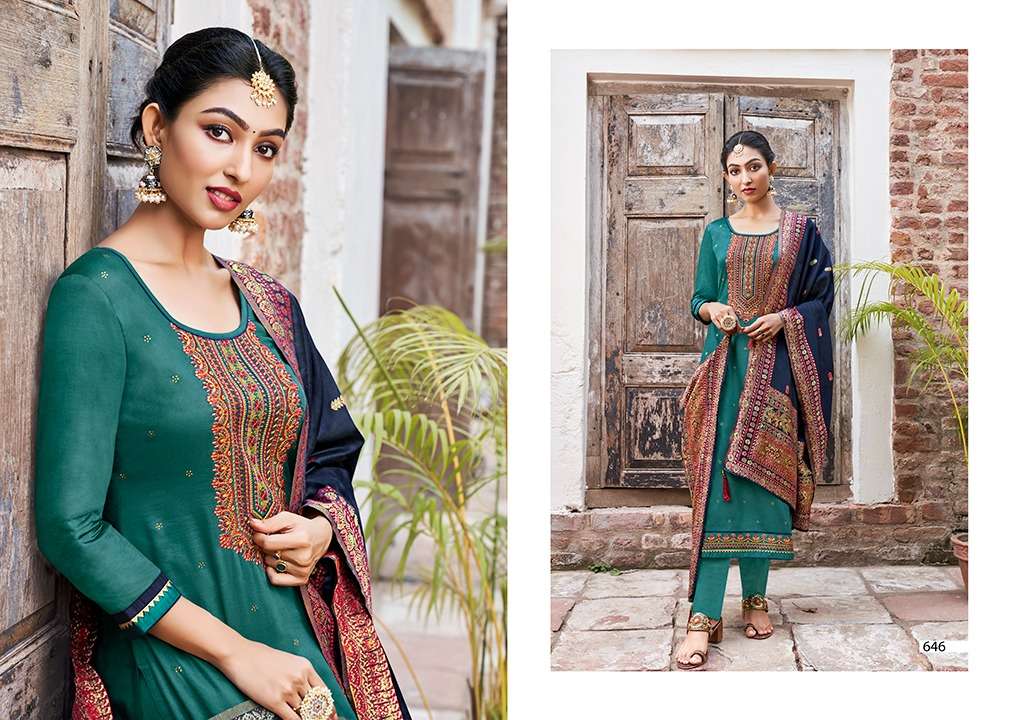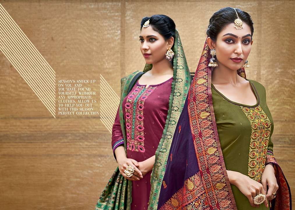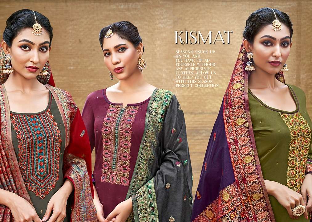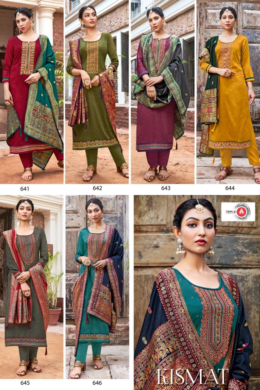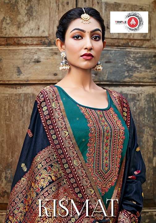 Triple AAA  has launched  Catalog Name:  KISMAT. Fabric Details Top:-  jaam silk embroidery  with swarvoski dimond Work Bottom:- cotton solid Dupatta:- cotton silk jeqard mina work Total Design:- 6  Rate ......949/ Dispatching 5 to 6 days later |