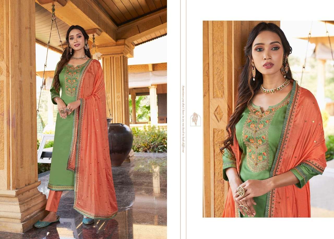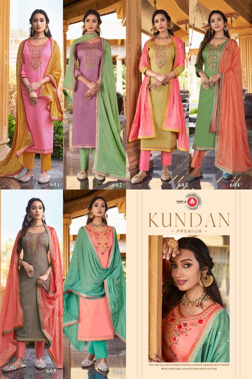 Triple AAA  has launched  Catalog Name:  KUNDAN...PREMIUM.. Fabric Details Top:-  Jam Silk with Embroidery Work Bottom:- cotton solid Dupatta:- Chinon 7 Mm seq  work  with Four Side less Total Design:- 6  Rate ......799 |
