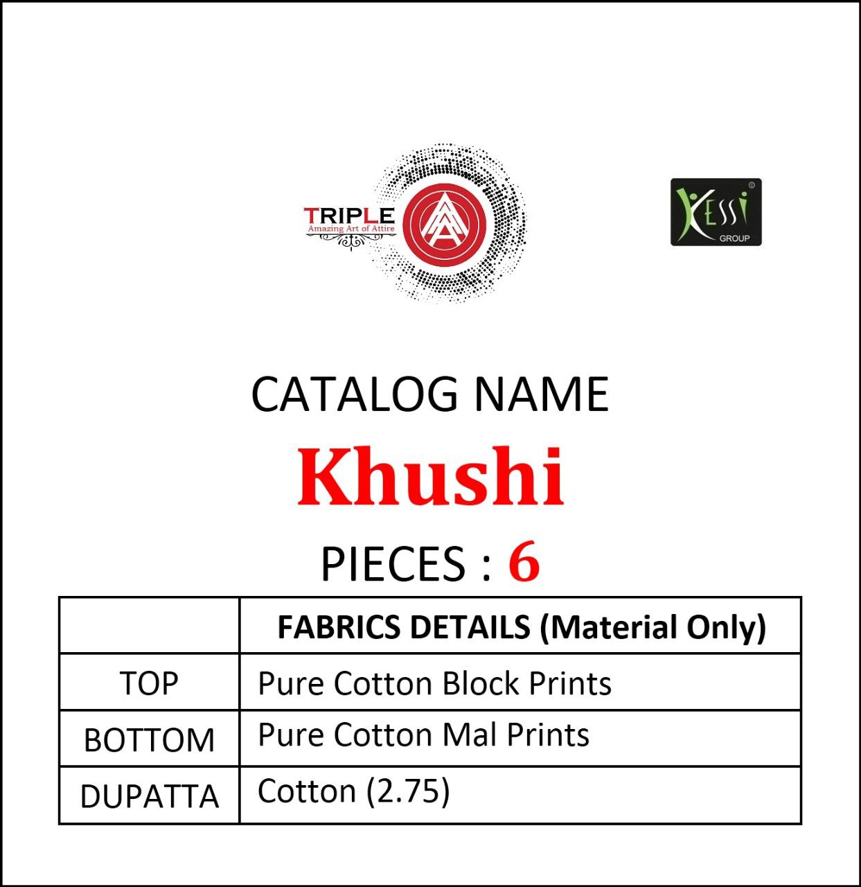 Triple AAA has launched Catalog name: Khushi Fabric Details âªTop:- Pure Cotton Block Prints âªBottom:- Pure Cotton Mal Prints âªDupatta:- Cotton (2.75) âªTotal Design:- 6 Rate - 550 per Pcs Set to set . GST 5 Percent Extra â°Dispatching 3 to 4 days later |