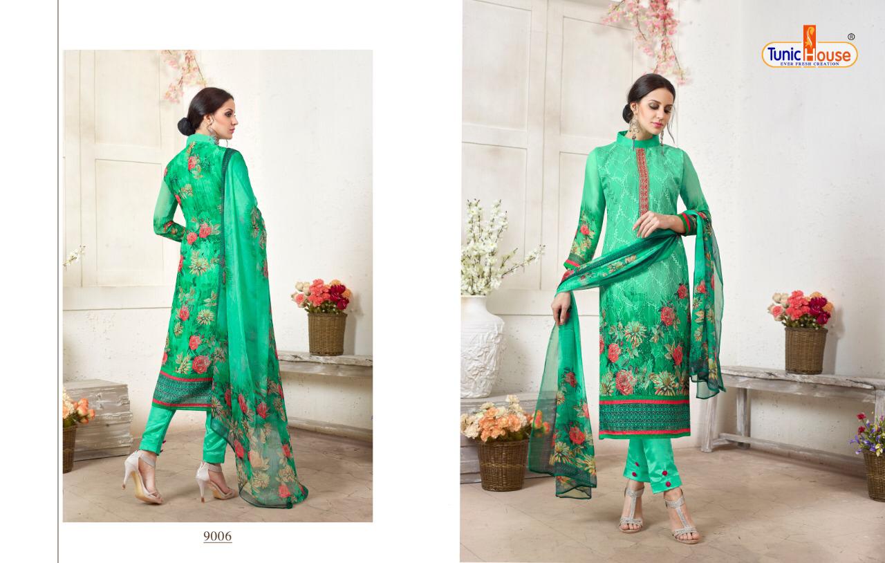 Hello Sir / Madam For shopping this * *FESTIVAL Presenting our latest collection "ROSE" 8 beautiful Dresses In catalogue.... *Tunic house * always rock & Having always limited stock So please hurry up Book ur order now..... Thanks for ur kind support *ROSE’     Fabric details .                 Top : Pure geourgette Attractive Embriodery with dizital print (CUT: 2.50 APX ) Inner &bottam:santon Dupp: pure siffon dizital print ( CUT : 2.25 APX ) Designs : 8 Price : 1350+gst |