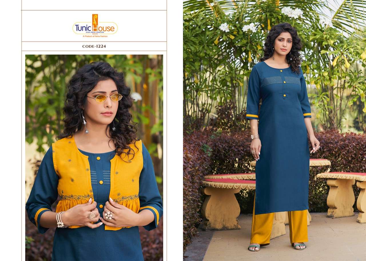 TUNIC HOUSE  Lunches Our New Catalog      Jacket with Kurti  NUTAN -JACKET TOP. :-  SLUBY COTTAN with EMBROIDERY JACKET.  :-  SLUBY COTTON with Fully EMBROIDERY SIZE  :-  M  L  XL  XXL  3XL RATE :-   425.00 Gst 5% Extra DESIGN. :-  6 Set To Set DISPATCH :-  READY TO SHIP |