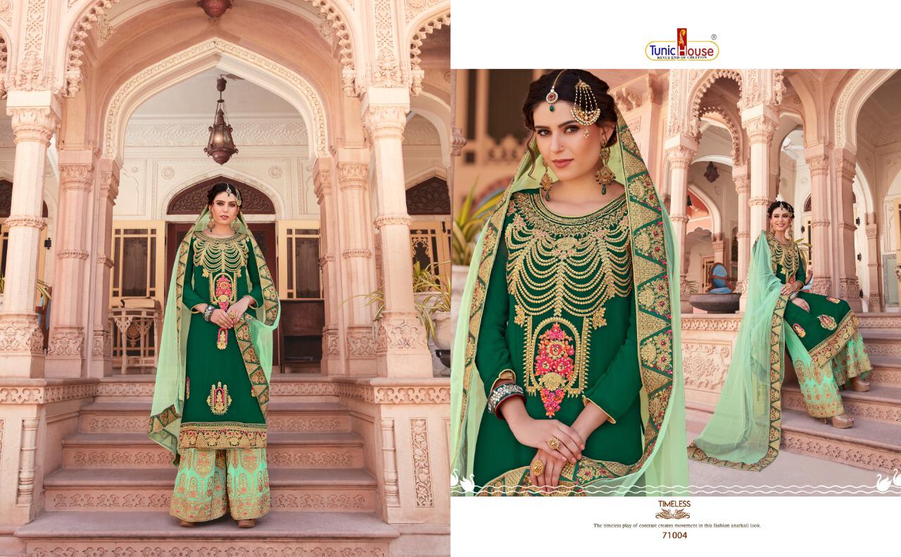 TUNIC HOUSE... âÂÂpresentsâ âÂÂSHEHNAIâ Exclusive bridal collection season as well as marriage function.so we are hear to change your wardrobe with elegance colour to enjoy the function. Top: Heavy satin georgette Fancy Embroidery with hand work and inner (2.50 mtr apx) Dupatta: Net with four side lace with Daimond work . (2.25mtrs apx) Bottom :georgette sarara work stitch with innar Pcs: 4 Rate :1955 (Applicable GST extra). Team tunic house |