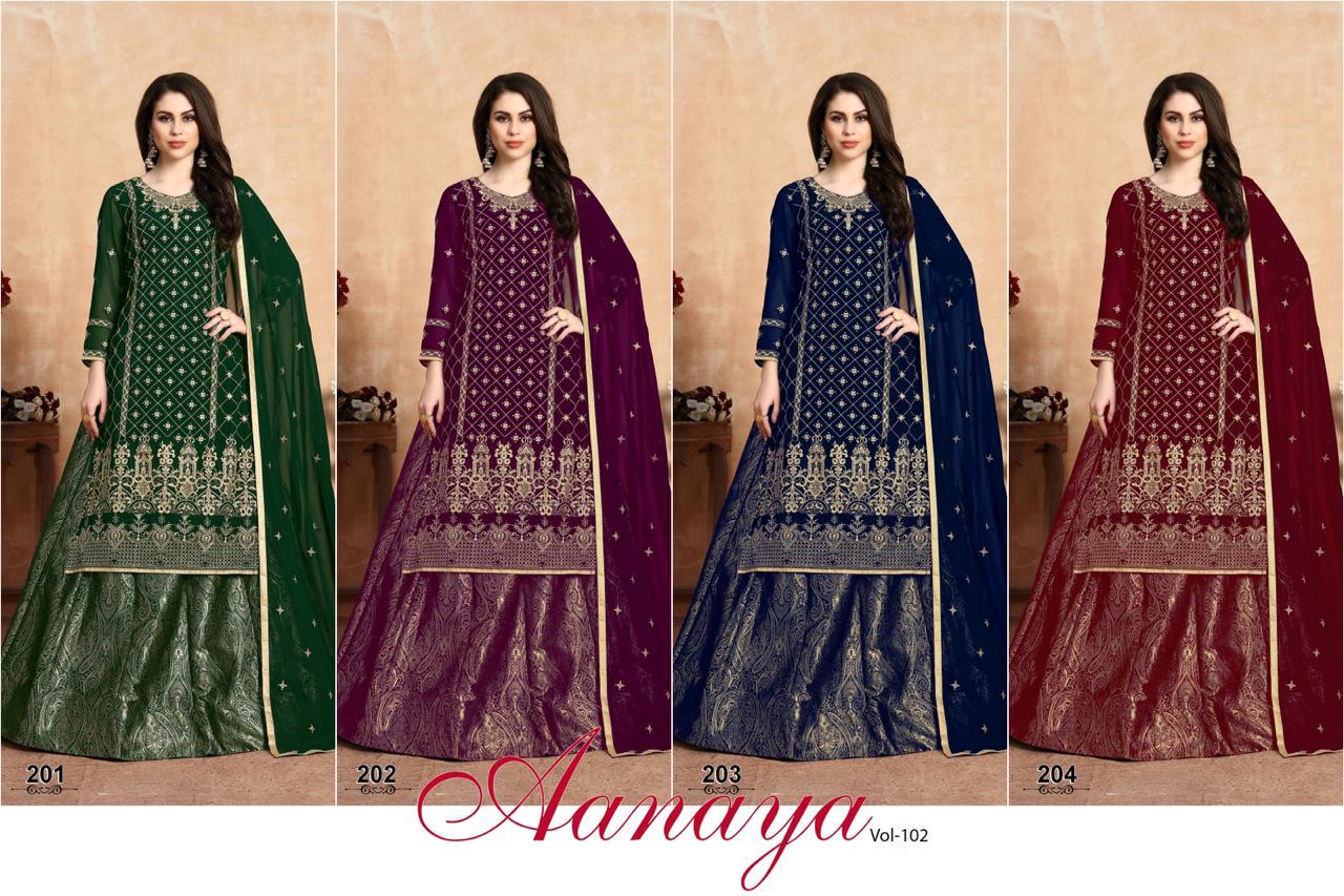 Dear sir, We are launching our most proffered catalog AANAYA 200 SERIES (vol-102) Top. –georgette Bottom- jaccard with santool Dupatta –georgette Price :-1695/- GST 5 Percent Extra. Dispatch from 24/02/2020 GST 5 Percent Extra This design can stich upto 48 " size |